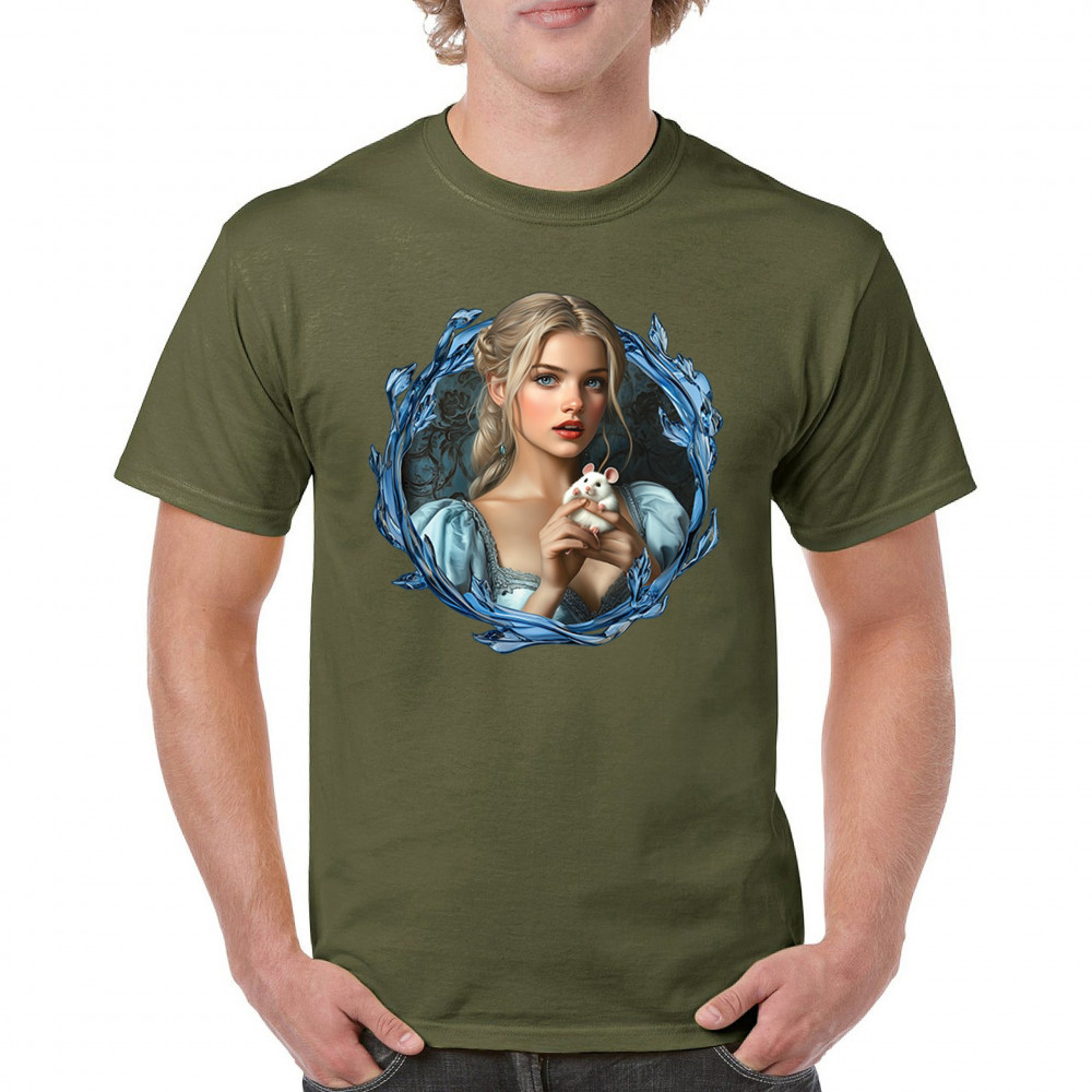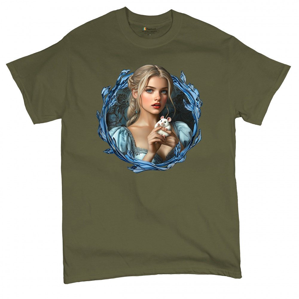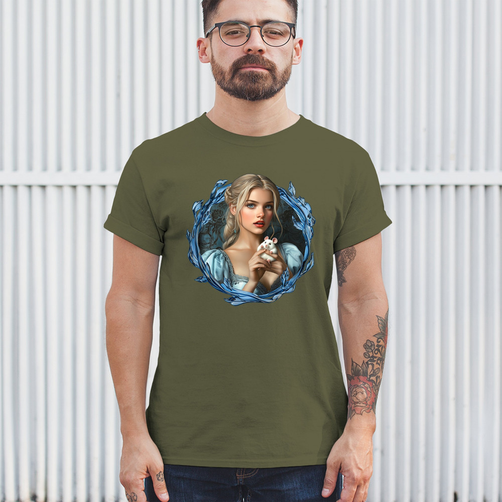 A whimsical design inspired by fairytales and Cinderella magic, featuring a blonde girl in a blue dress holding a white mouse. The icy blue leaf frame evokes enchantment and transformation. With soft, vintage tones and a dreamy feel, it’s a charming tribute to kindness, fantasy, animal companionship, and gentle storytelling magic.