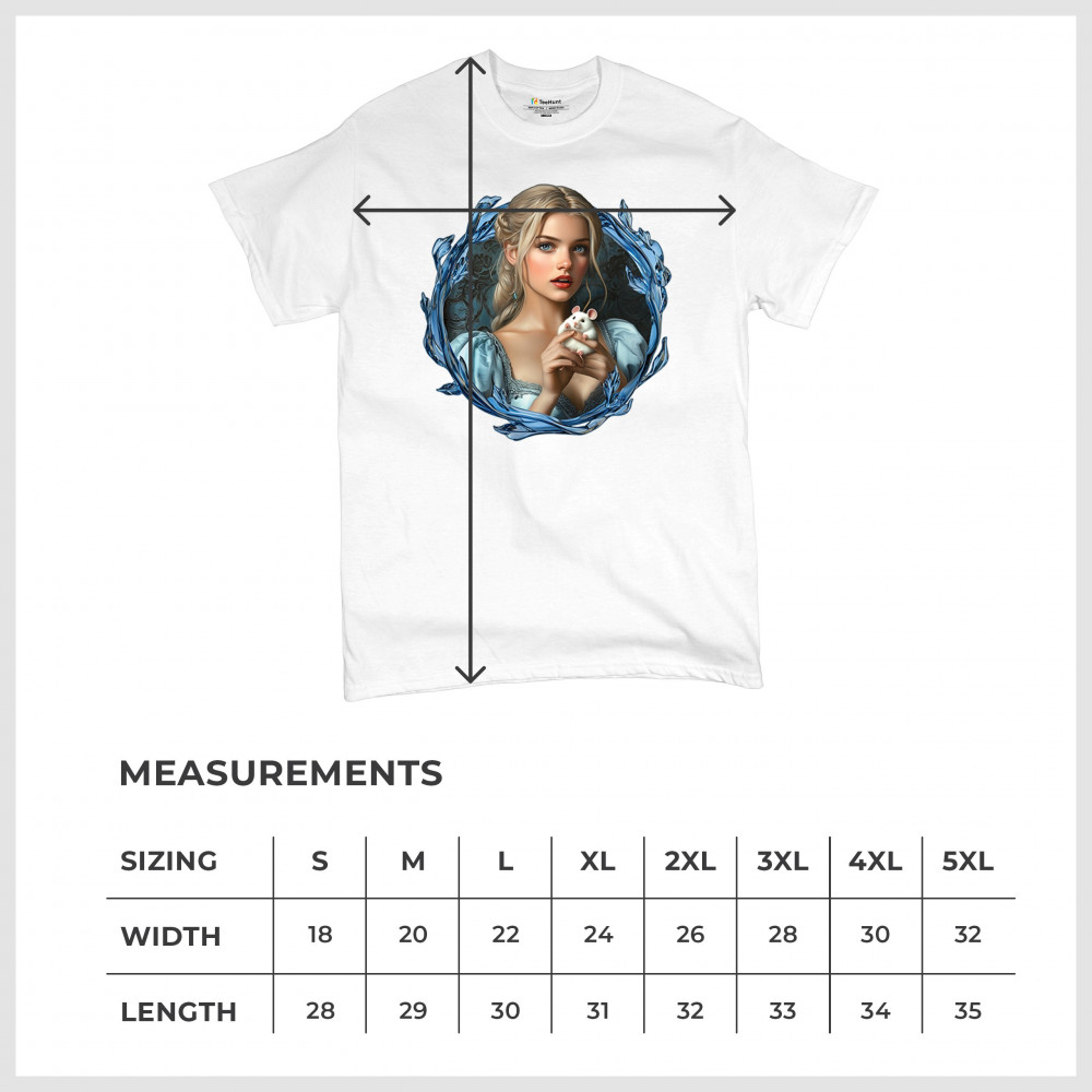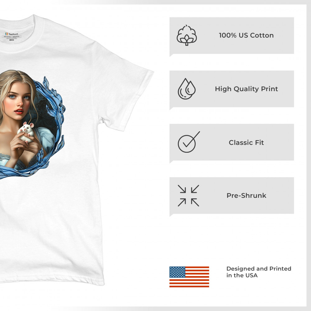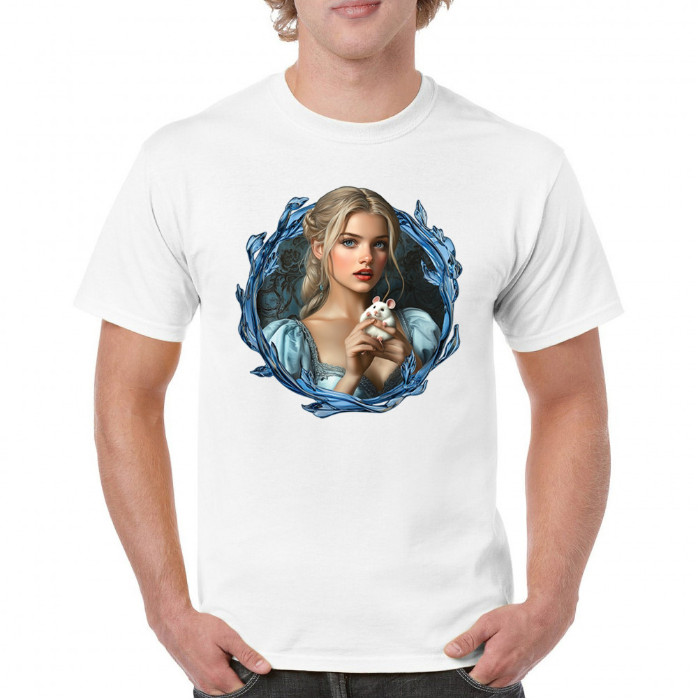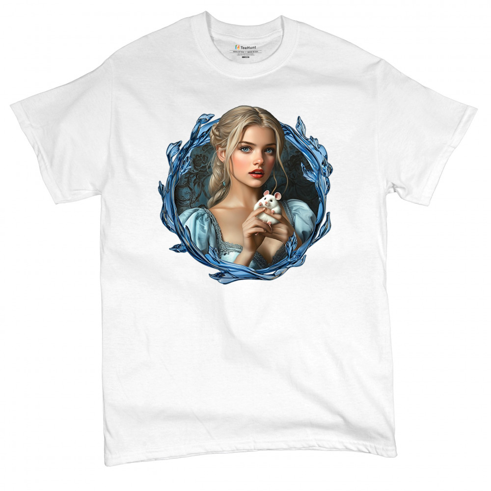 A whimsical design inspired by fairytales and Cinderella magic, featuring a blonde girl in a blue dress holding a white mouse. The icy blue leaf frame evokes enchantment and transformation. With soft, vintage tones and a dreamy feel, it’s a charming tribute to kindness, fantasy, animal companionship, and gentle storytelling magic.