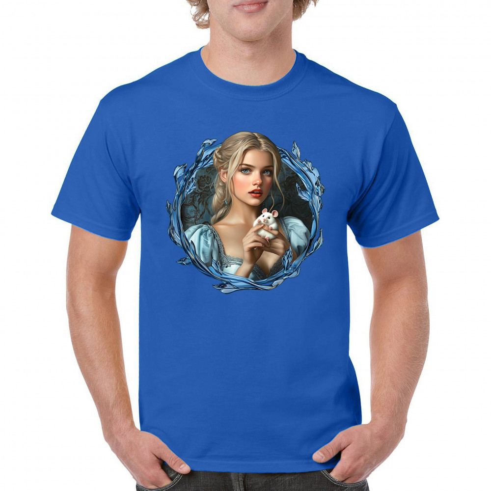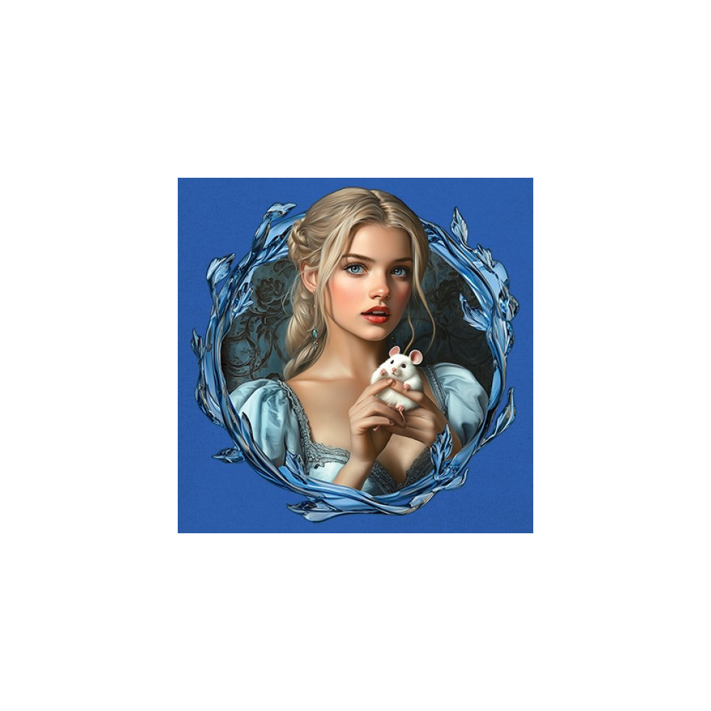 A whimsical design inspired by fairytales and Cinderella magic, featuring a blonde girl in a blue dress holding a white mouse. The icy blue leaf frame evokes enchantment and transformation. With soft, vintage tones and a dreamy feel, it’s a charming tribute to kindness, fantasy, animal companionship, and gentle storytelling magic.