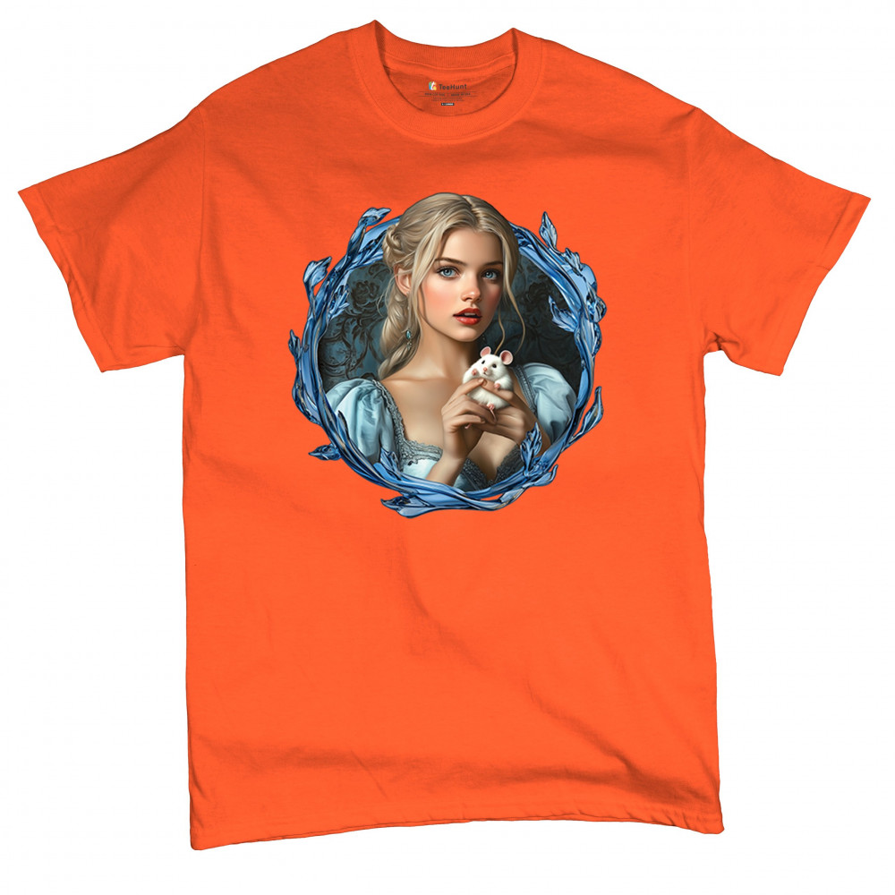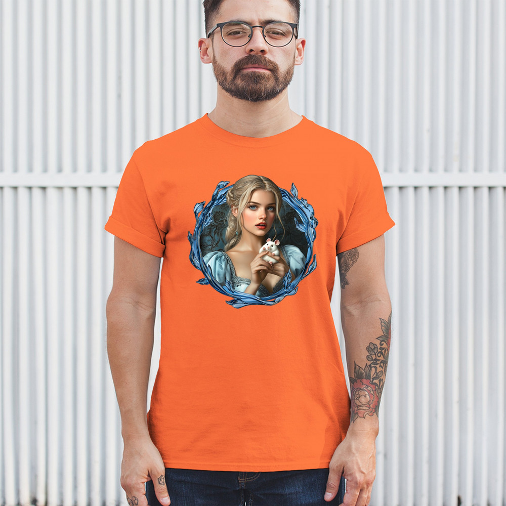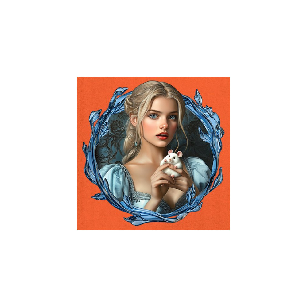 A whimsical design inspired by fairytales and Cinderella magic, featuring a blonde girl in a blue dress holding a white mouse. The icy blue leaf frame evokes enchantment and transformation. With soft, vintage tones and a dreamy feel, it’s a charming tribute to kindness, fantasy, animal companionship, and gentle storytelling magic.