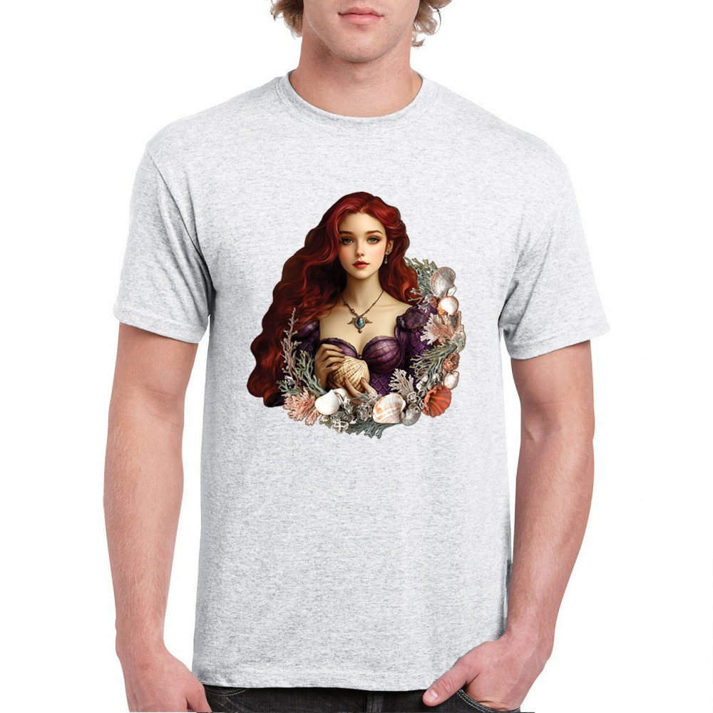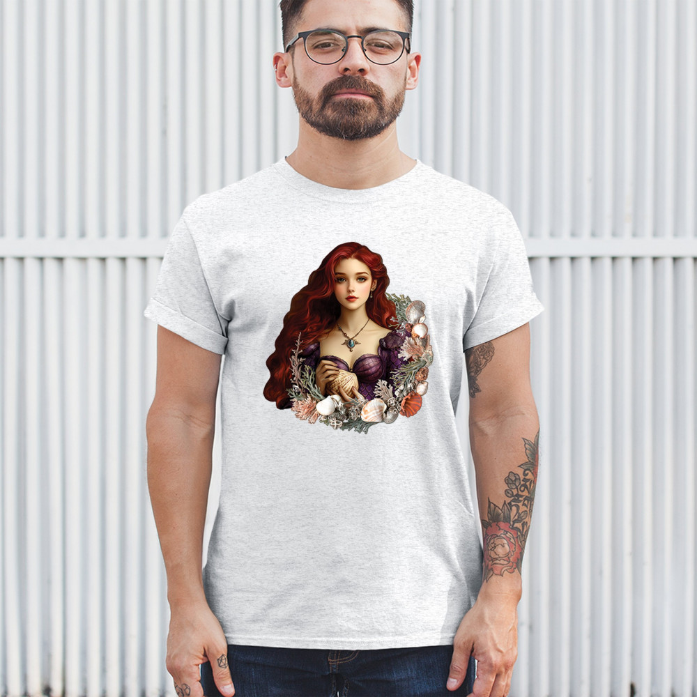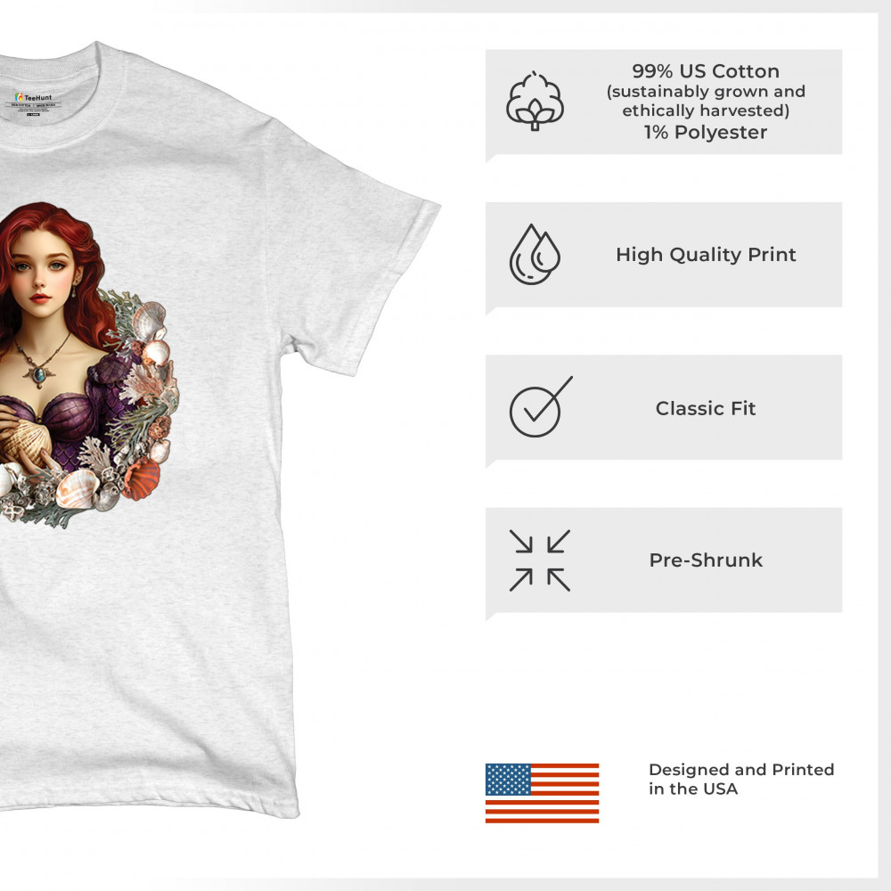 Inspired by mystical ocean themes, this design features a fantasy red-haired girl in a seashell dress, cradling a large shell. She is framed by coral, seaweed, and a shimmering array of ocean shells. With nods to classic mermaid lore and fairytale storytelling, it's perfect for fans of fantasy creatures, marine magic, and romantic ocean legends.