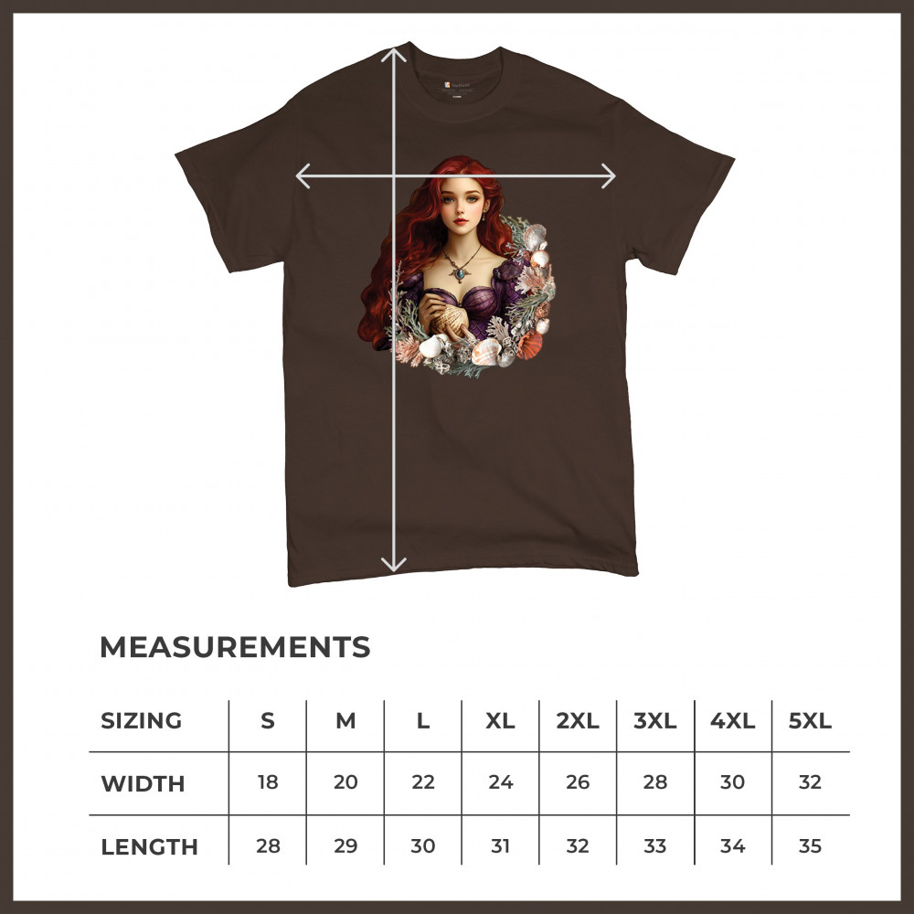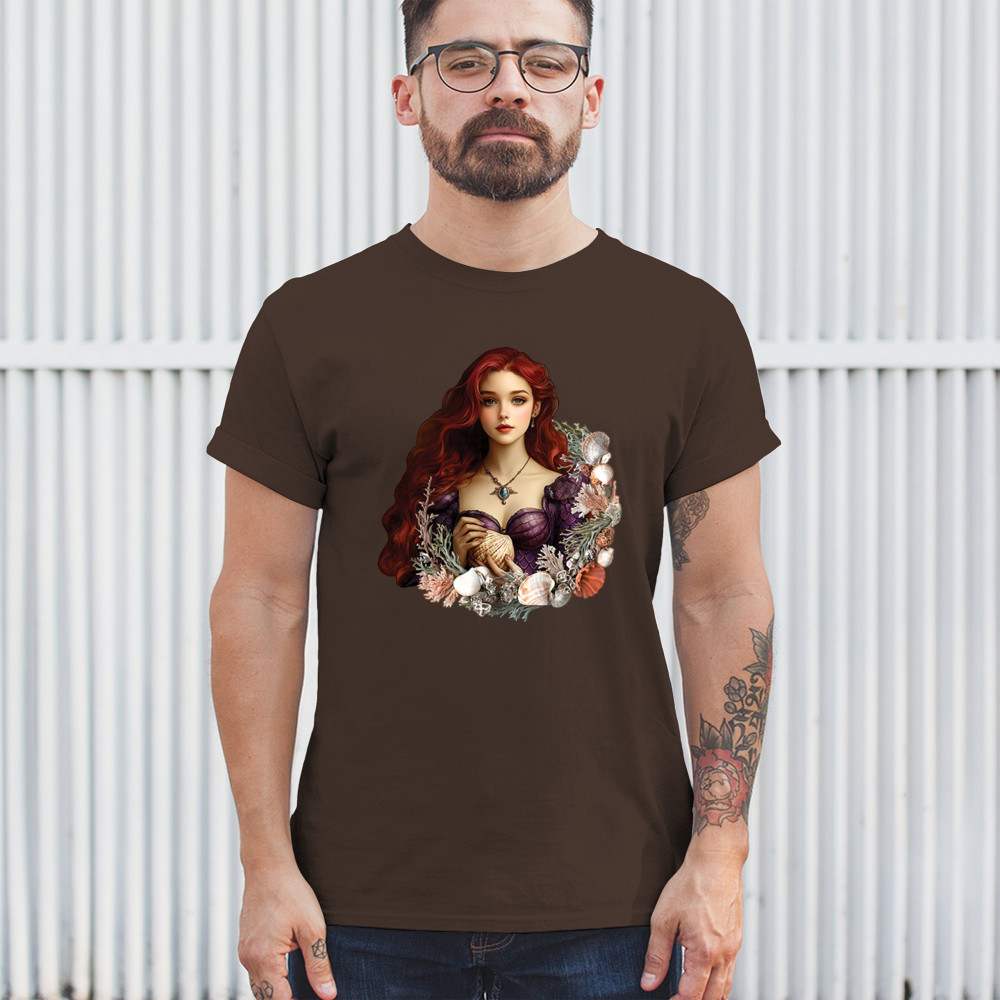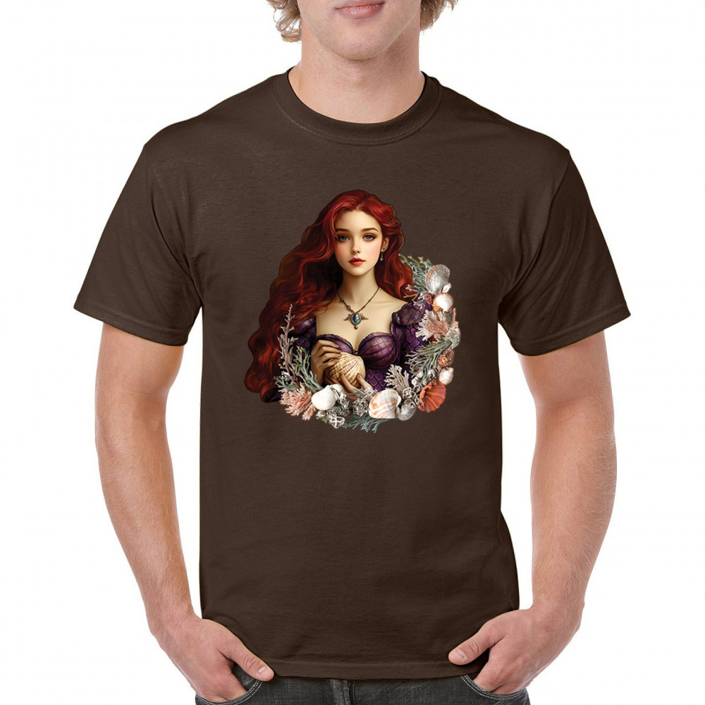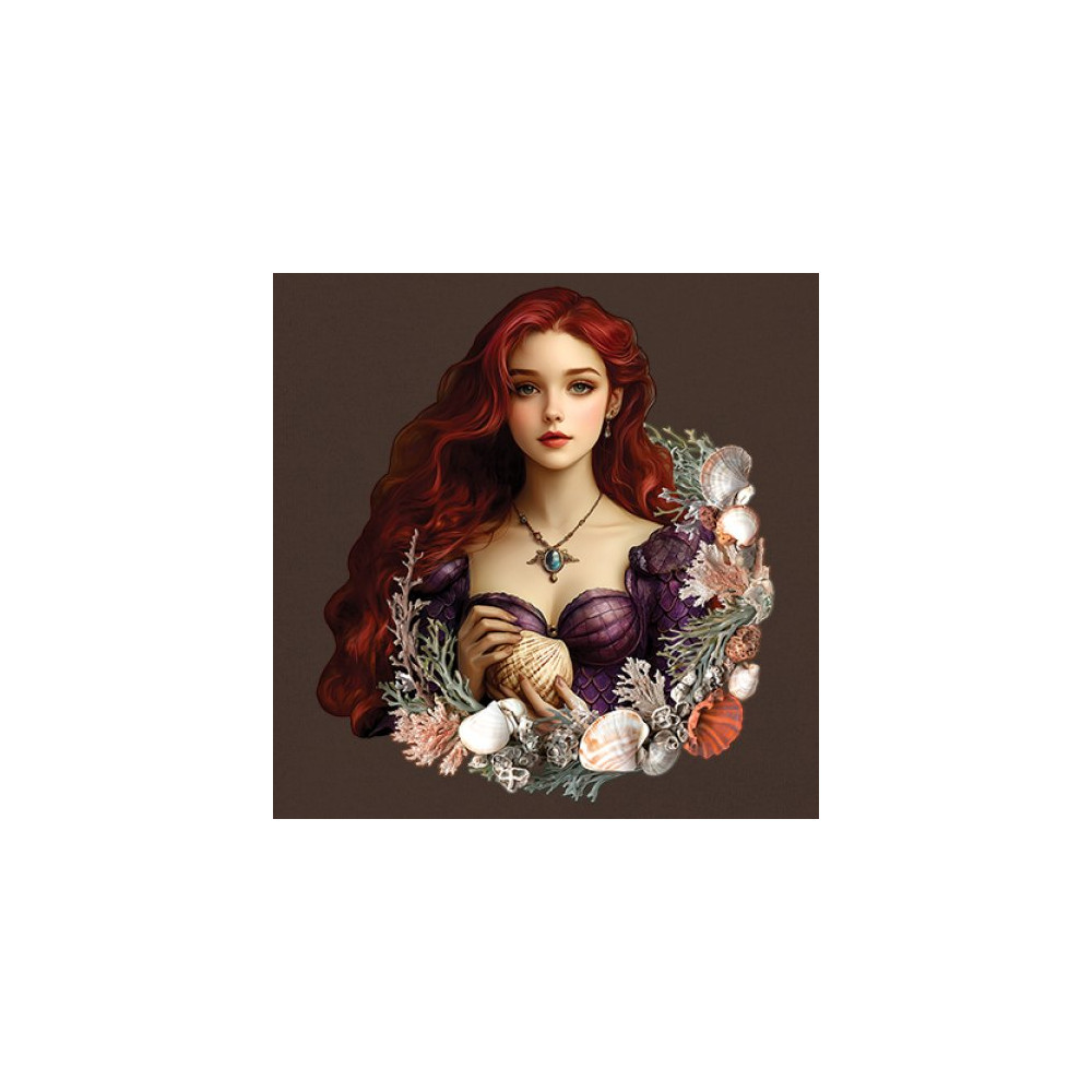 Inspired by mystical ocean themes, this design features a fantasy red-haired girl in a seashell dress, cradling a large shell. She is framed by coral, seaweed, and a shimmering array of ocean shells. With nods to classic mermaid lore and fairytale storytelling, it's perfect for fans of fantasy creatures, marine magic, and romantic ocean legends.