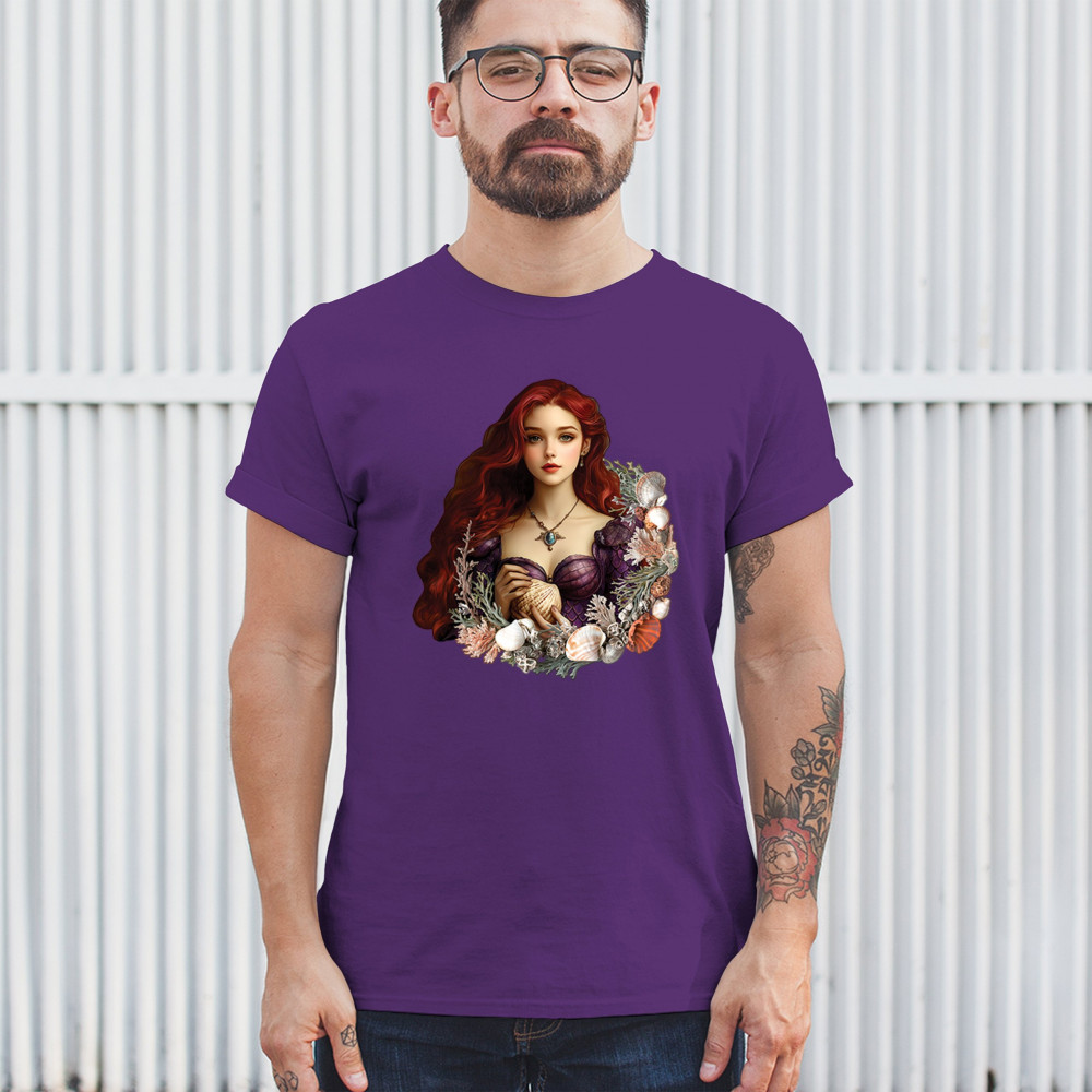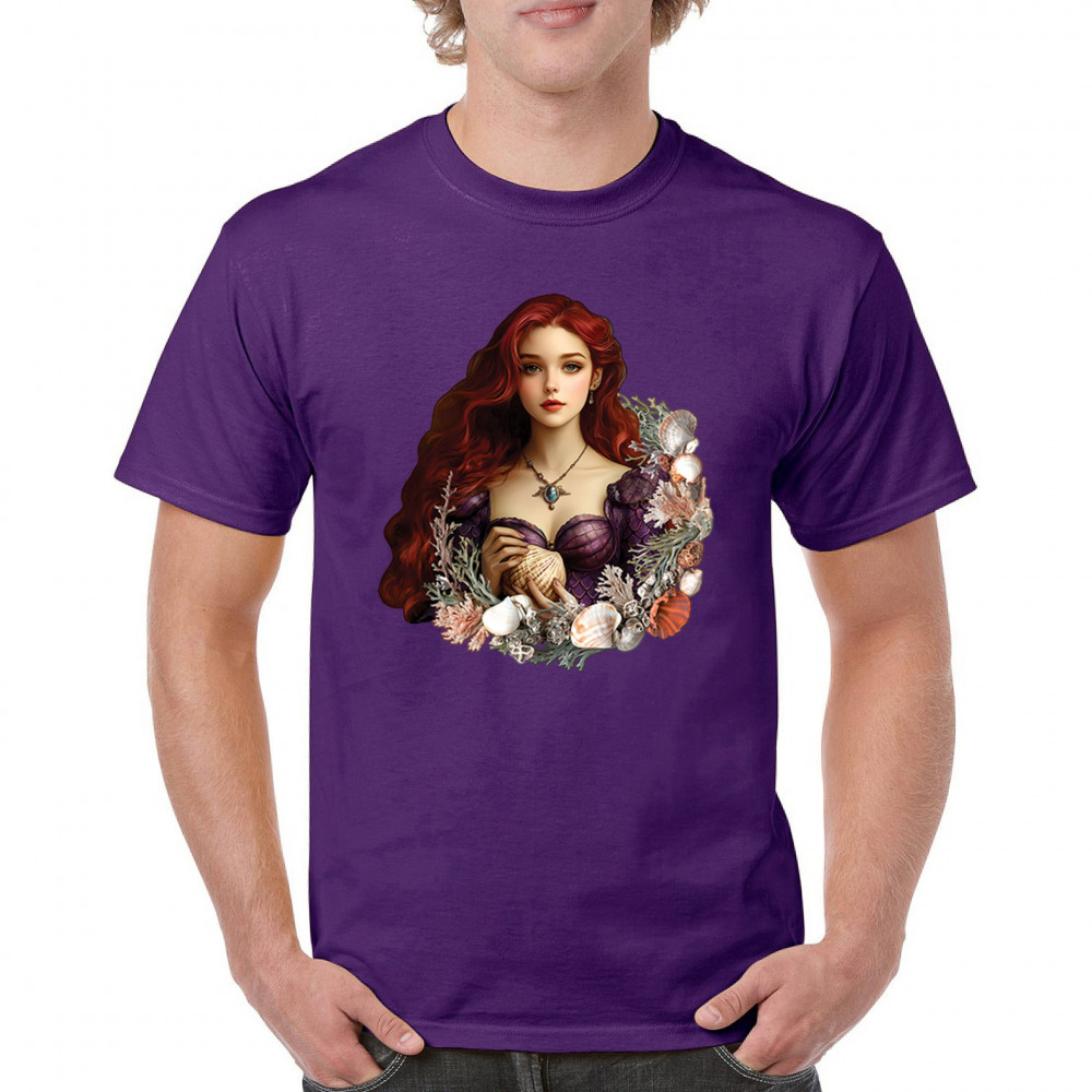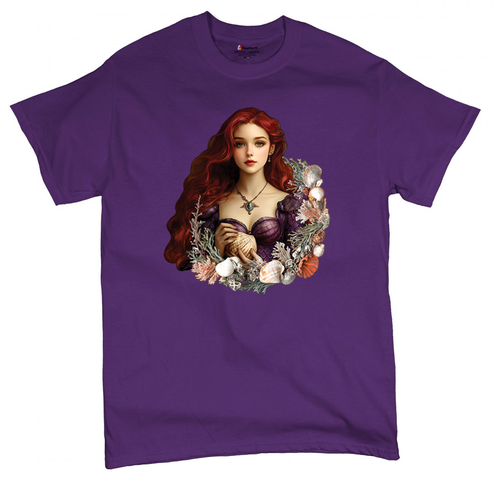 Inspired by mystical ocean themes, this design features a fantasy red-haired girl in a seashell dress, cradling a large shell. She is framed by coral, seaweed, and a shimmering array of ocean shells. With nods to classic mermaid lore and fairytale storytelling, it's perfect for fans of fantasy creatures, marine magic, and romantic ocean legends.