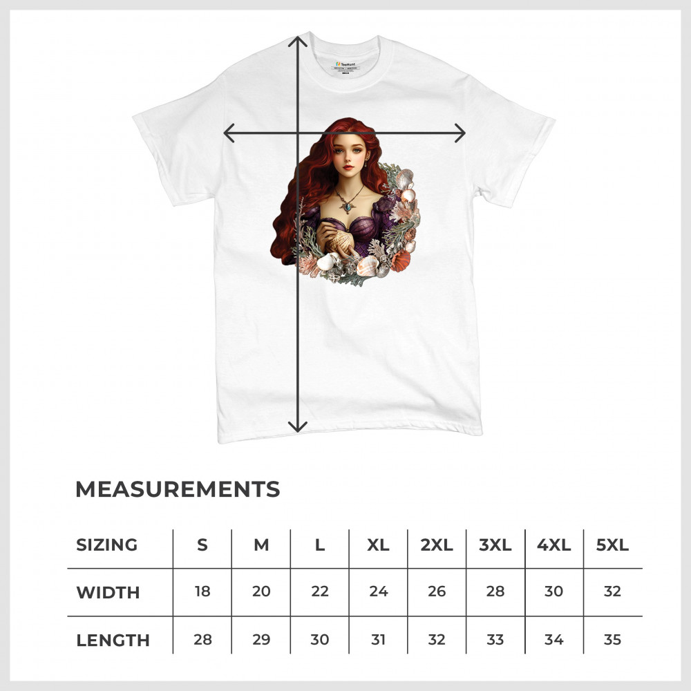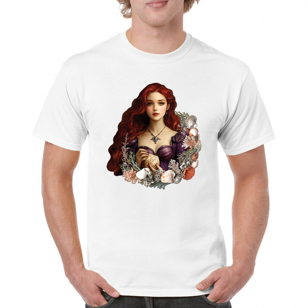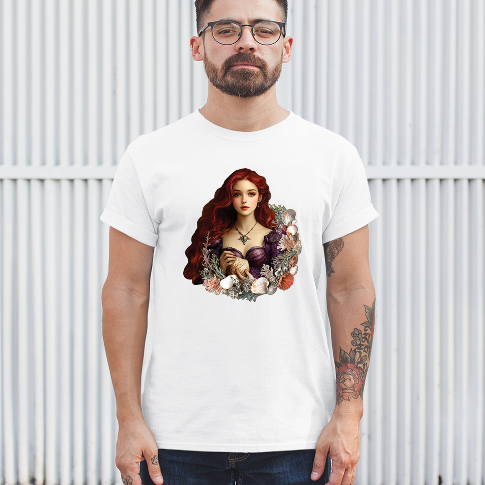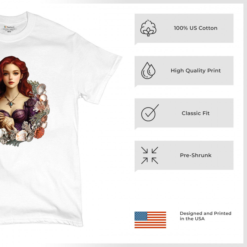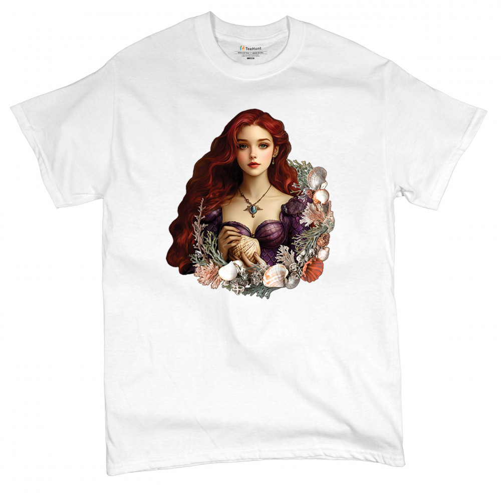 Inspired by mystical ocean themes, this design features a fantasy red-haired girl in a seashell dress, cradling a large shell. She is framed by coral, seaweed, and a shimmering array of ocean shells. With nods to classic mermaid lore and fairytale storytelling, it's perfect for fans of fantasy creatures, marine magic, and romantic ocean legends.