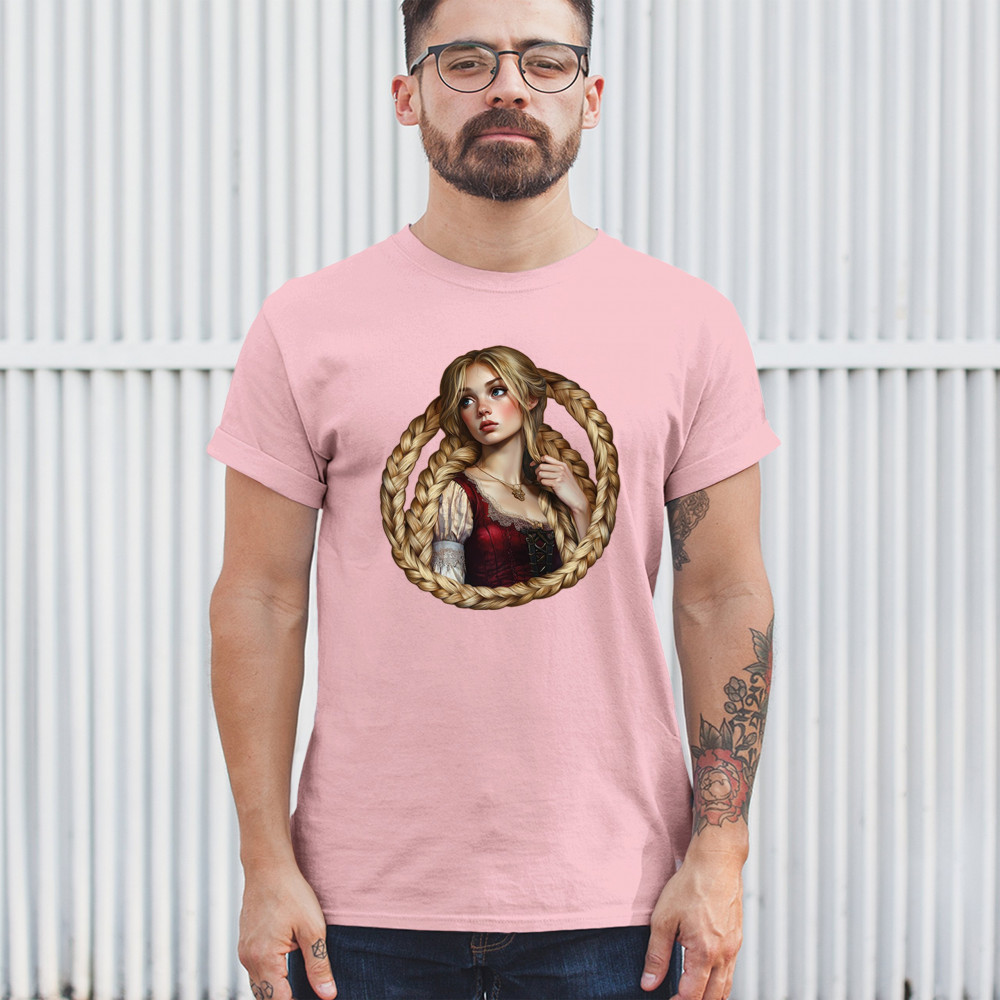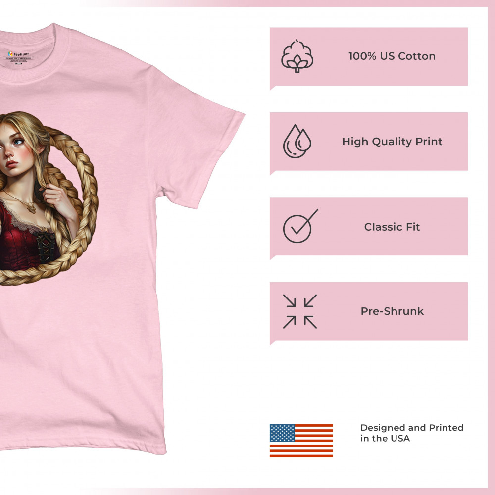 A dreamy design featuring a blonde girl with long braided hair encircling her like a frame. With vintage dress details and a wistful look, this artwork channels the essence of fairytales, romantic legends, and gentle feminine power. Ideal for fantasy lovers, folklore fans, and collectors of magical storybook themes.