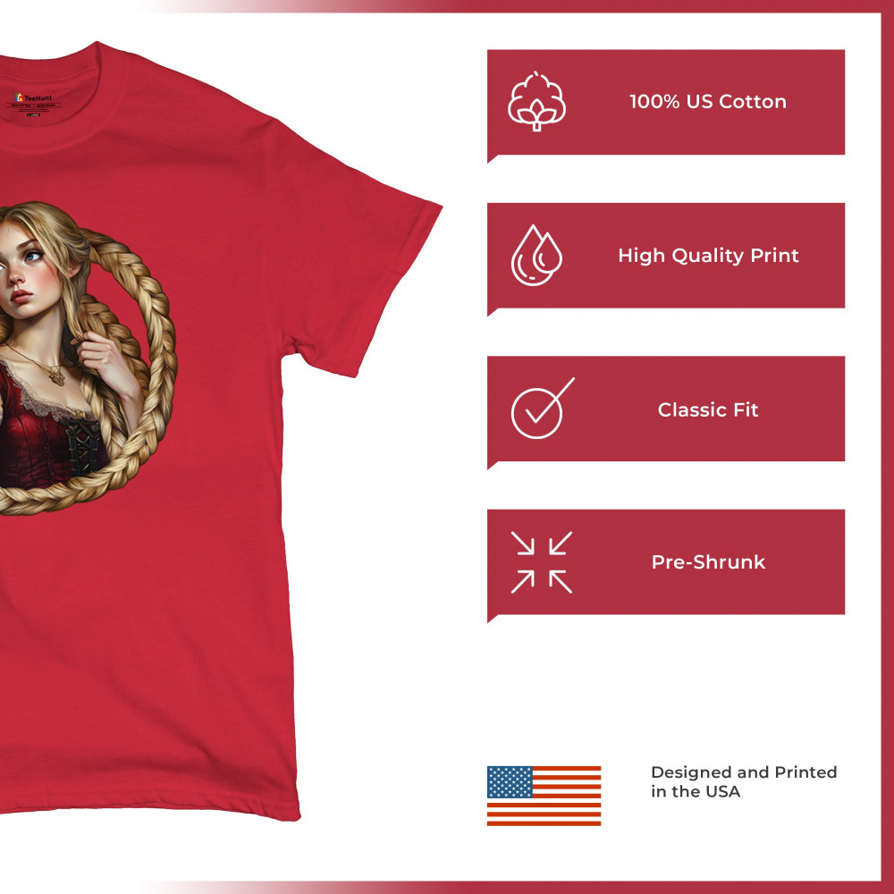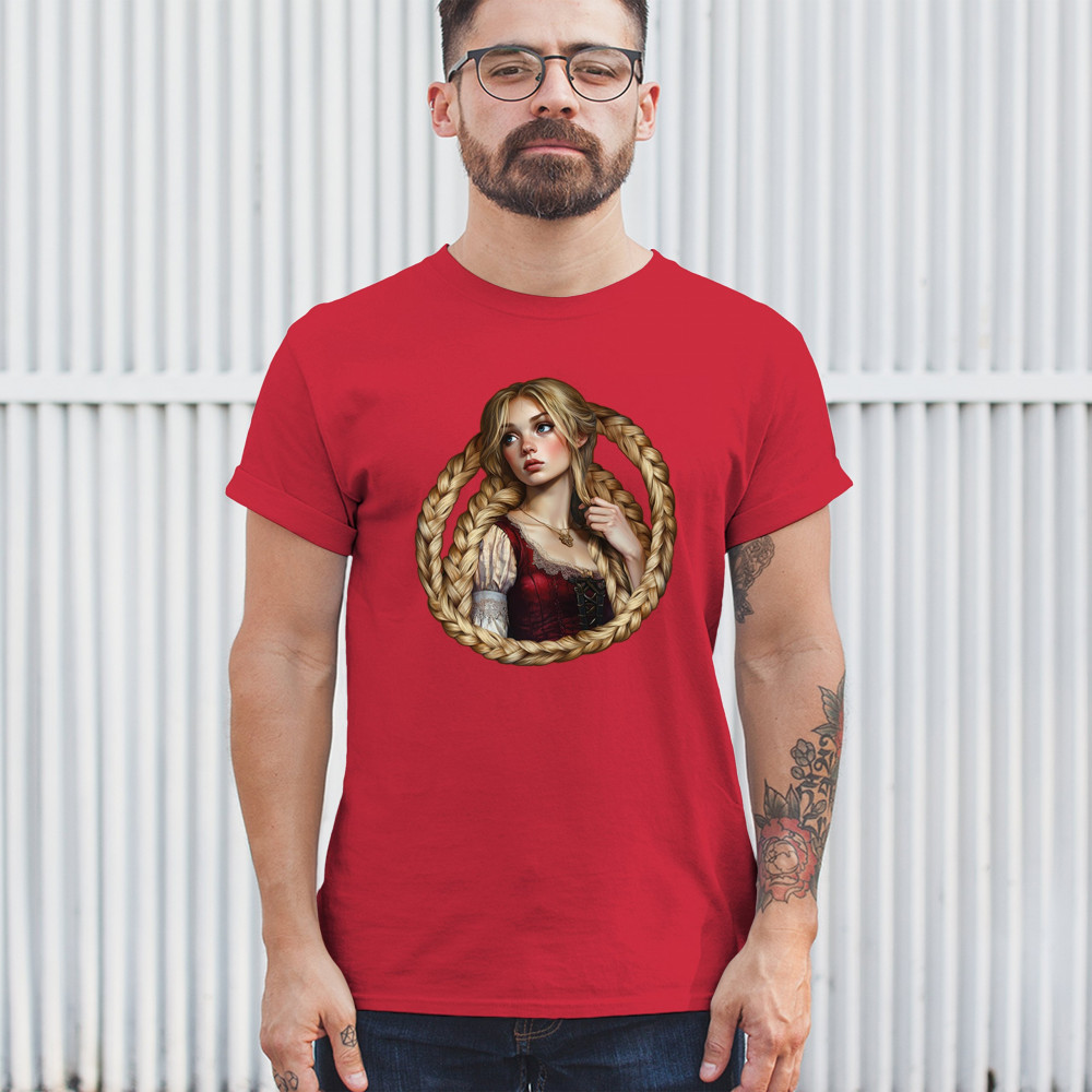 A dreamy design featuring a blonde girl with long braided hair encircling her like a frame. With vintage dress details and a wistful look, this artwork channels the essence of fairytales, romantic legends, and gentle feminine power. Ideal for fantasy lovers, folklore fans, and collectors of magical storybook themes.