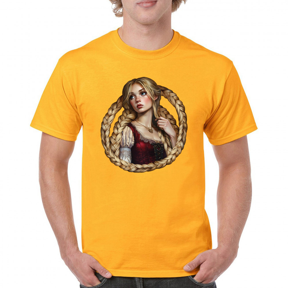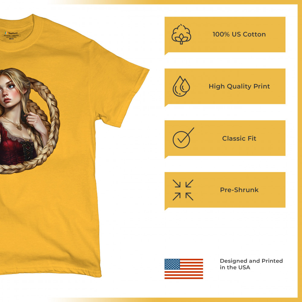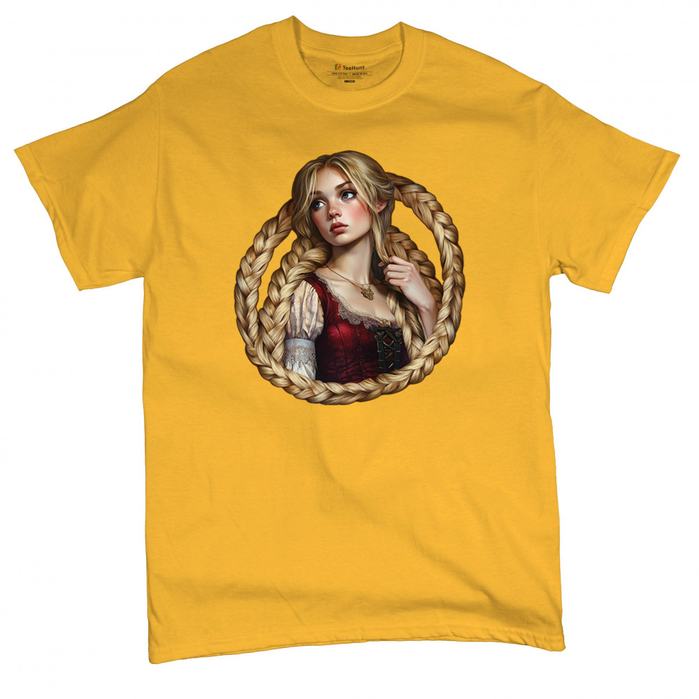 A dreamy design featuring a blonde girl with long braided hair encircling her like a frame. With vintage dress details and a wistful look, this artwork channels the essence of fairytales, romantic legends, and gentle feminine power. Ideal for fantasy lovers, folklore fans, and collectors of magical storybook themes.