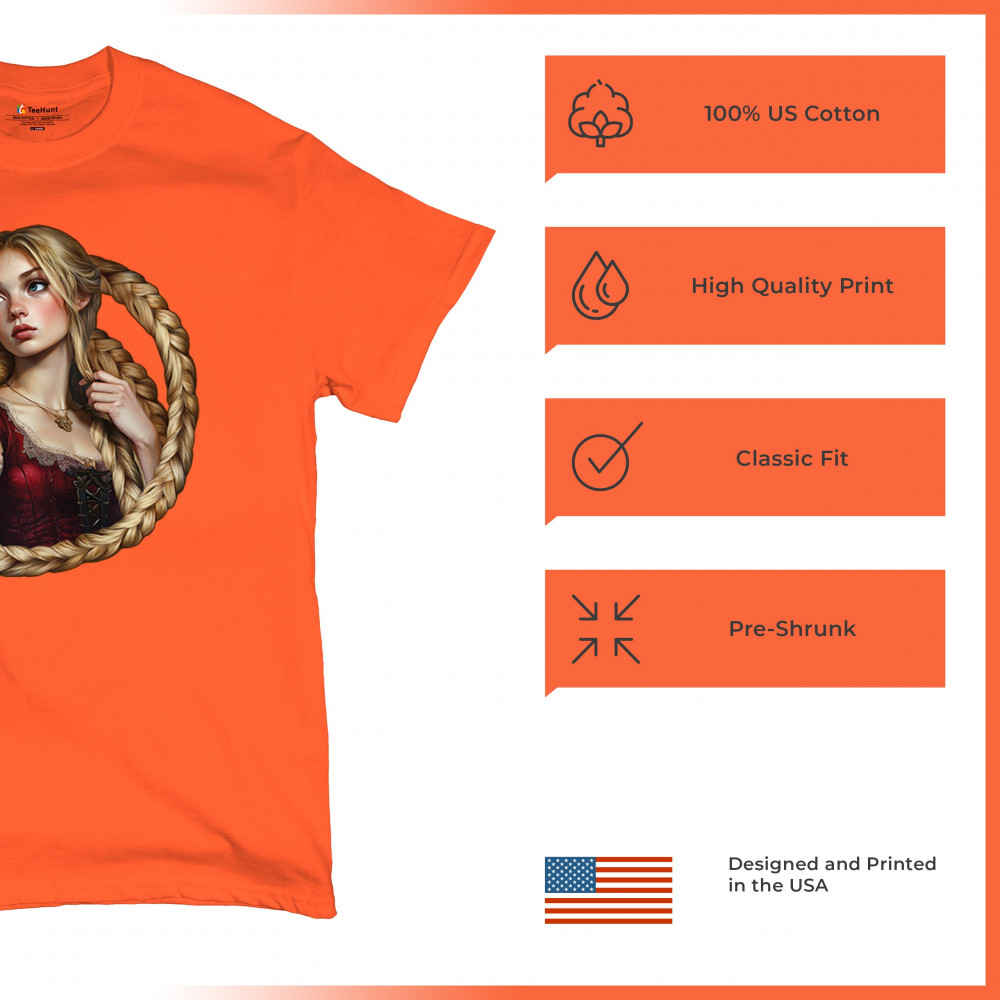 A dreamy design featuring a blonde girl with long braided hair encircling her like a frame. With vintage dress details and a wistful look, this artwork channels the essence of fairytales, romantic legends, and gentle feminine power. Ideal for fantasy lovers, folklore fans, and collectors of magical storybook themes.