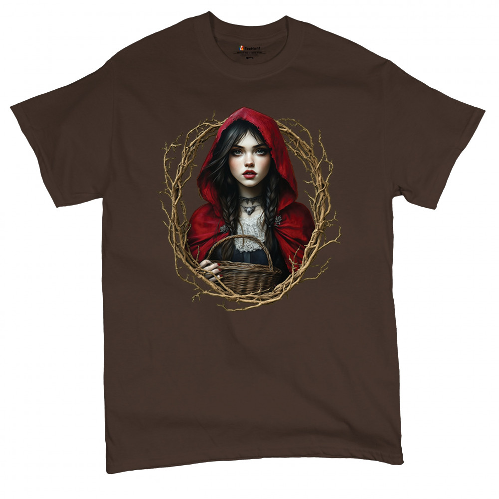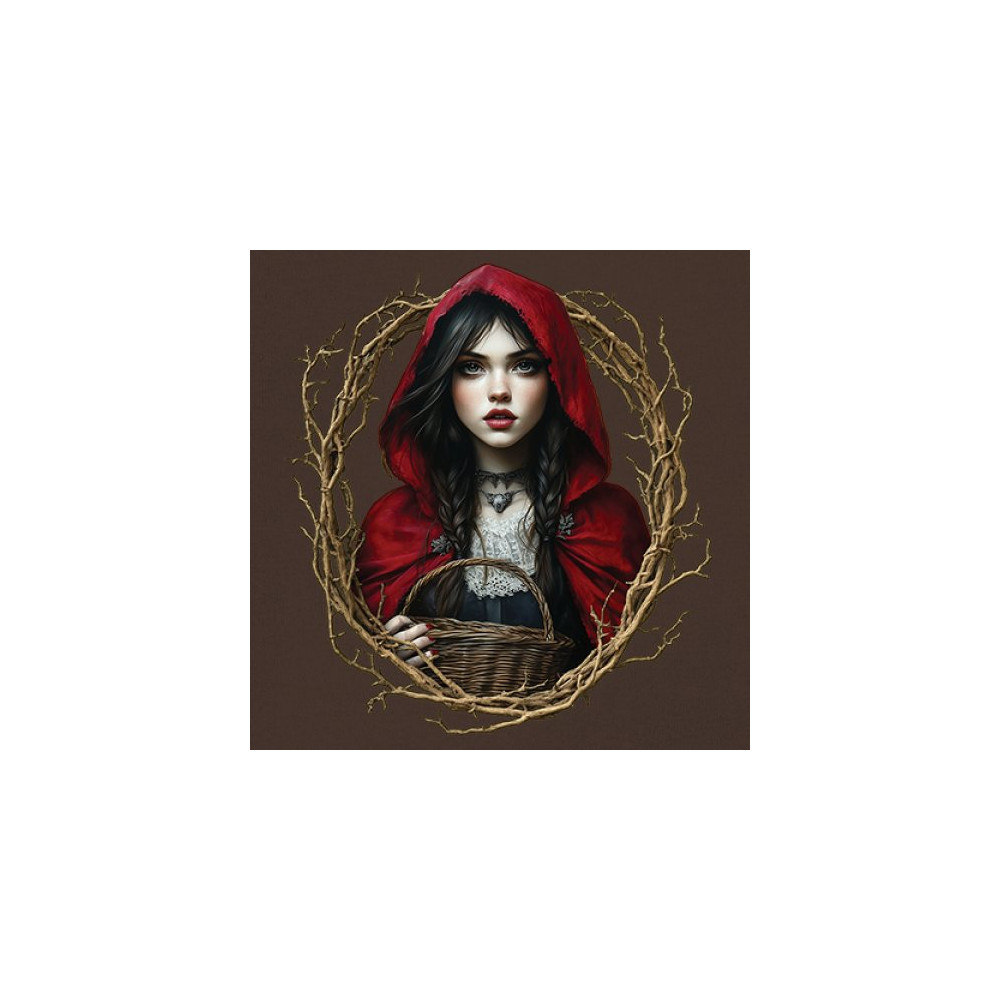 Step into a shadowy fairytale with this gothic design featuring a red-cloaked girl and twisted forest branches. Evoking themes from Red Riding Hood and folklore magic, it’s rich in fantasy, mystery, and dark aesthetic. Perfect for fantasy lovers, dark romantics, and storybook dreamers drawn to enchanted paths and eerie tales.