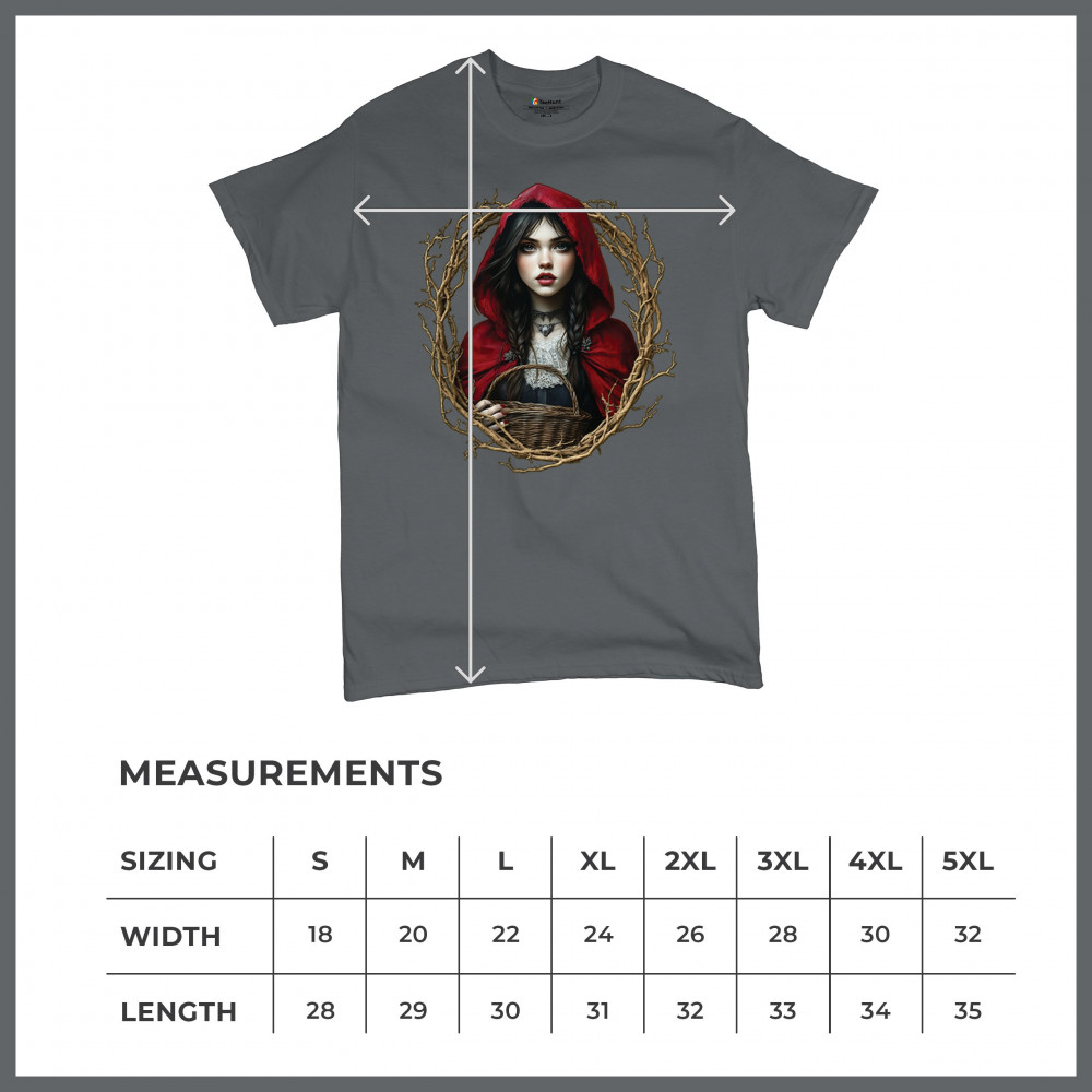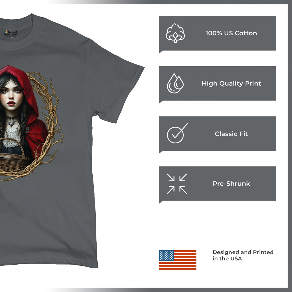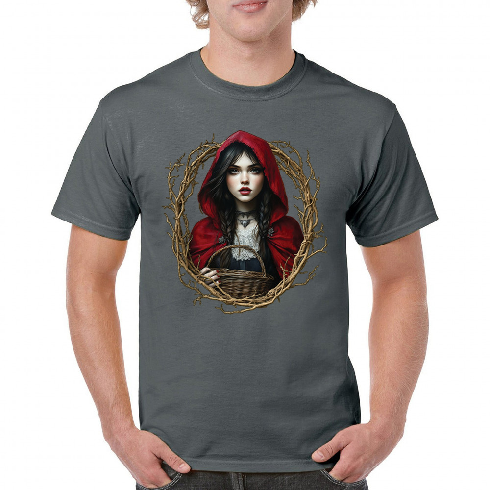 Step into a shadowy fairytale with this gothic design featuring a red-cloaked girl and twisted forest branches. Evoking themes from Red Riding Hood and folklore magic, it’s rich in fantasy, mystery, and dark aesthetic. Perfect for fantasy lovers, dark romantics, and storybook dreamers drawn to enchanted paths and eerie tales.
