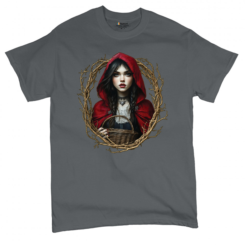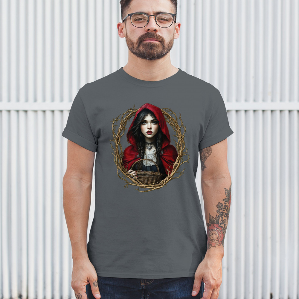 Gothic fairytale design with red cloak, forest branches, and moody magic. A dark, enchanting look for fantasy fans and folklore lovers.