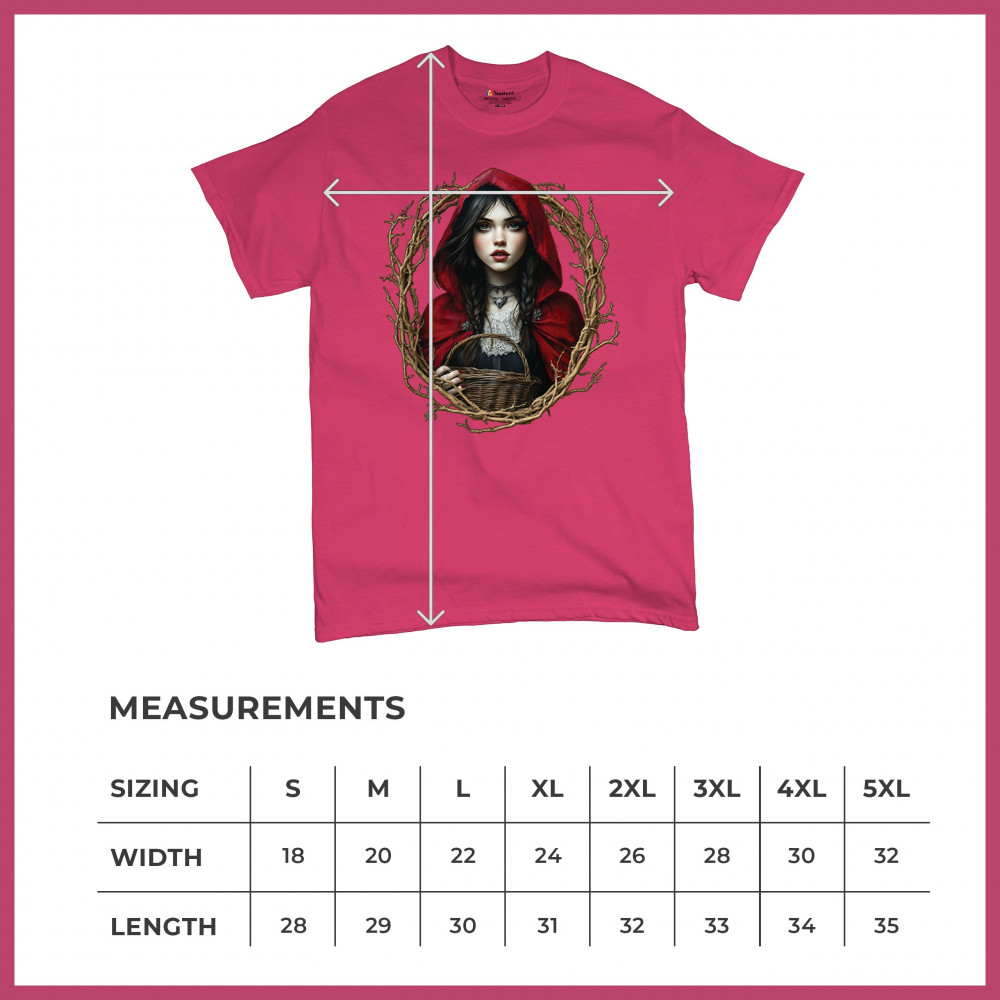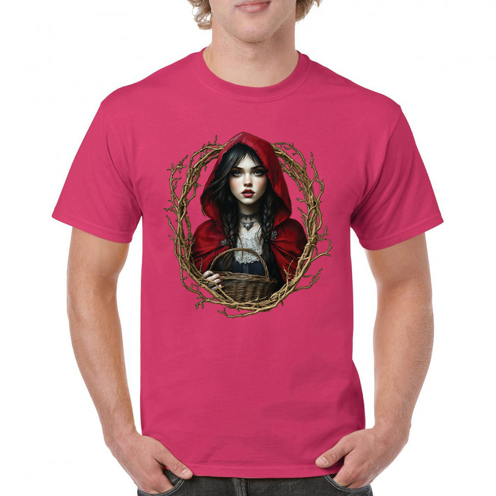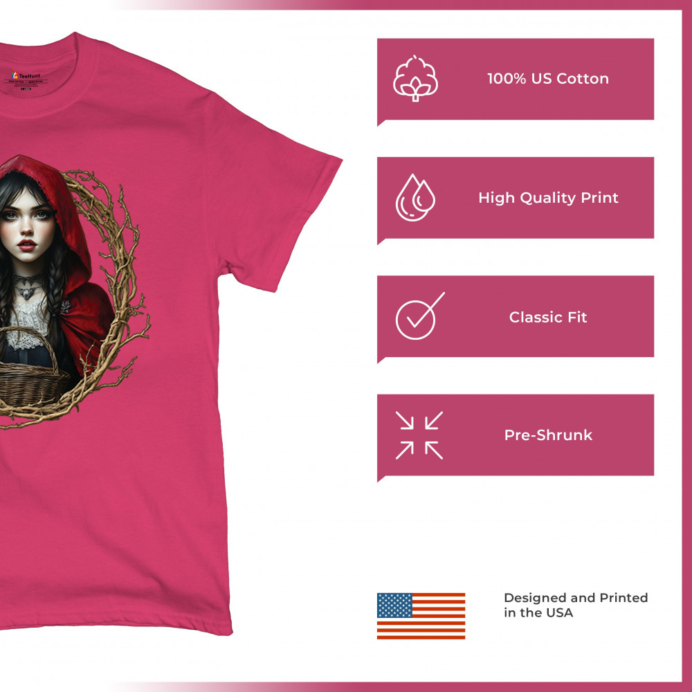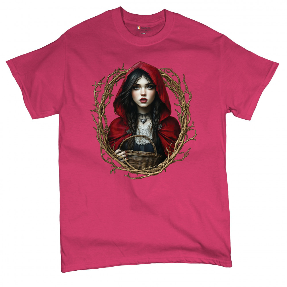 Step into a shadowy fairytale with this gothic design featuring a red-cloaked girl and twisted forest branches. Evoking themes from Red Riding Hood and folklore magic, it’s rich in fantasy, mystery, and dark aesthetic. Perfect for fantasy lovers, dark romantics, and storybook dreamers drawn to enchanted paths and eerie tales.