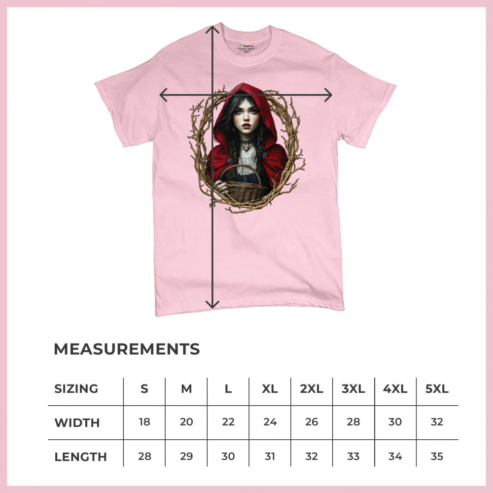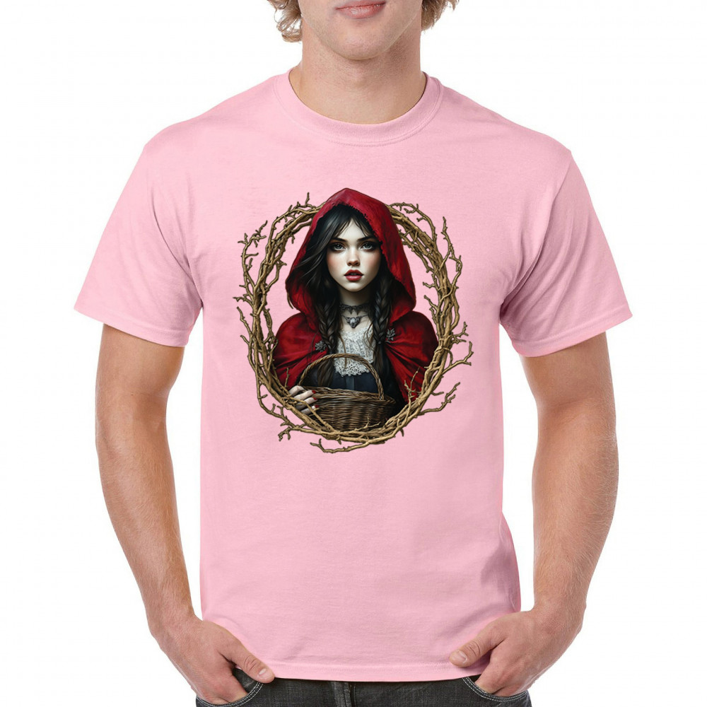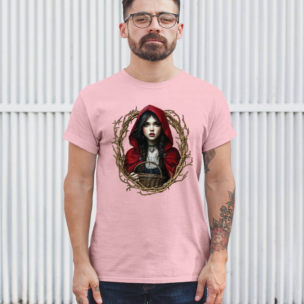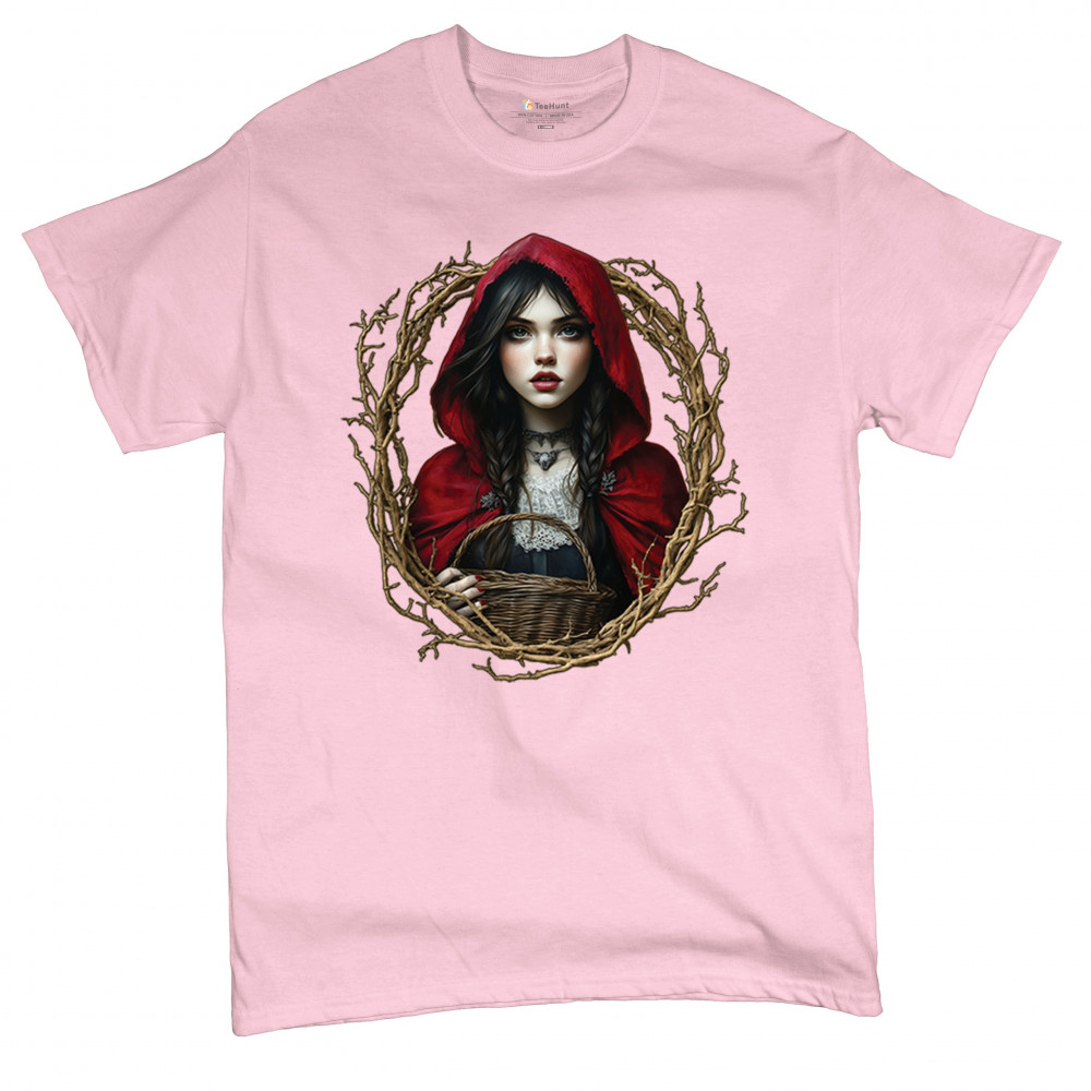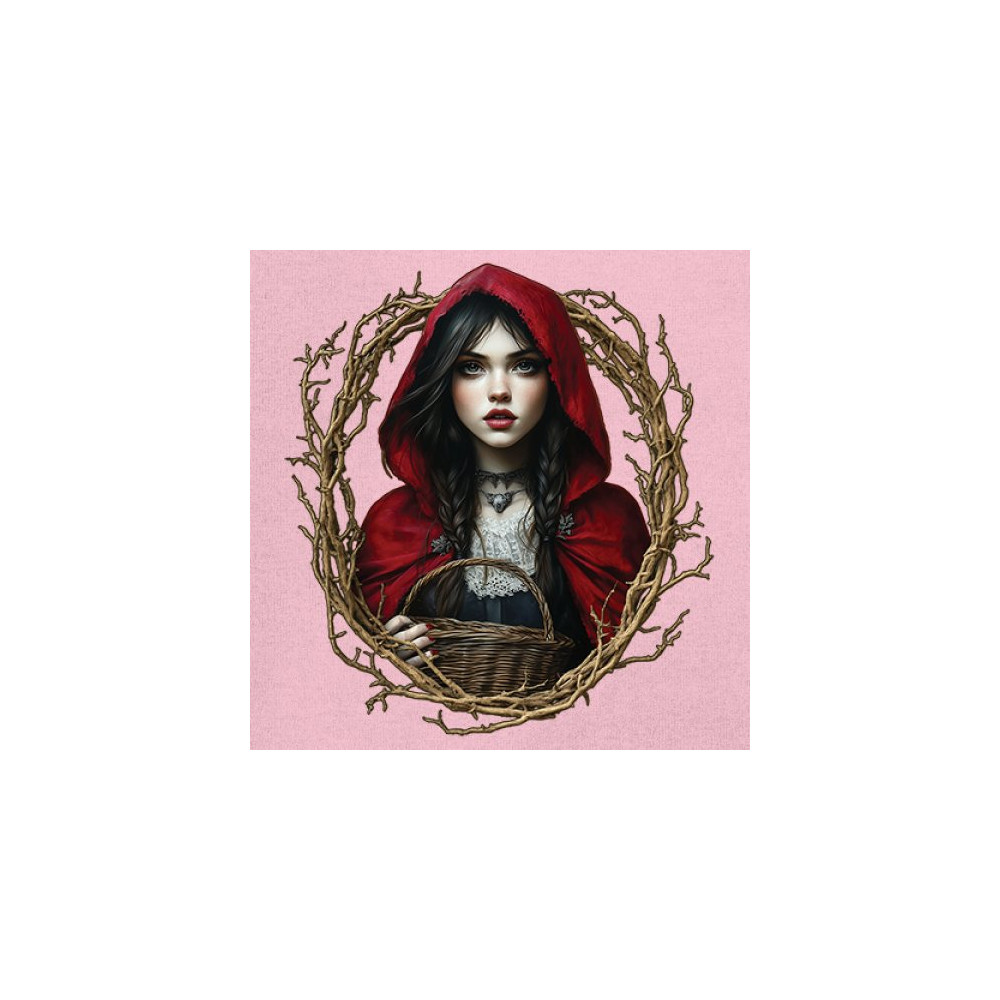 Step into a shadowy fairytale with this gothic design featuring a red-cloaked girl and twisted forest branches. Evoking themes from Red Riding Hood and folklore magic, it’s rich in fantasy, mystery, and dark aesthetic. Perfect for fantasy lovers, dark romantics, and storybook dreamers drawn to enchanted paths and eerie tales.
