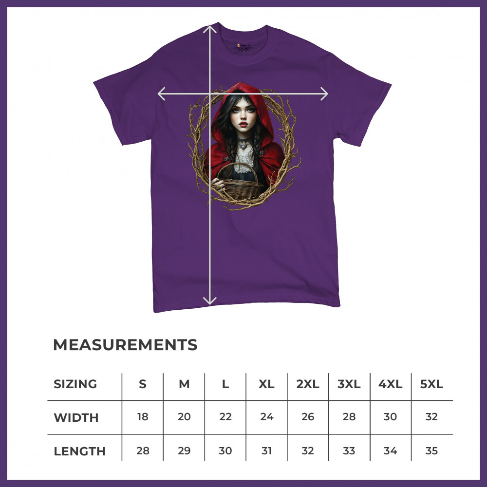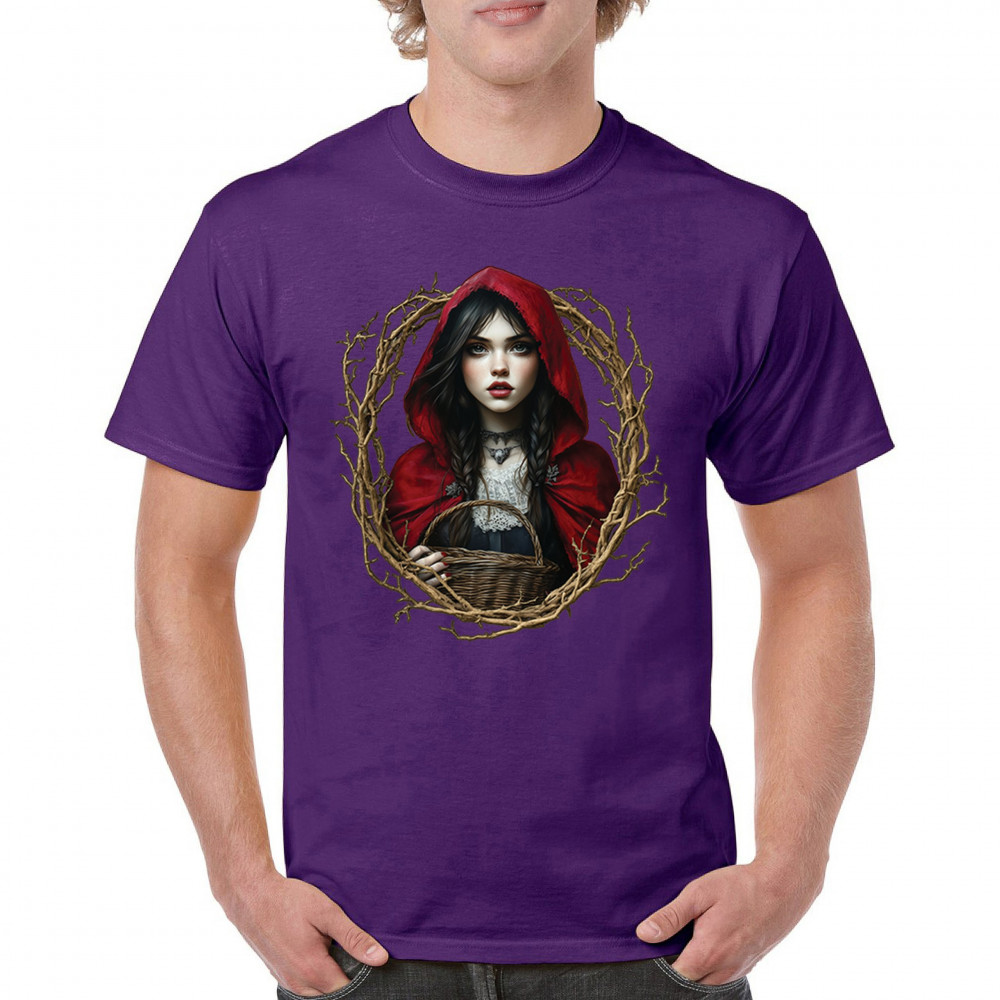 Step into a shadowy fairytale with this gothic design featuring a red-cloaked girl and twisted forest branches. Evoking themes from Red Riding Hood and folklore magic, it’s rich in fantasy, mystery, and dark aesthetic. Perfect for fantasy lovers, dark romantics, and storybook dreamers drawn to enchanted paths and eerie tales.
