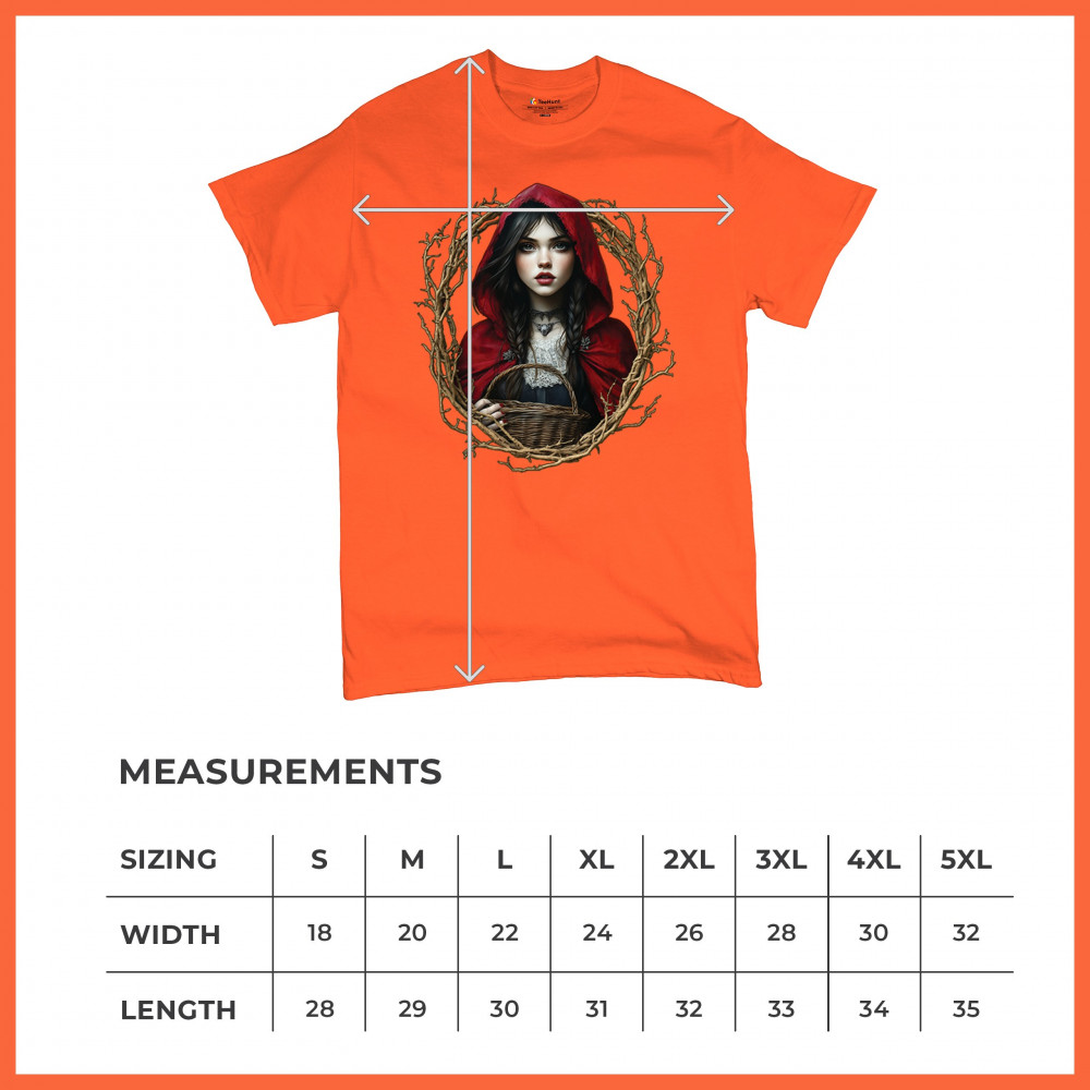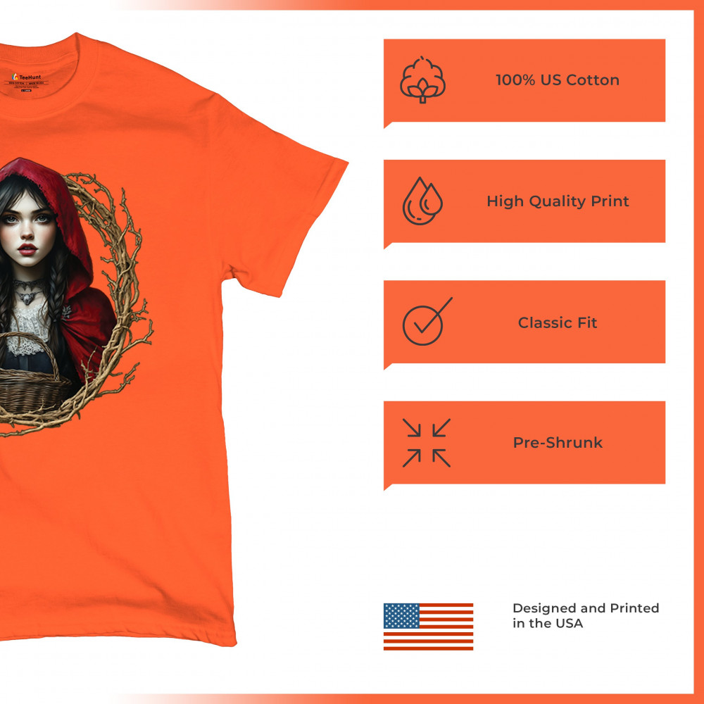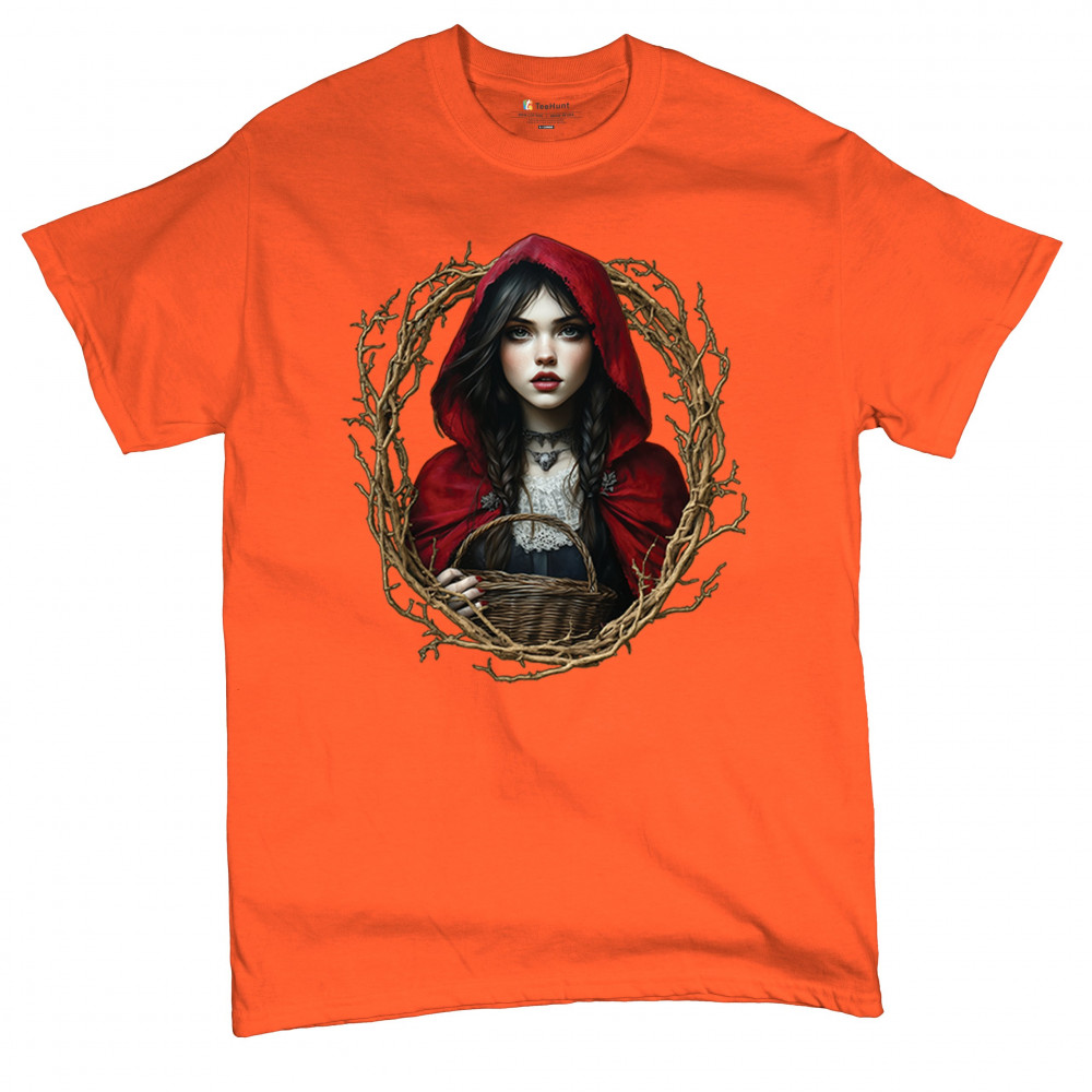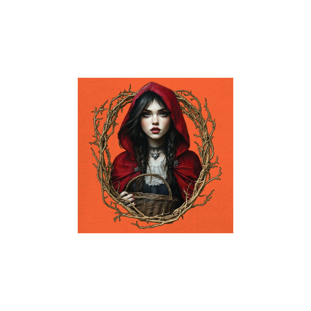 Step into a shadowy fairytale with this gothic design featuring a red-cloaked girl and twisted forest branches. Evoking themes from Red Riding Hood and folklore magic, it’s rich in fantasy, mystery, and dark aesthetic. Perfect for fantasy lovers, dark romantics, and storybook dreamers drawn to enchanted paths and eerie tales.