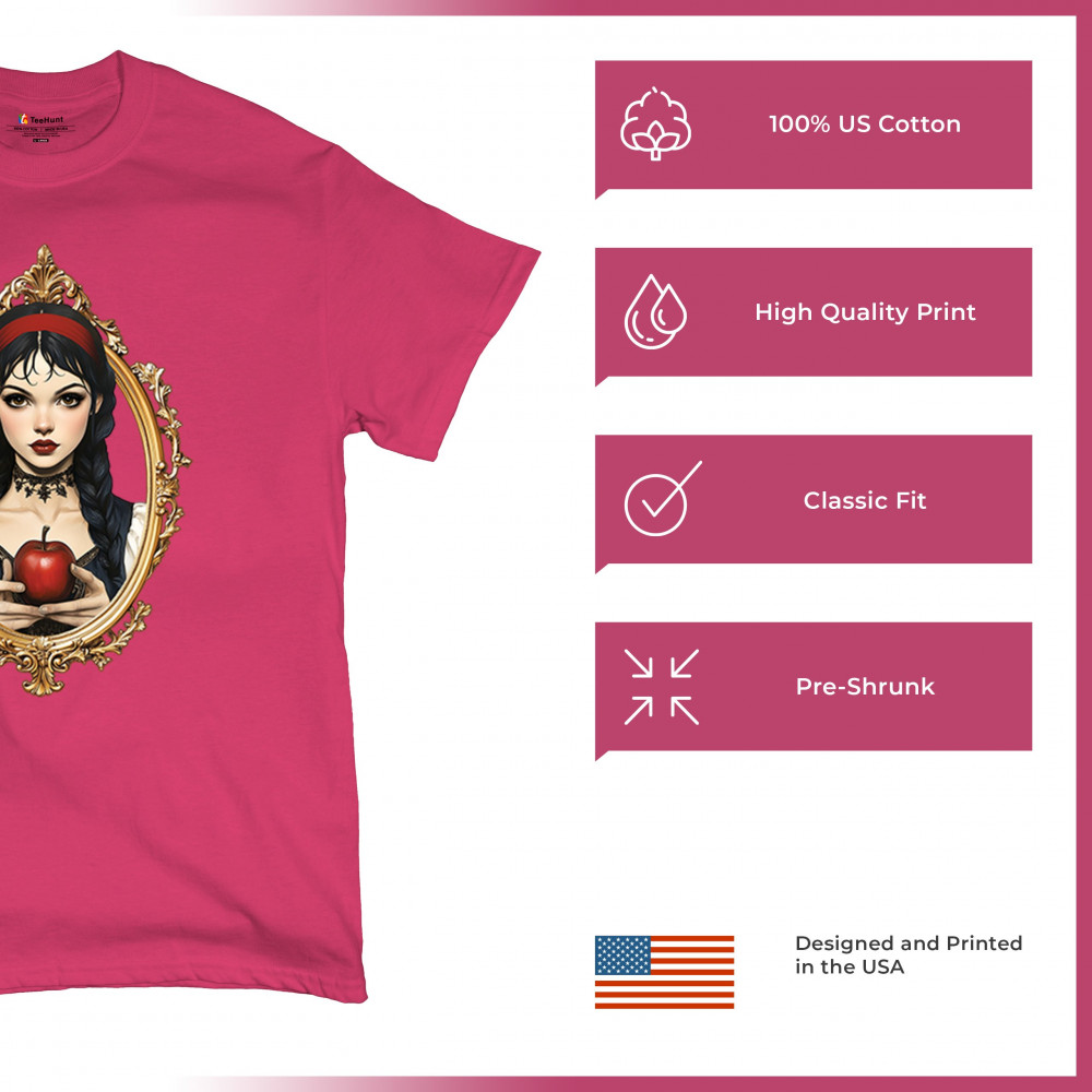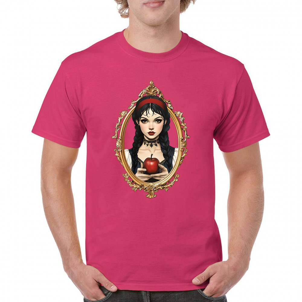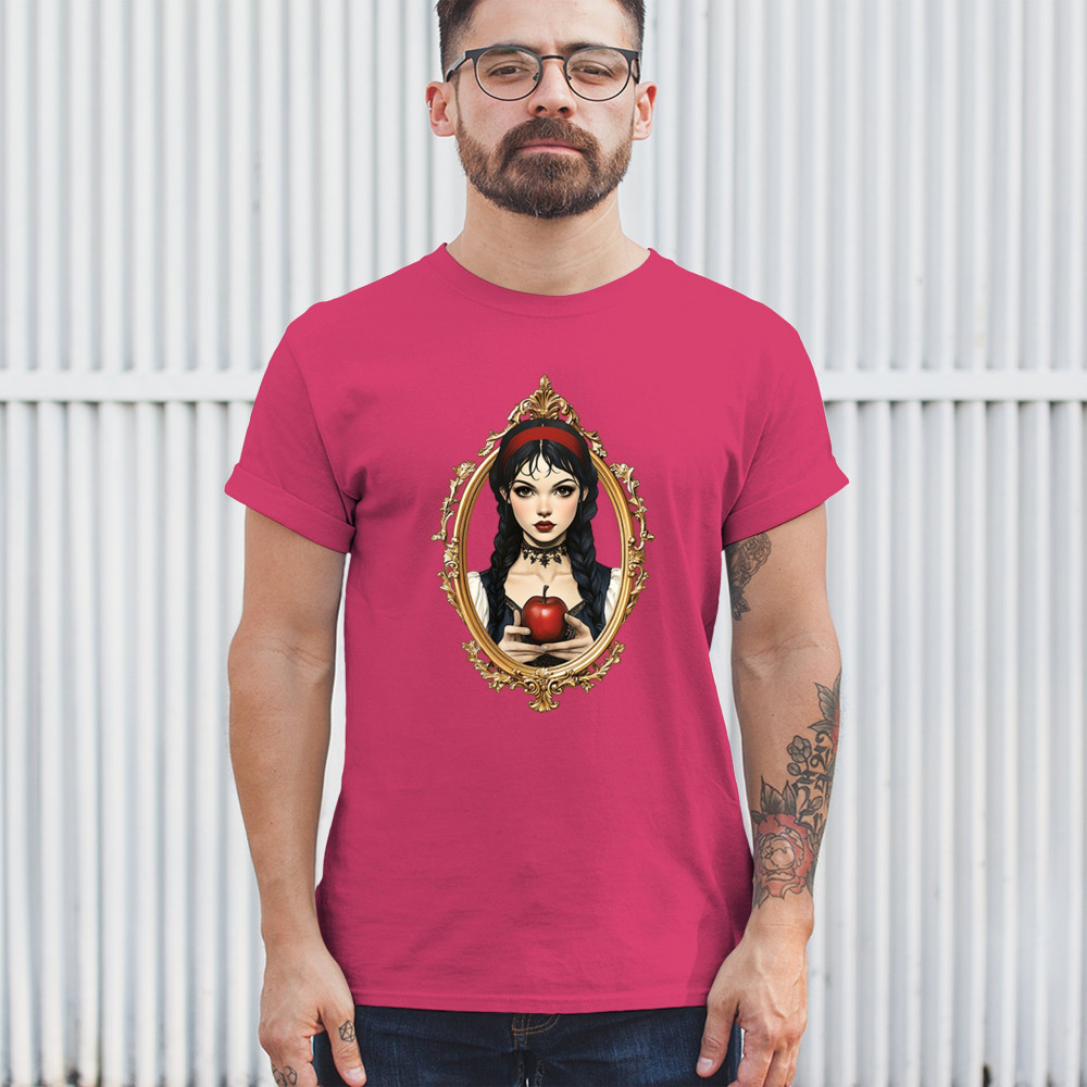 Dark fairytale design with red apple, gold frame, and Snow White vibes. A dreamy blend of fantasy, gothic style, and magical storytelling.