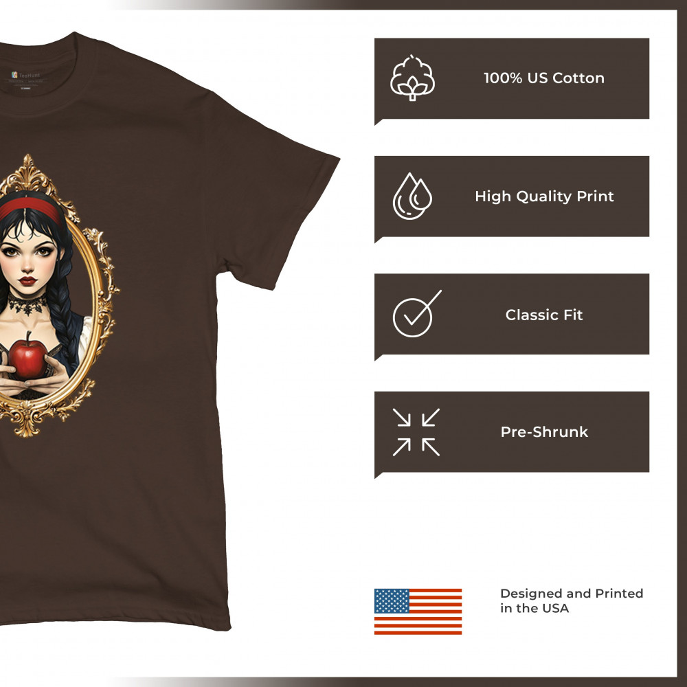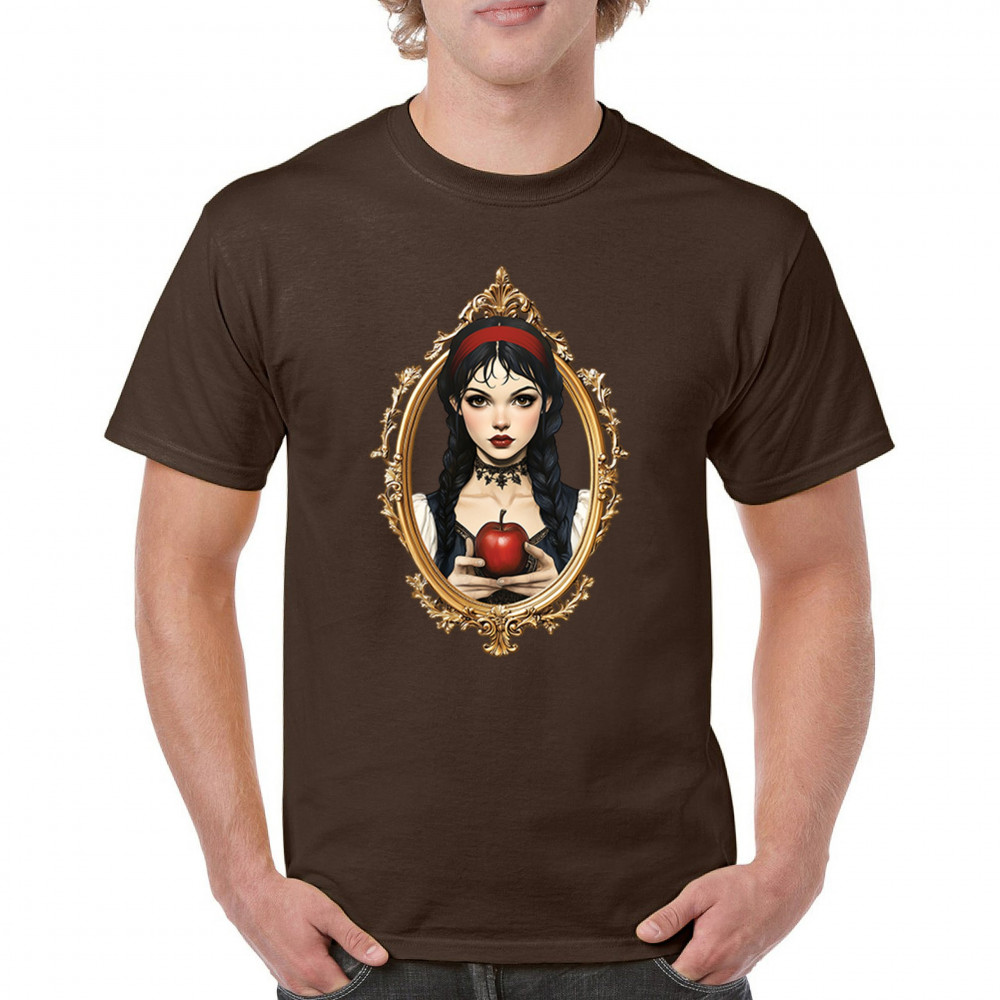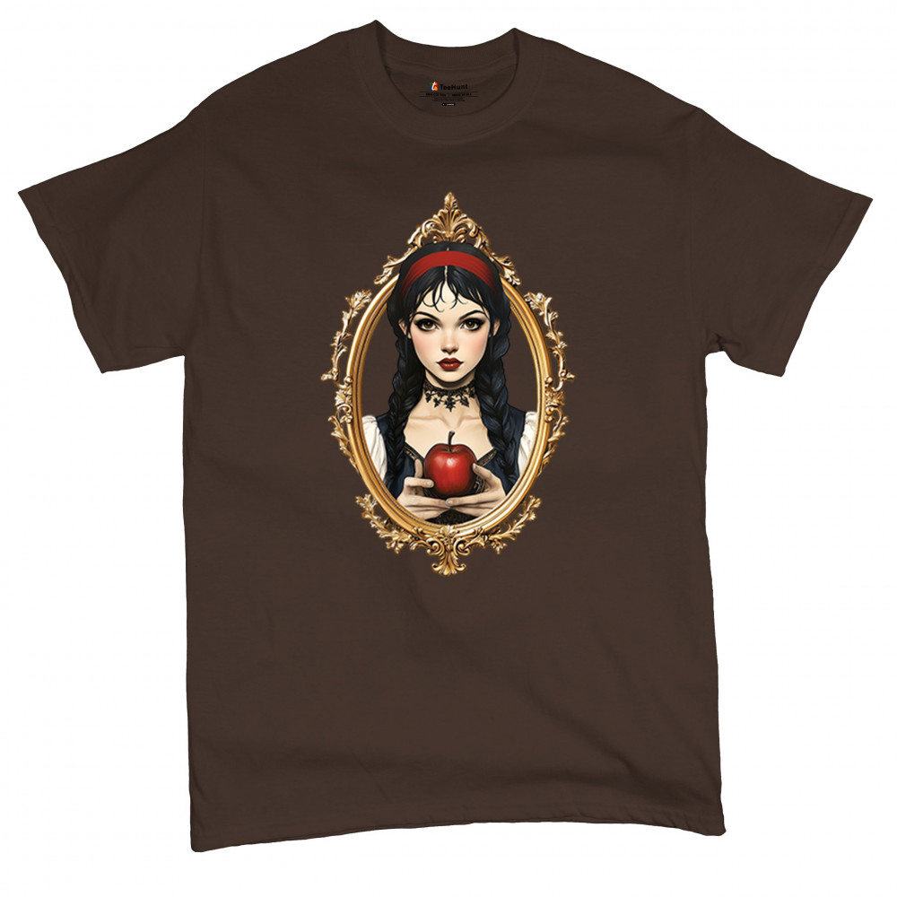 Dark fairytale design with red apple, gold frame, and Snow White vibes. A dreamy blend of fantasy, gothic style, and magical storytelling.