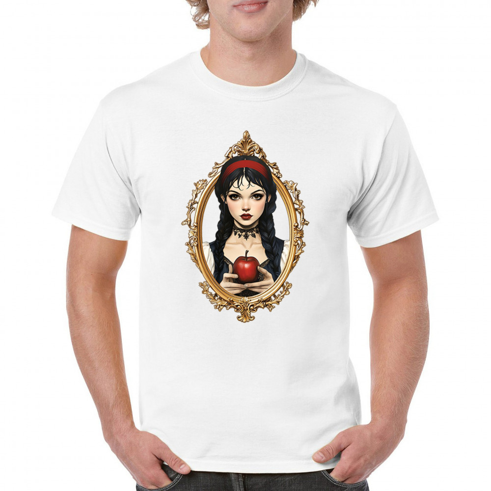 Dark fairytale design with red apple, gold frame, and Snow White vibes. A dreamy blend of fantasy, gothic style, and magical storytelling.