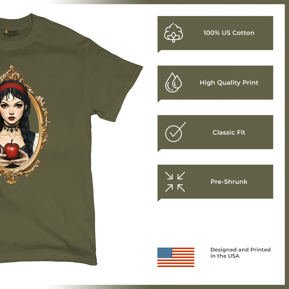 This enchanting design brings to life a gothic-inspired girl holding a red apple, encased in a regal vintage mirror frame. With elements pulled from Snow White, fairytales, and fantasy symbolism, it blends innocence and temptation with dark romanticism. Perfect for dreamers, collectors, and lovers of magical narratives and visual elegance.
