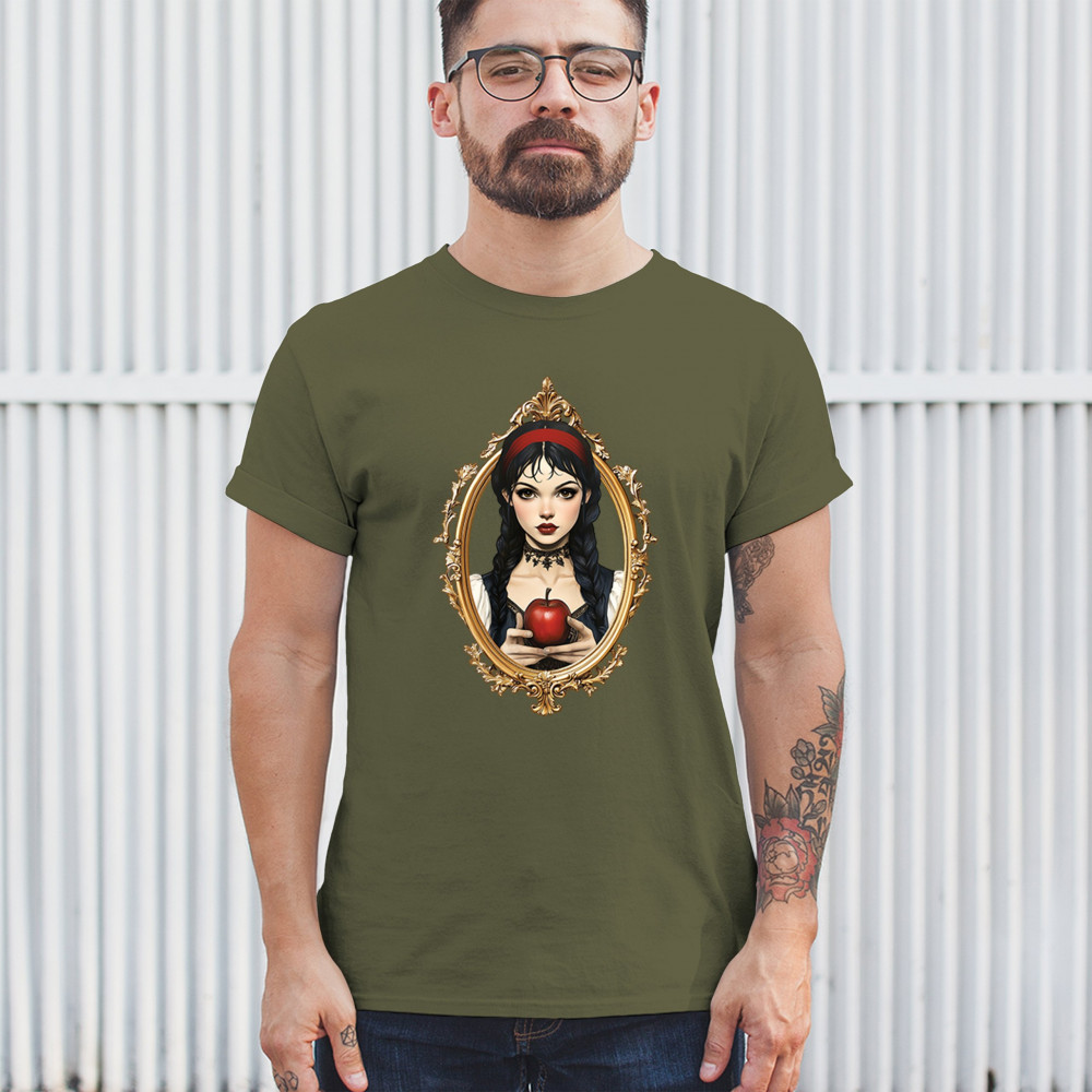 Dark fairytale design with red apple, gold frame, and Snow White vibes. A dreamy blend of fantasy, gothic style, and magical storytelling.