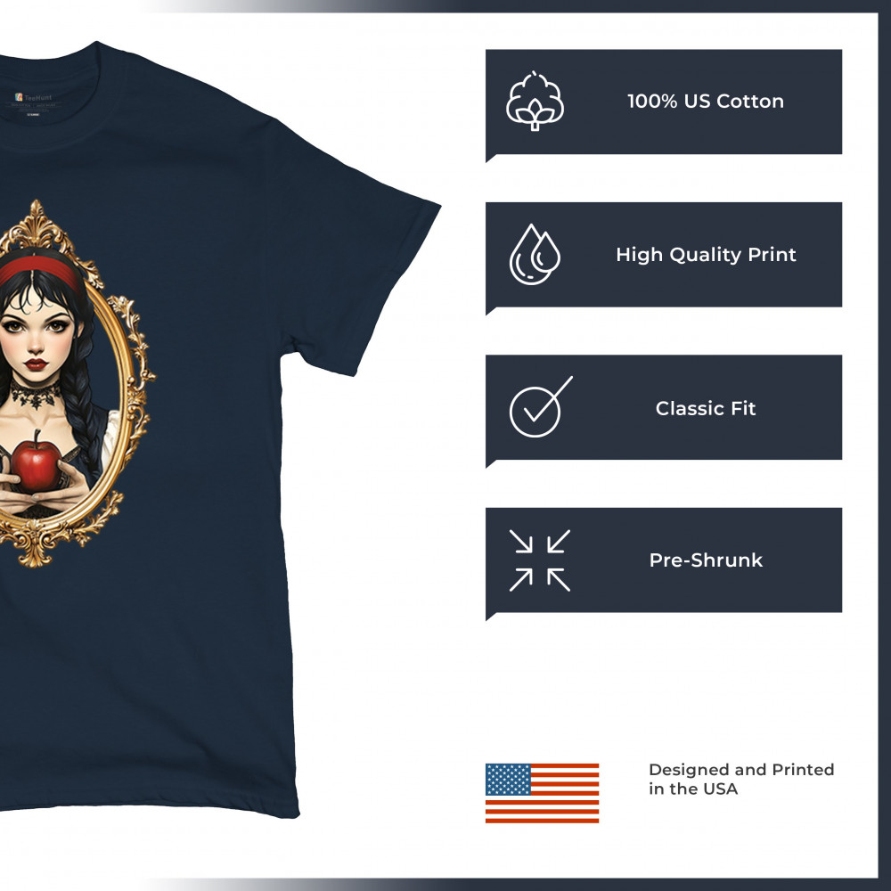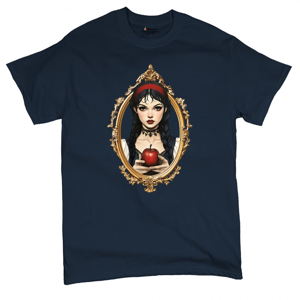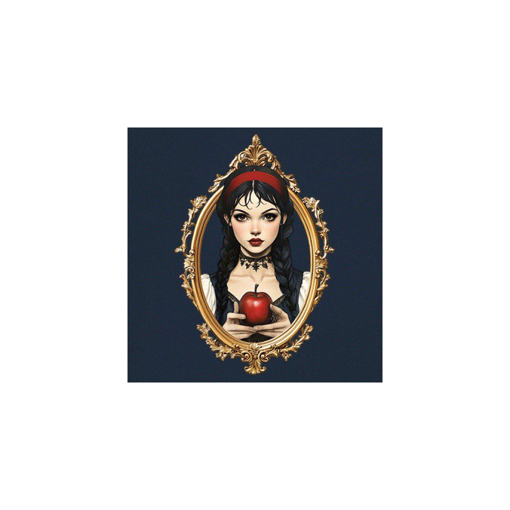 This enchanting design brings to life a gothic-inspired girl holding a red apple, encased in a regal vintage mirror frame. With elements pulled from Snow White, fairytales, and fantasy symbolism, it blends innocence and temptation with dark romanticism. Perfect for dreamers, collectors, and lovers of magical narratives and visual elegance.