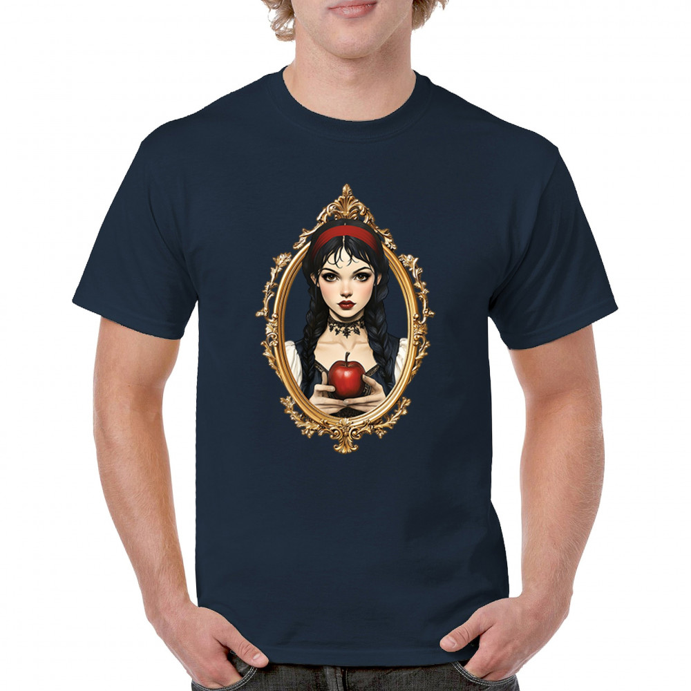 Dark fairytale design with red apple, gold frame, and Snow White vibes. A dreamy blend of fantasy, gothic style, and magical storytelling.