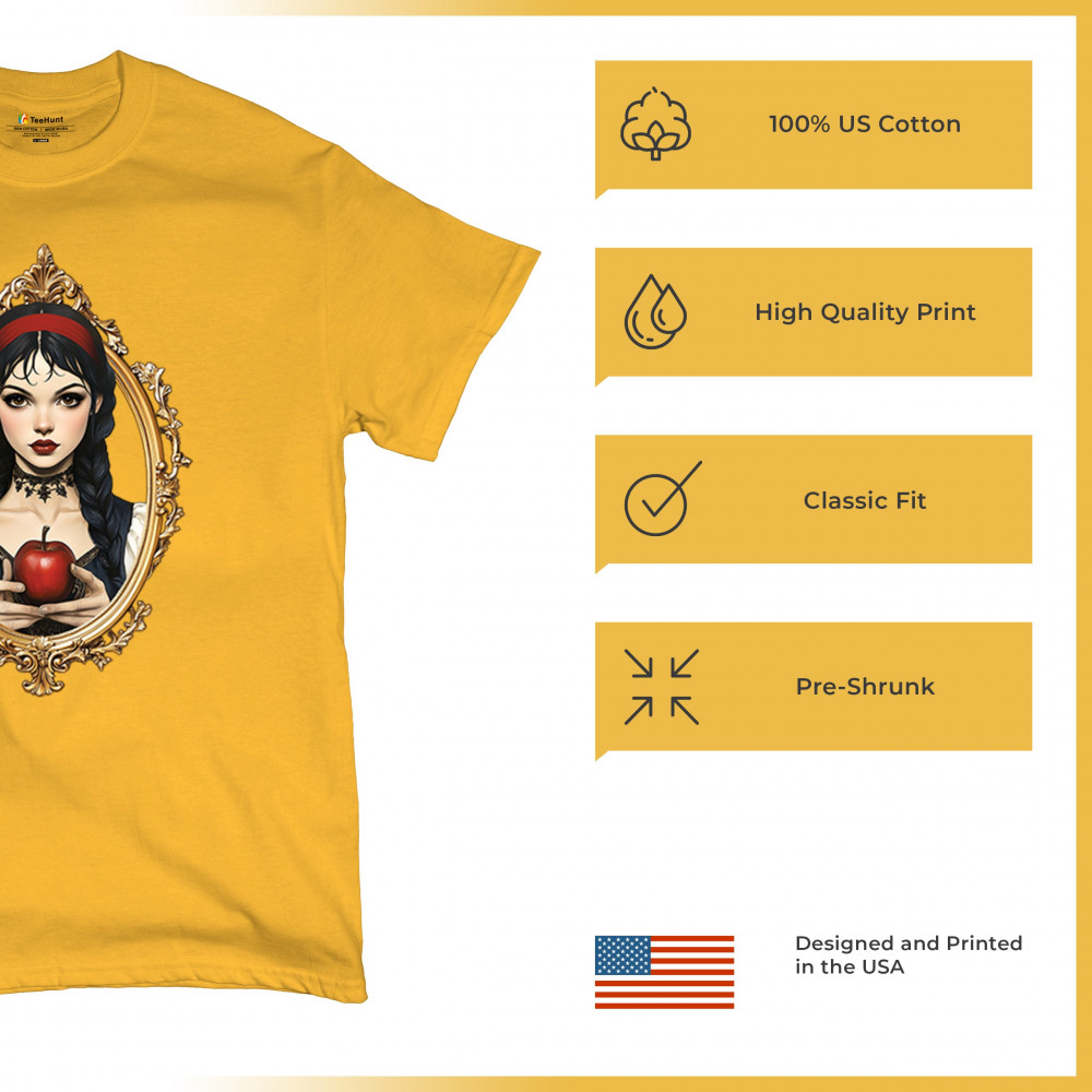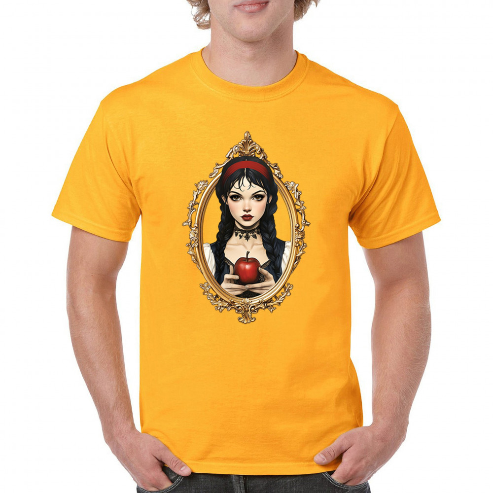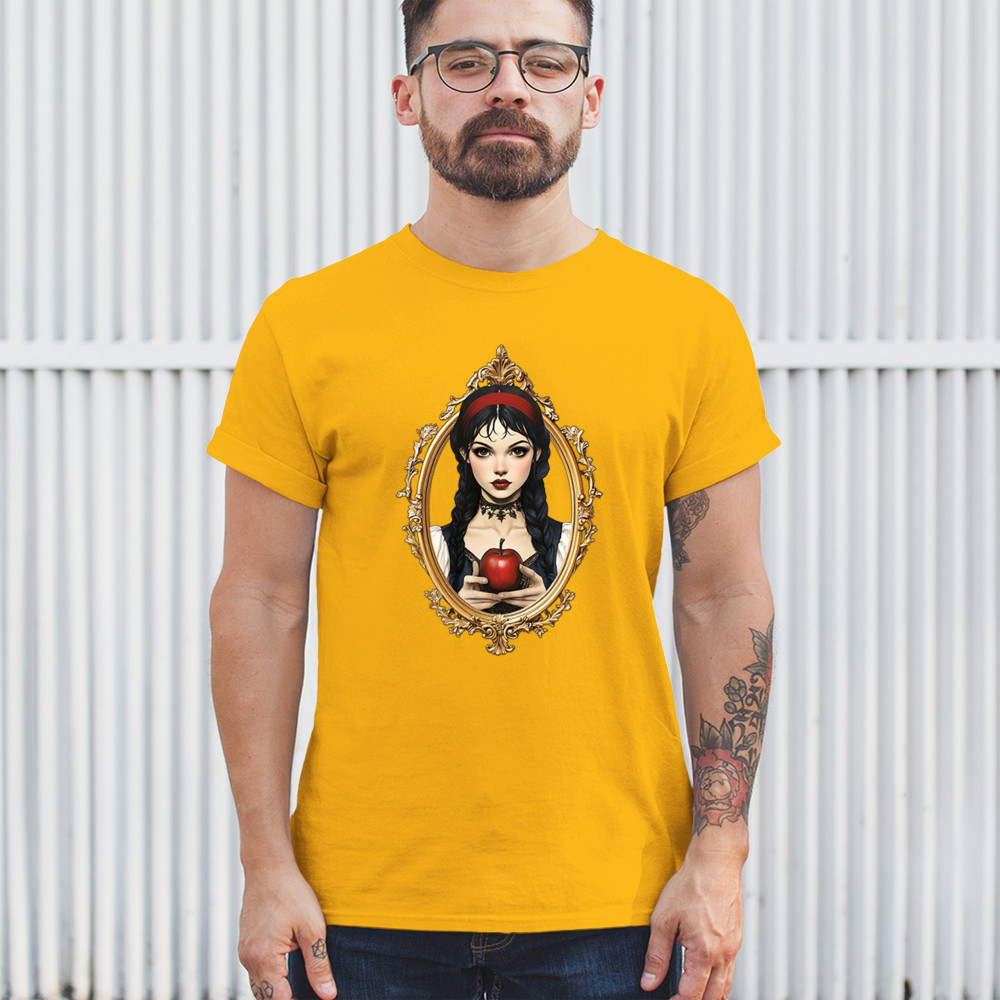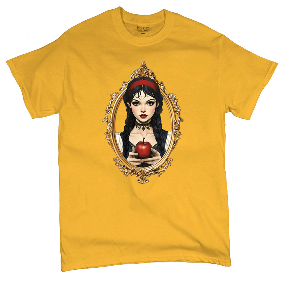 Dark fairytale design with red apple, gold frame, and Snow White vibes. A dreamy blend of fantasy, gothic style, and magical storytelling.