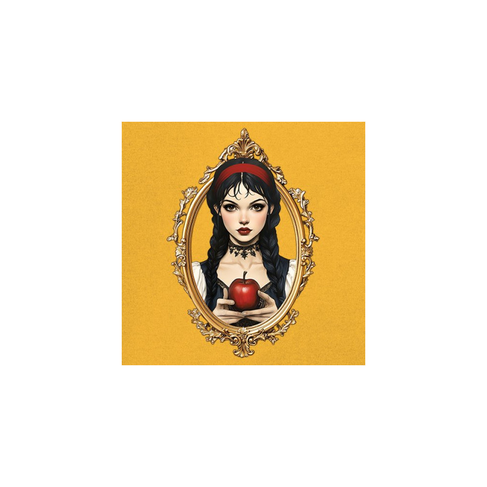 This enchanting design brings to life a gothic-inspired girl holding a red apple, encased in a regal vintage mirror frame. With elements pulled from Snow White, fairytales, and fantasy symbolism, it blends innocence and temptation with dark romanticism. Perfect for dreamers, collectors, and lovers of magical narratives and visual elegance.