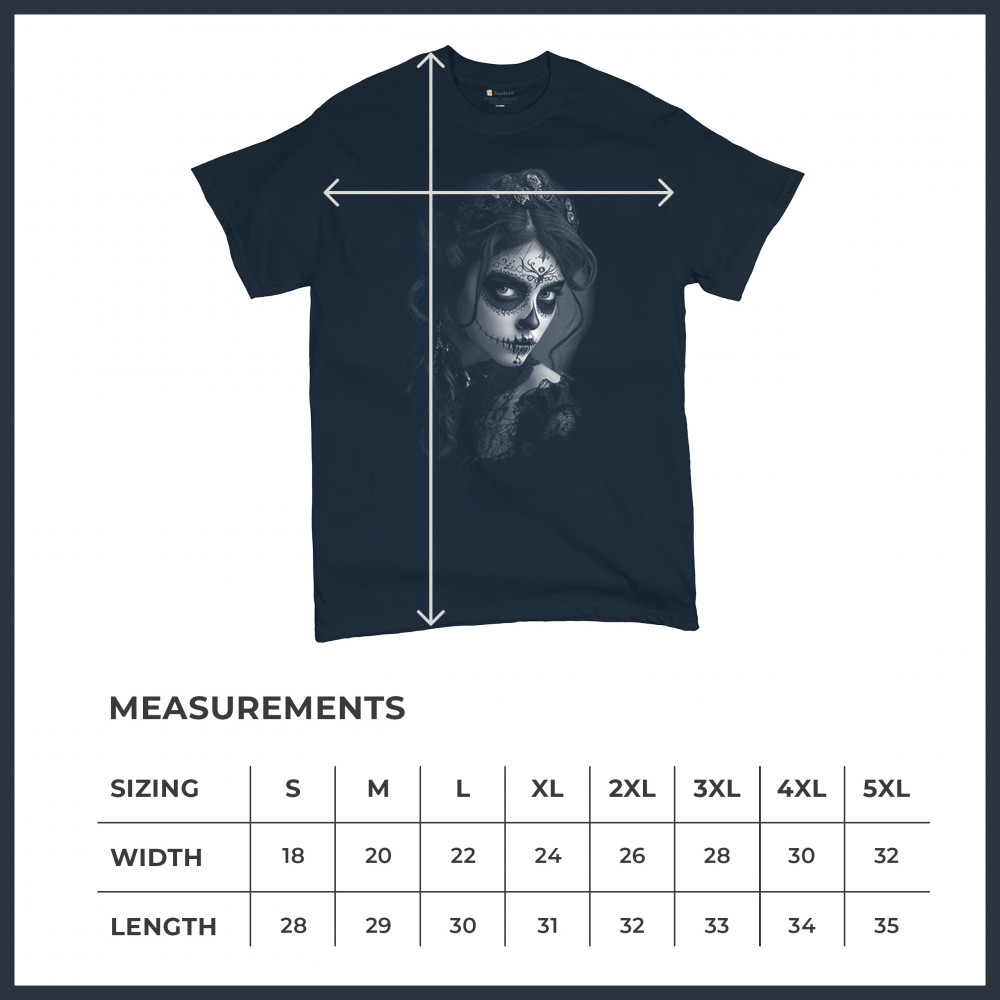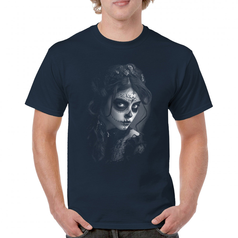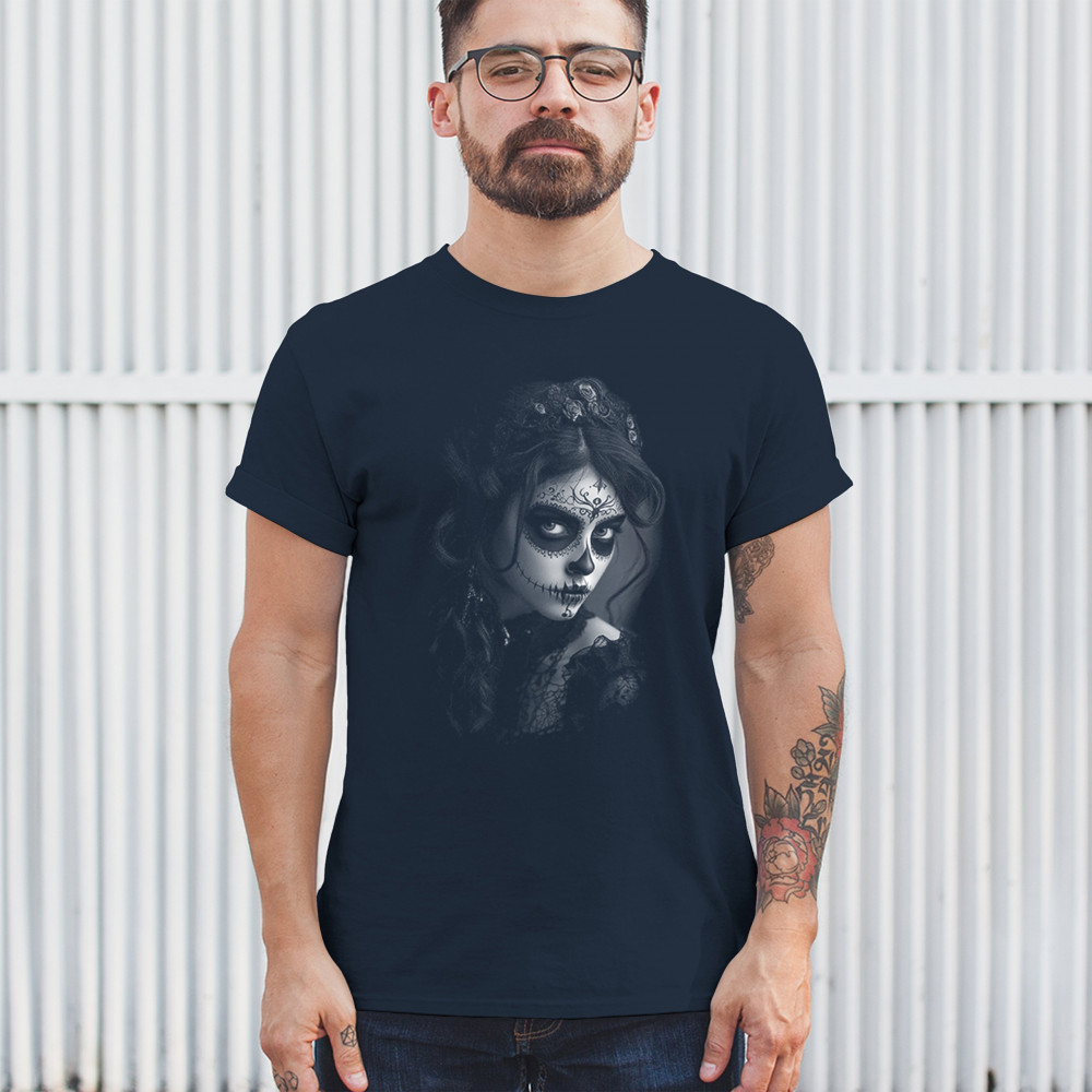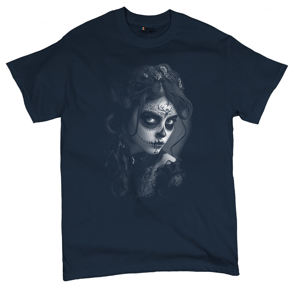 Showcasing a gothic woman with a sugar skull face, this black-and-white design blends DÃa de los Muertos tradition with dark elegance. Intricate face makeup, detailed lace, and a bold monochrome aesthetic create a dramatic visual tribute. A perfect piece for lovers of skull motifs, alt style, and haunting beauty.