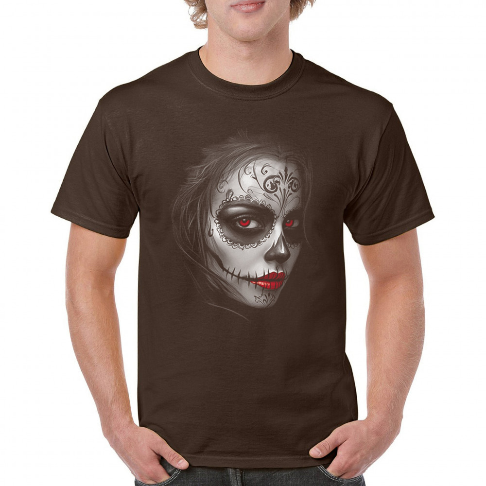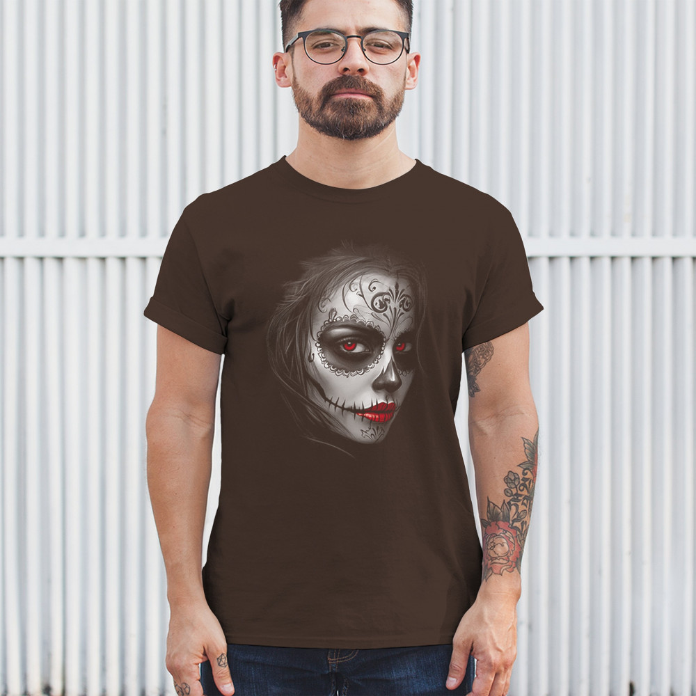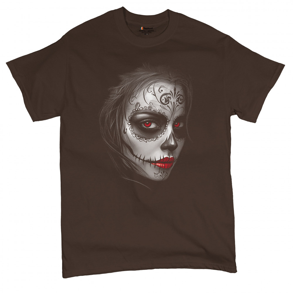 Glowing red eyes and red lips bring this sugar skull design to life. Featuring floral skull makeup, dark shadows, and gothic energy, it's a perfect pick for Halloween, DÃa de los Muertos, or alt culture fashion. Ideal for fans of bold beauty, spooky glamour, and skull art with an edge.