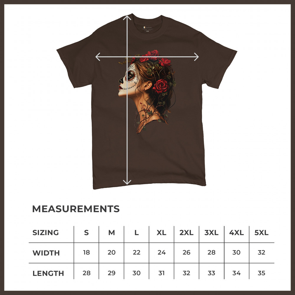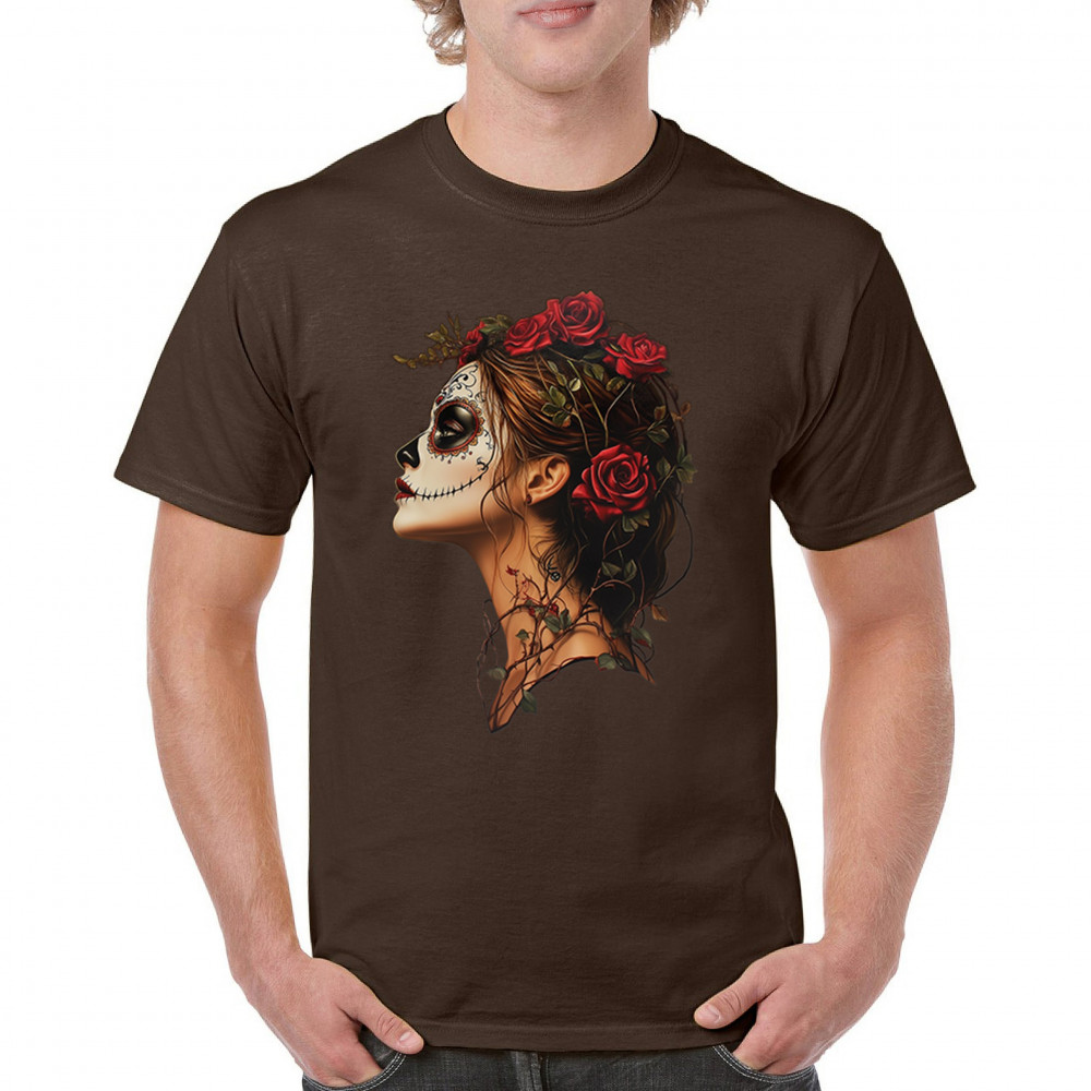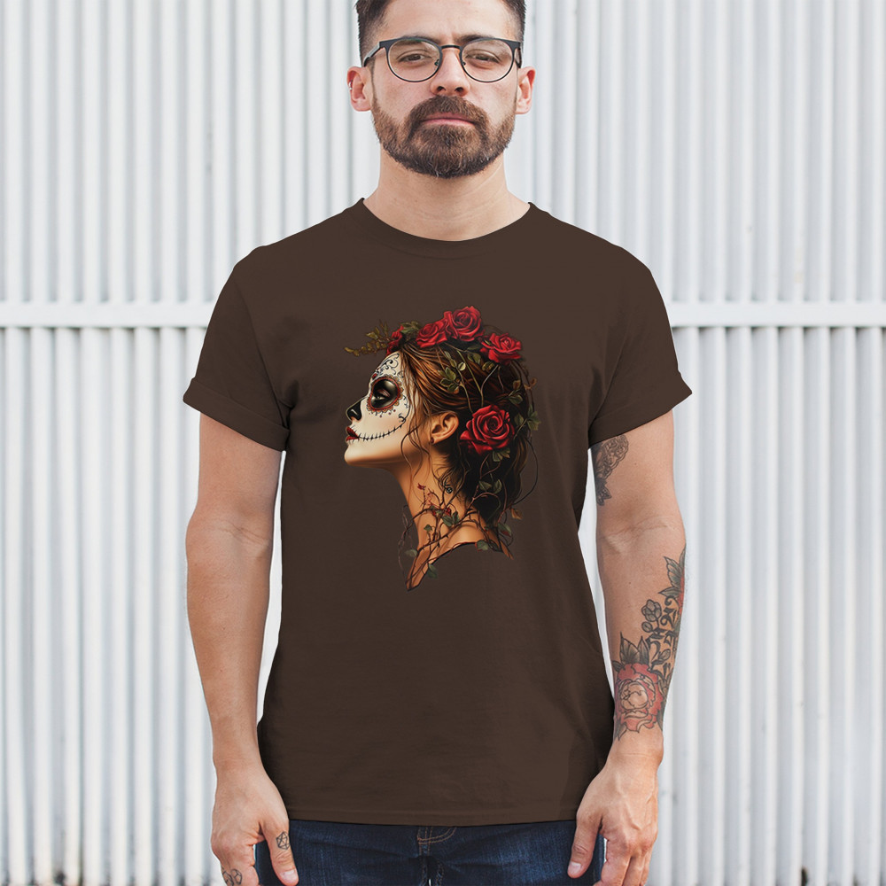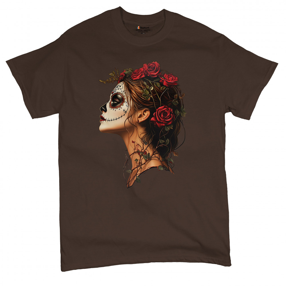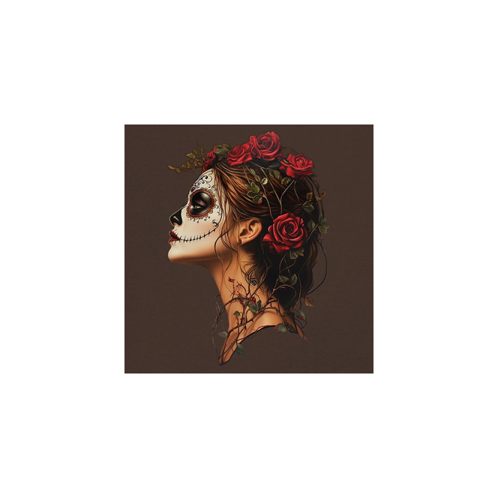 Celebrate feminine power and gothic elegance with this captivating DÃa de los Muertos design. Featuring a woman in profile with sugar skull makeup, blooming red roses, natural vines, dark hair, and symbolic floral skull art, this bold tribute captures beauty, death, and strength in one romantic, detailed visual.