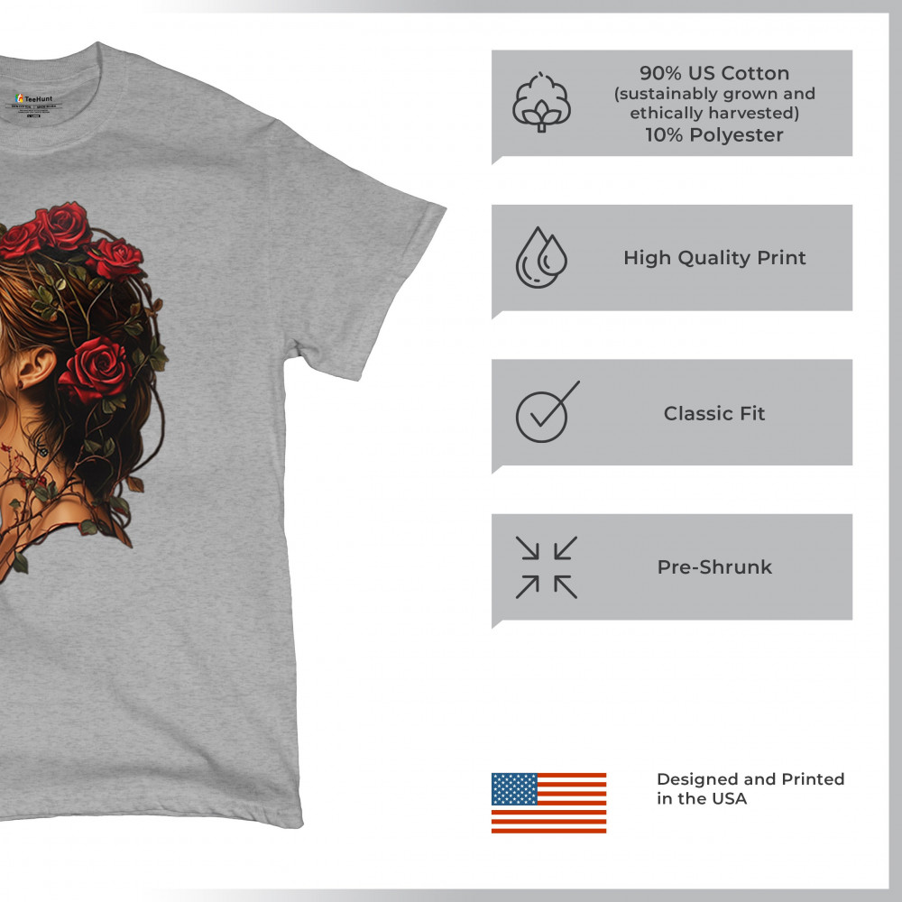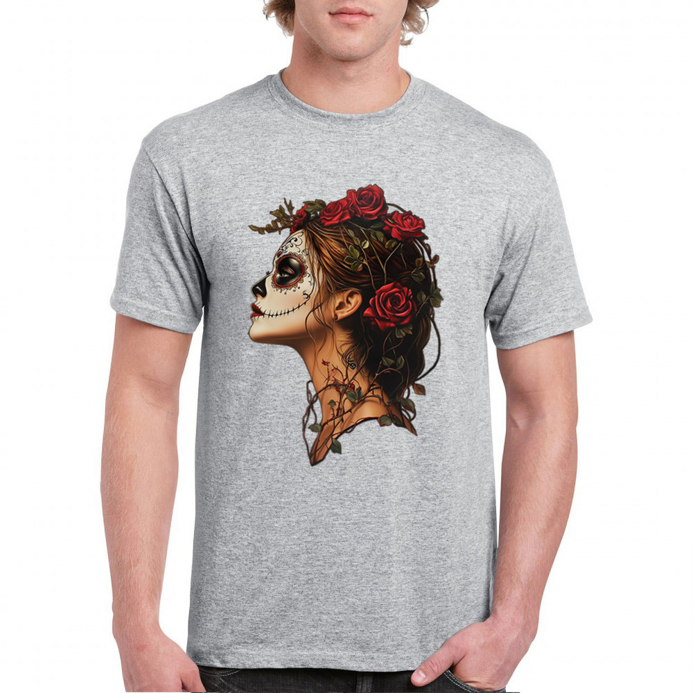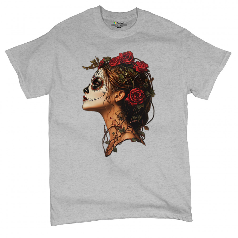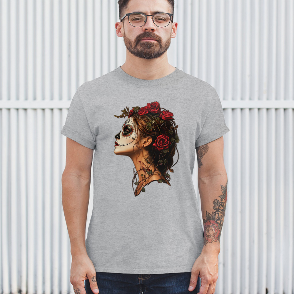 Celebrate feminine power and gothic elegance with this captivating DÃa de los Muertos design. Featuring a woman in profile with sugar skull makeup, blooming red roses, natural vines, dark hair, and symbolic floral skull art, this bold tribute captures beauty, death, and strength in one romantic, detailed visual.
