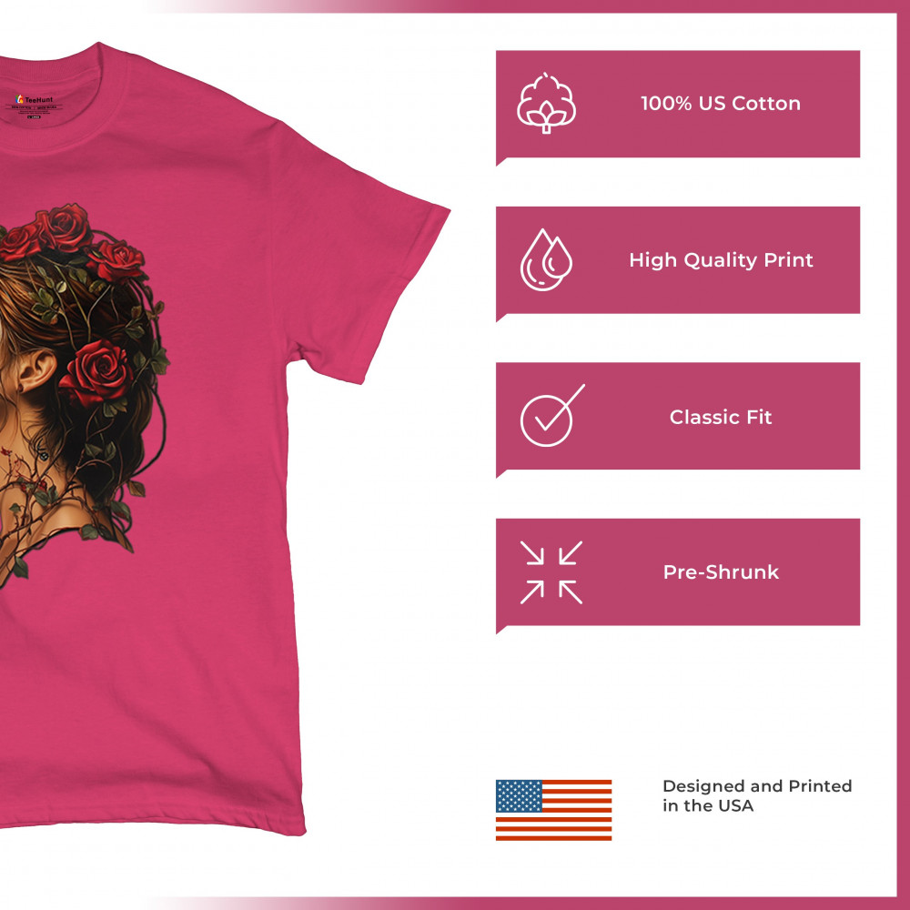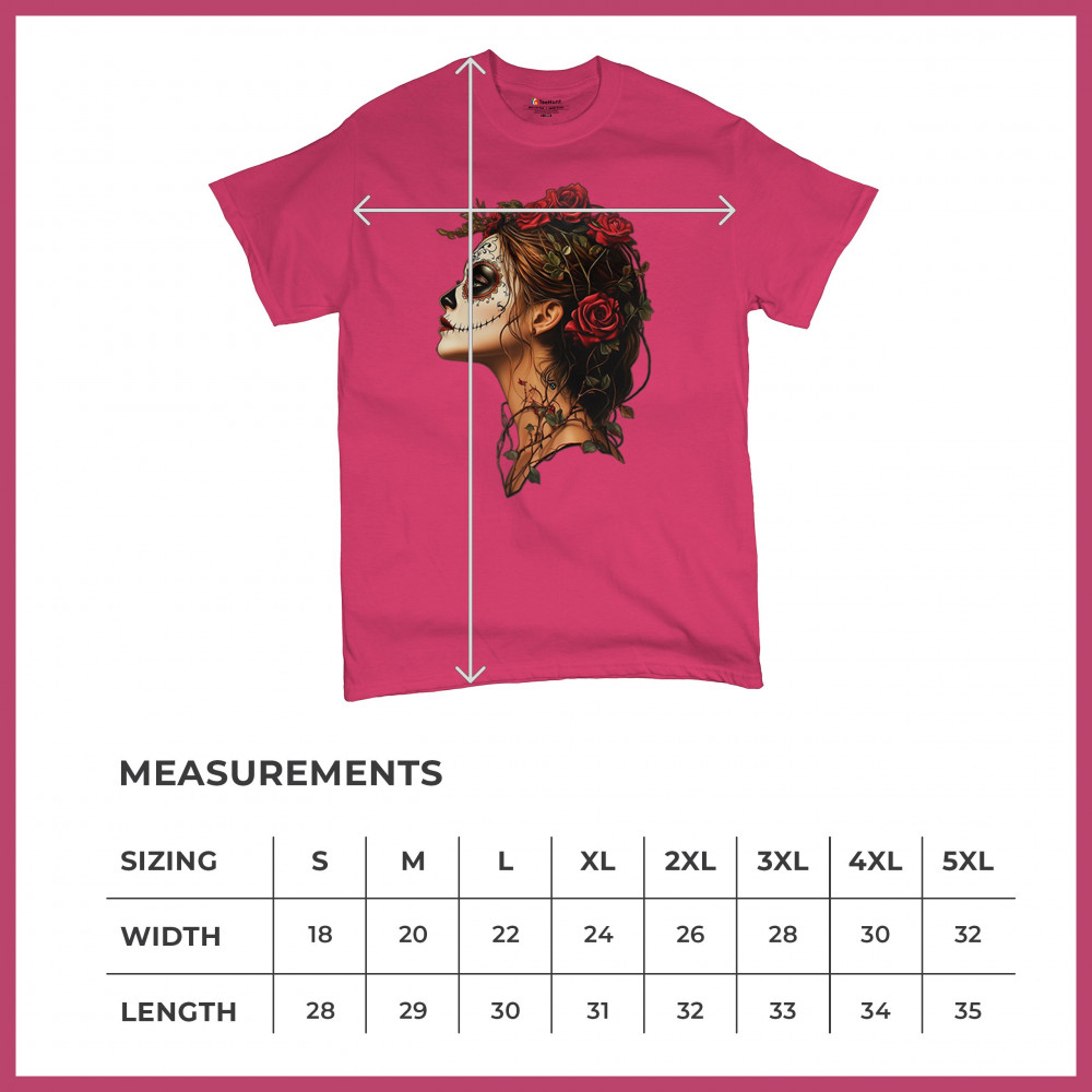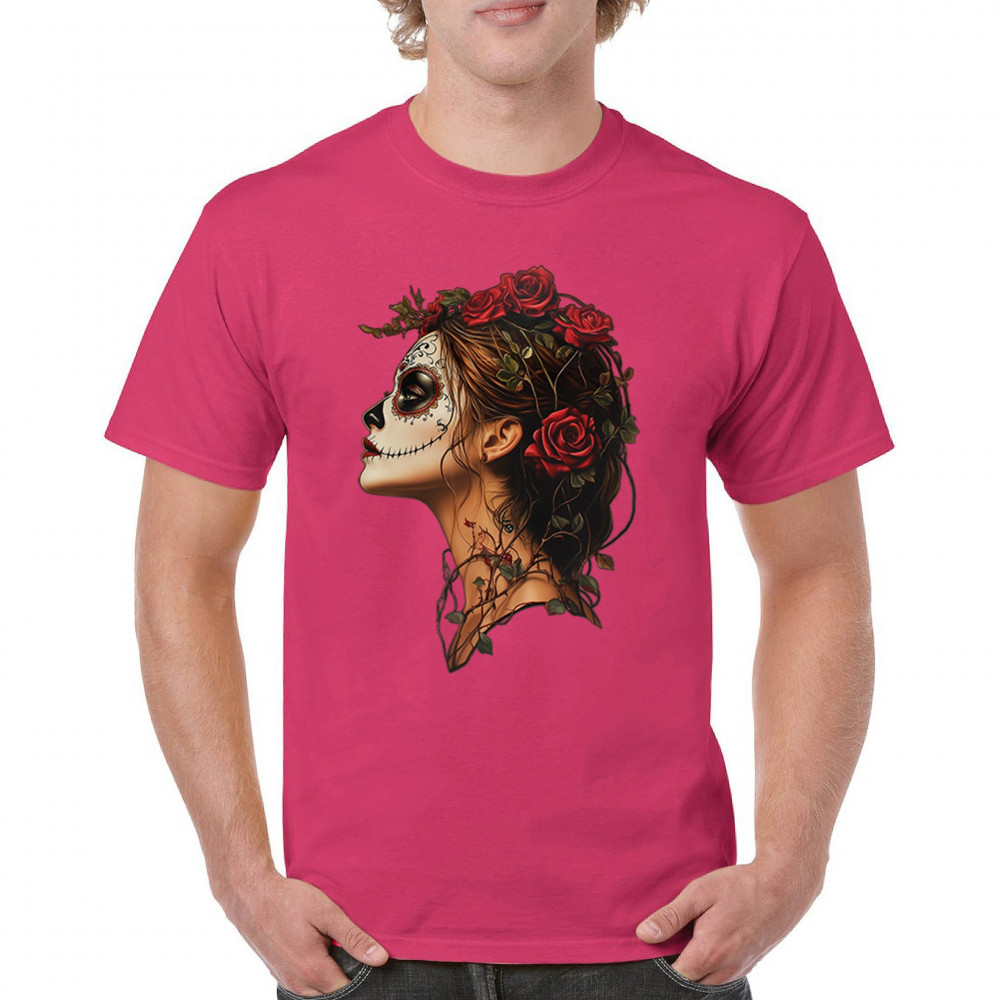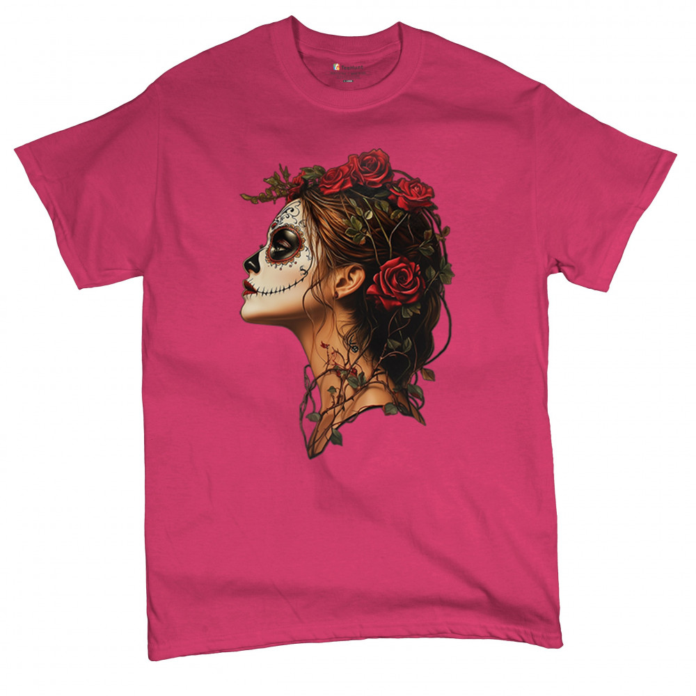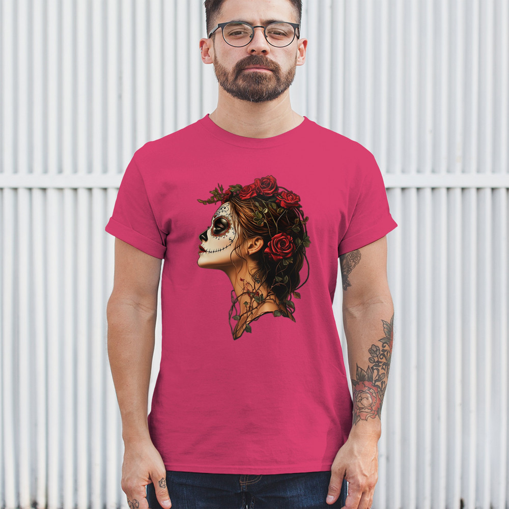 Celebrate feminine power and gothic elegance with this captivating DÃa de los Muertos design. Featuring a woman in profile with sugar skull makeup, blooming red roses, natural vines, dark hair, and symbolic floral skull art, this bold tribute captures beauty, death, and strength in one romantic, detailed visual.