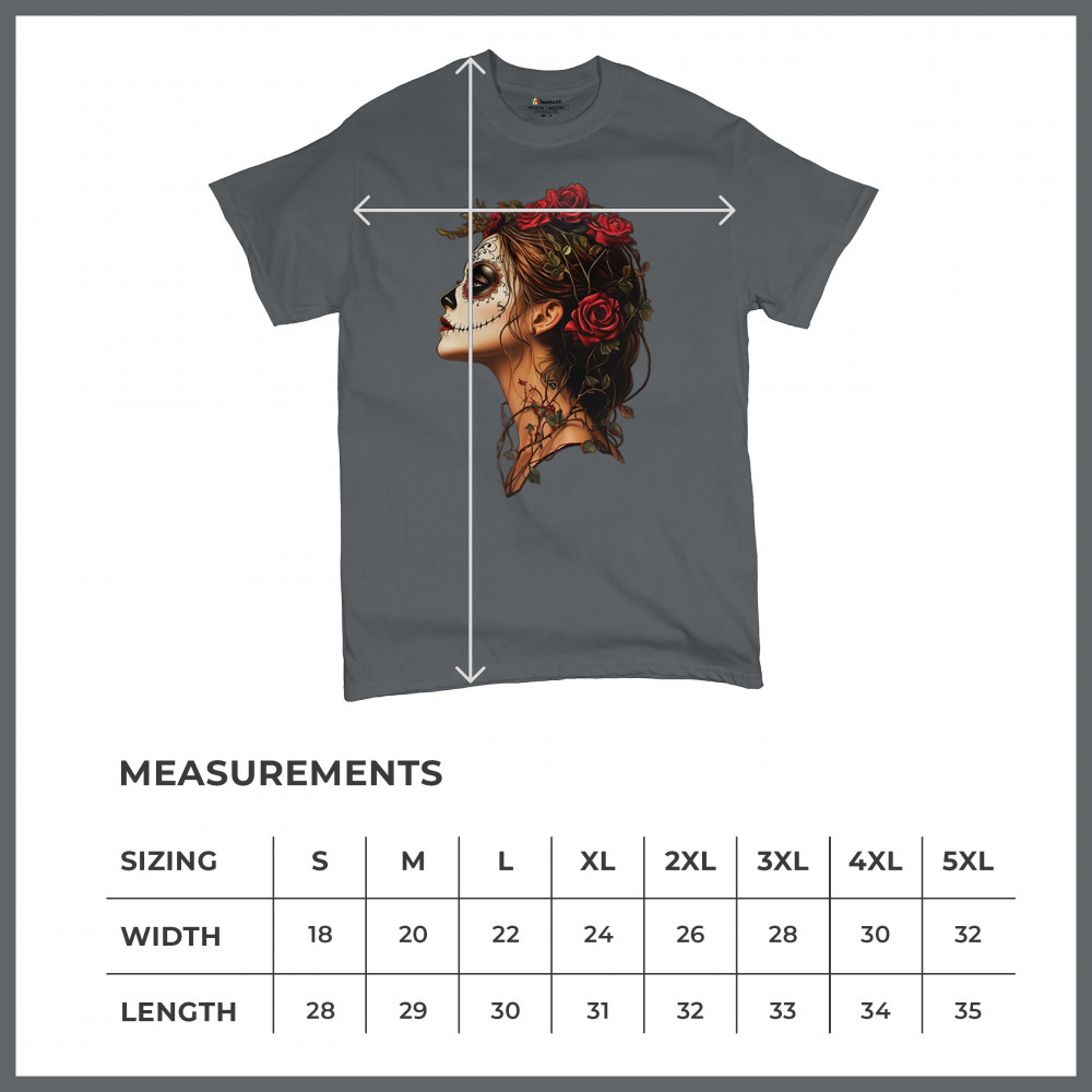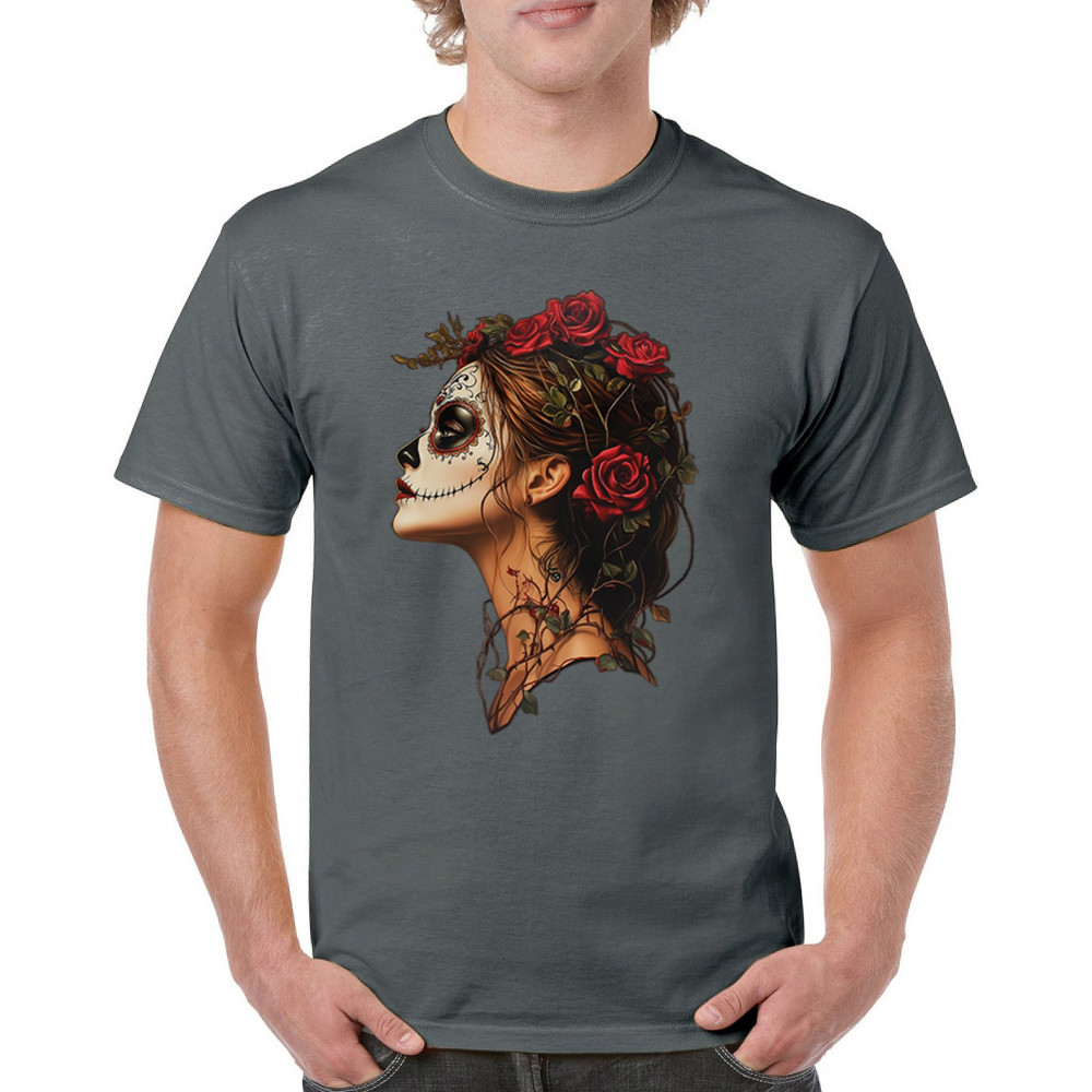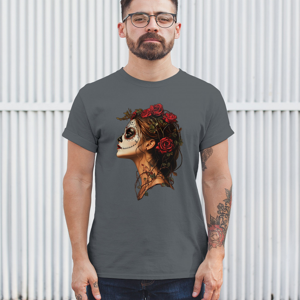 Celebrate feminine power and gothic elegance with this captivating DÃa de los Muertos design. Featuring a woman in profile with sugar skull makeup, blooming red roses, natural vines, dark hair, and symbolic floral skull art, this bold tribute captures beauty, death, and strength in one romantic, detailed visual.