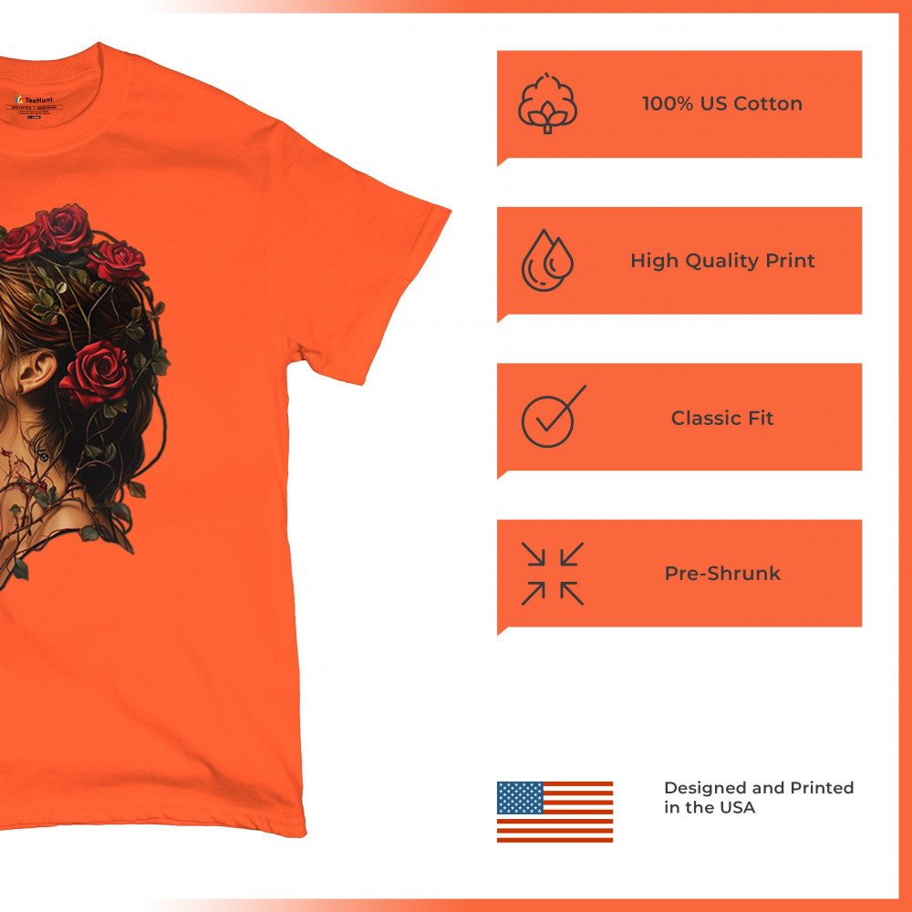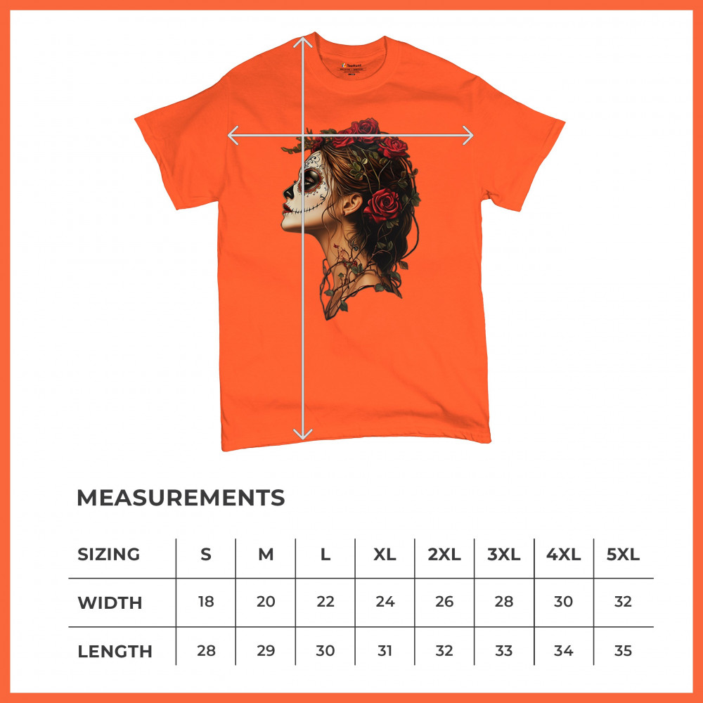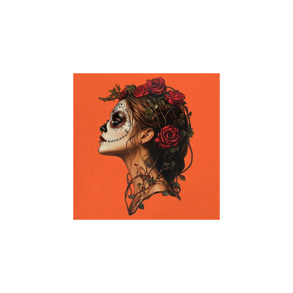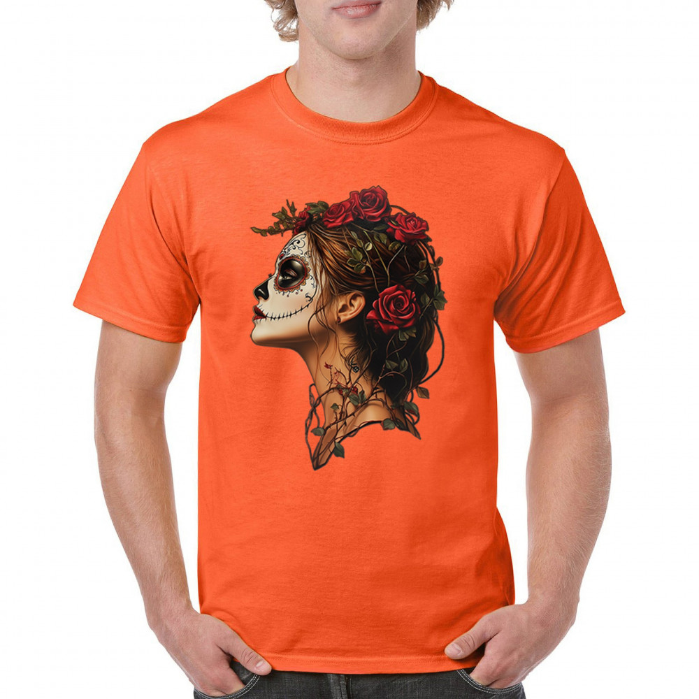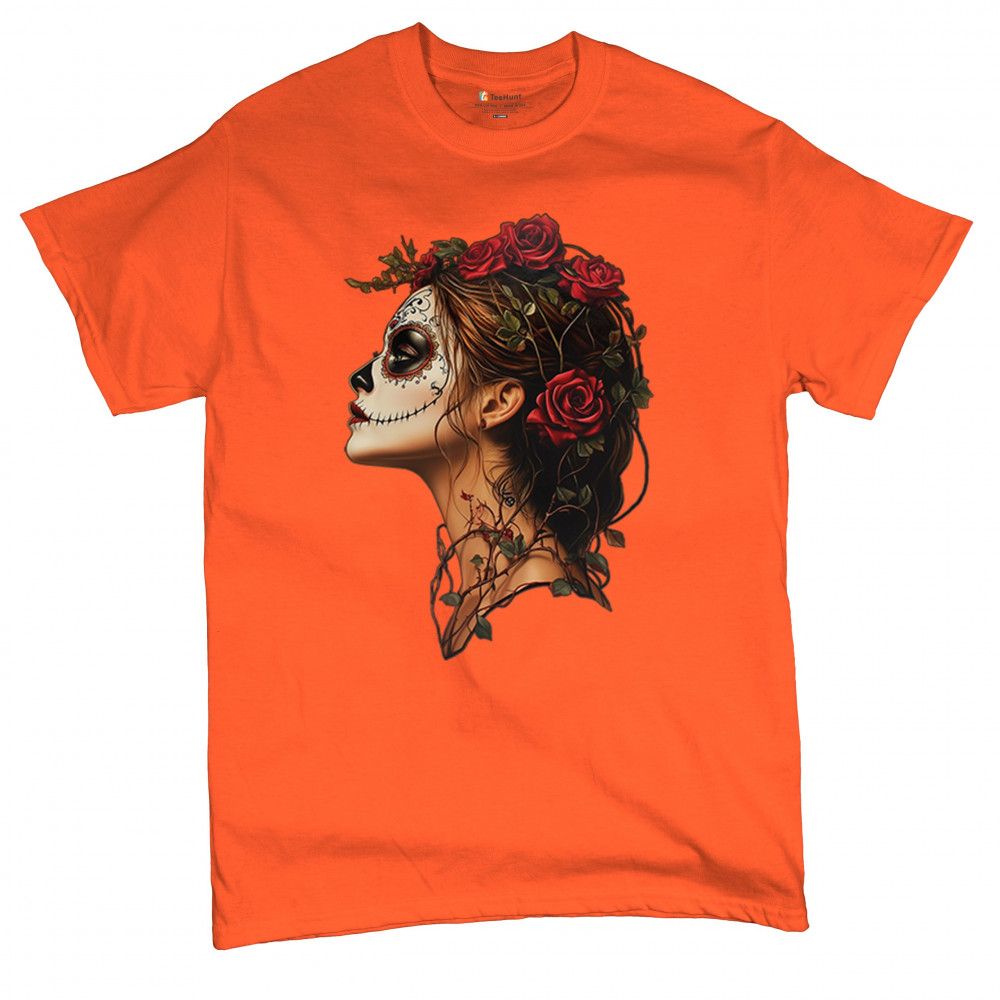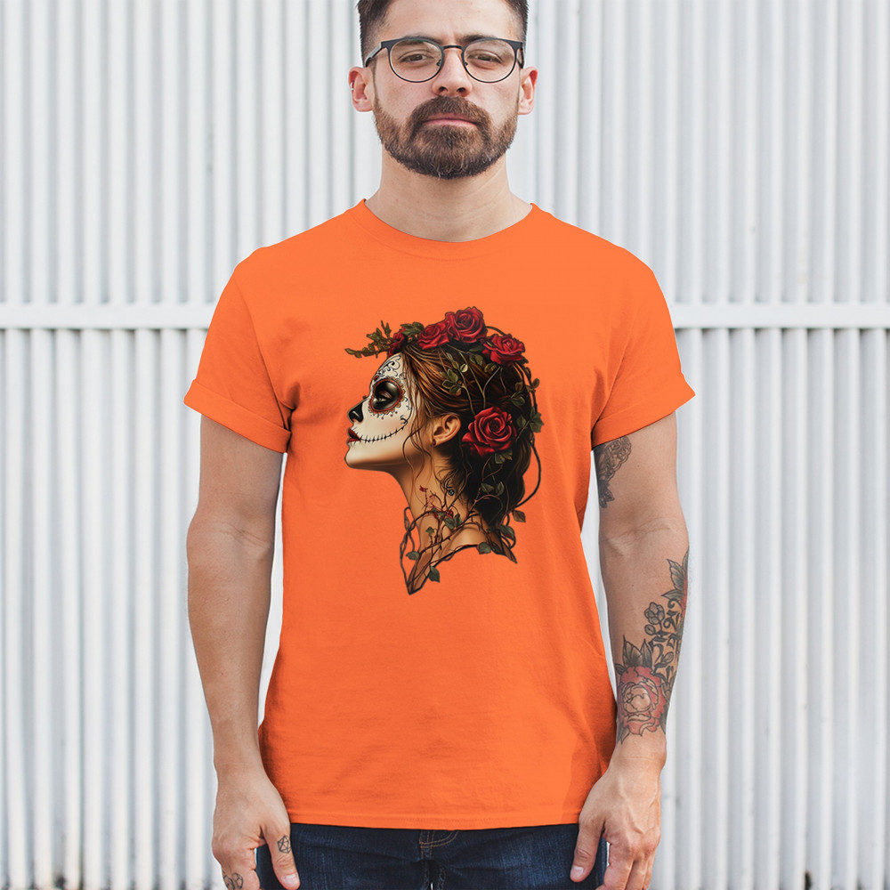 Celebrate feminine power and gothic elegance with this captivating DÃa de los Muertos design. Featuring a woman in profile with sugar skull makeup, blooming red roses, natural vines, dark hair, and symbolic floral skull art, this bold tribute captures beauty, death, and strength in one romantic, detailed visual.