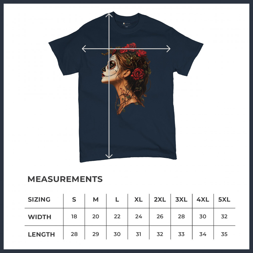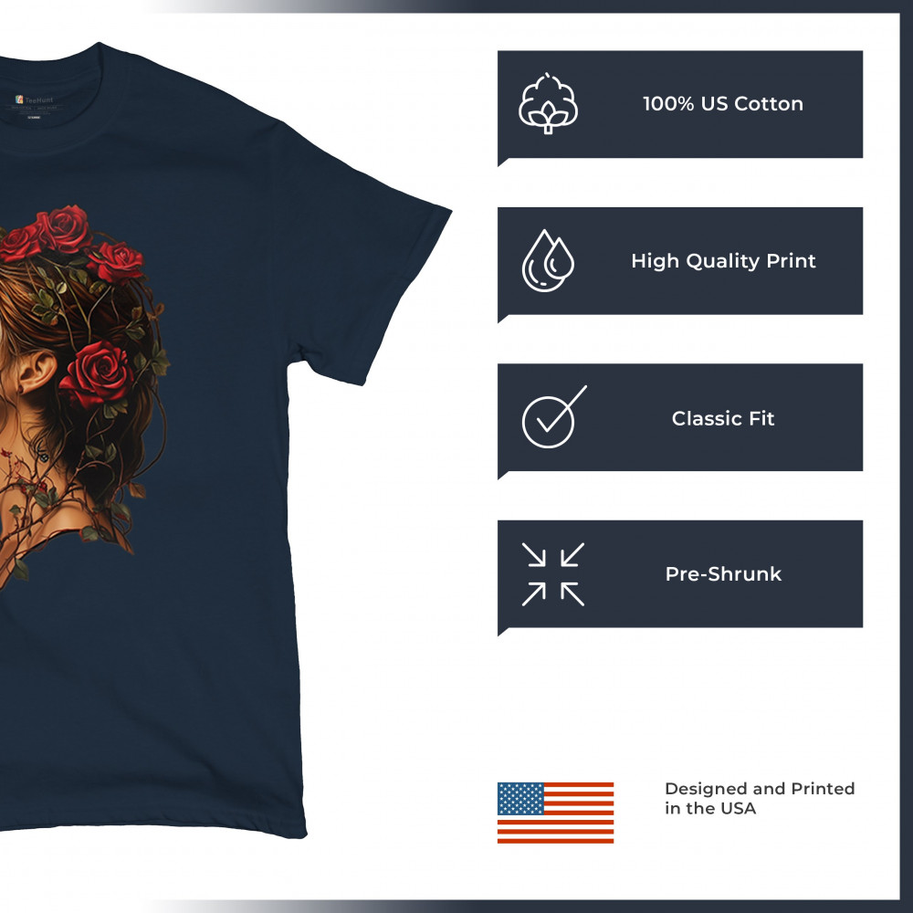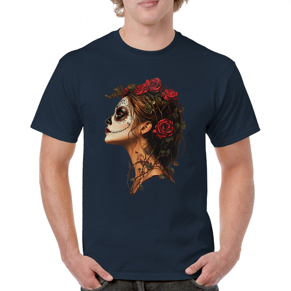 Celebrate feminine power and gothic elegance with this captivating DÃa de los Muertos design. Featuring a woman in profile with sugar skull makeup, blooming red roses, natural vines, dark hair, and symbolic floral skull art, this bold tribute captures beauty, death, and strength in one romantic, detailed visual.