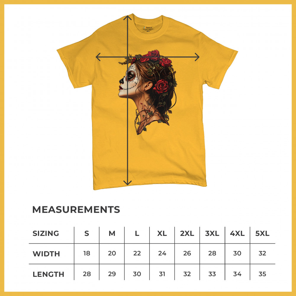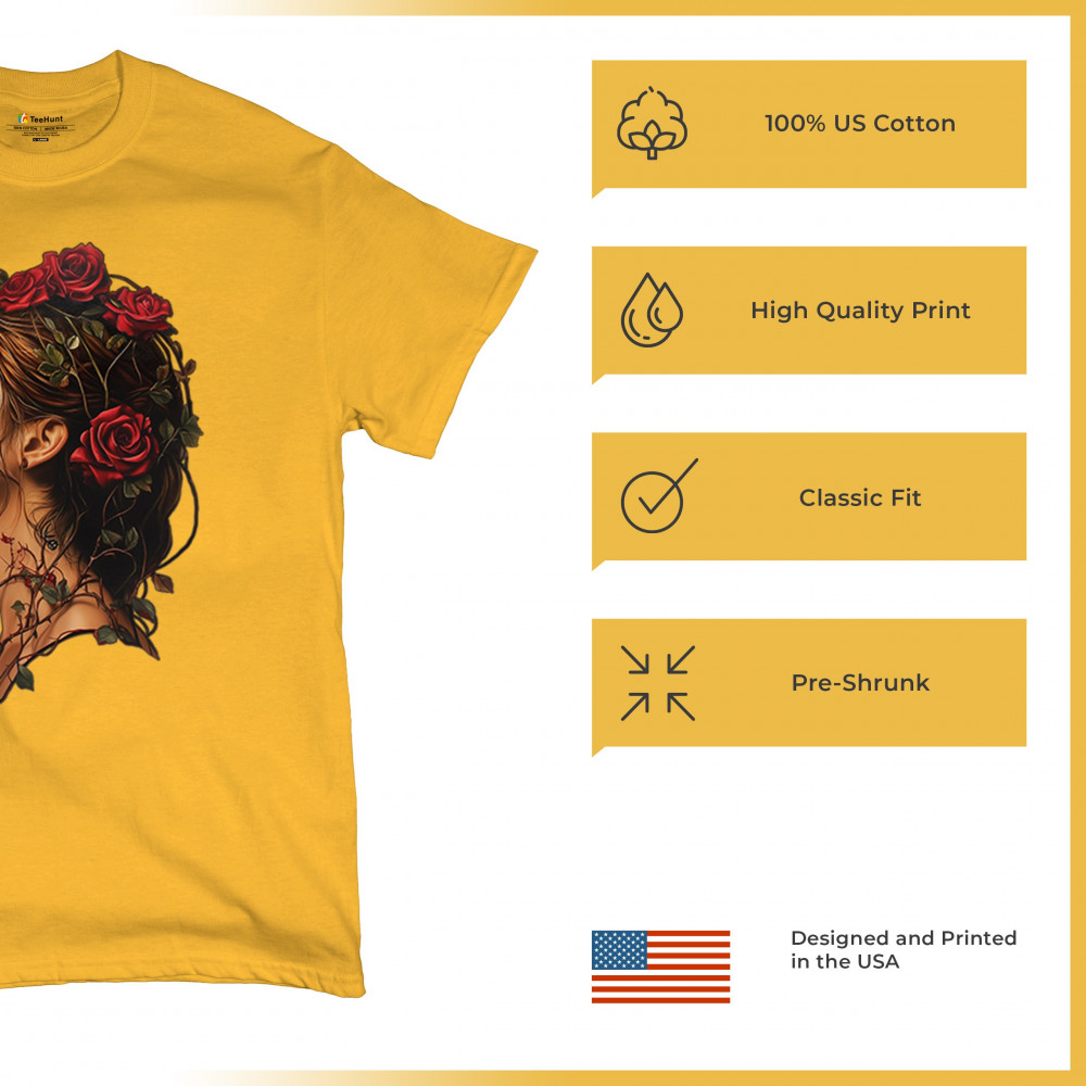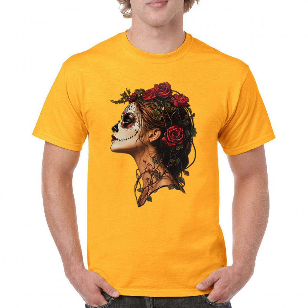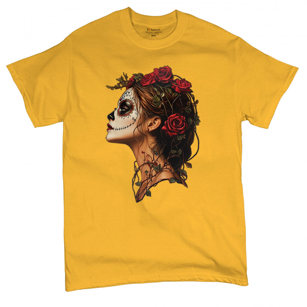 Celebrate feminine power and gothic elegance with this captivating DÃa de los Muertos design. Featuring a woman in profile with sugar skull makeup, blooming red roses, natural vines, dark hair, and symbolic floral skull art, this bold tribute captures beauty, death, and strength in one romantic, detailed visual.