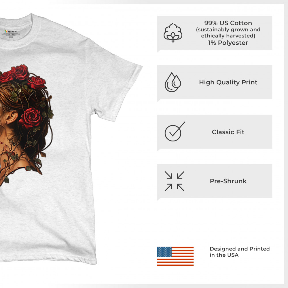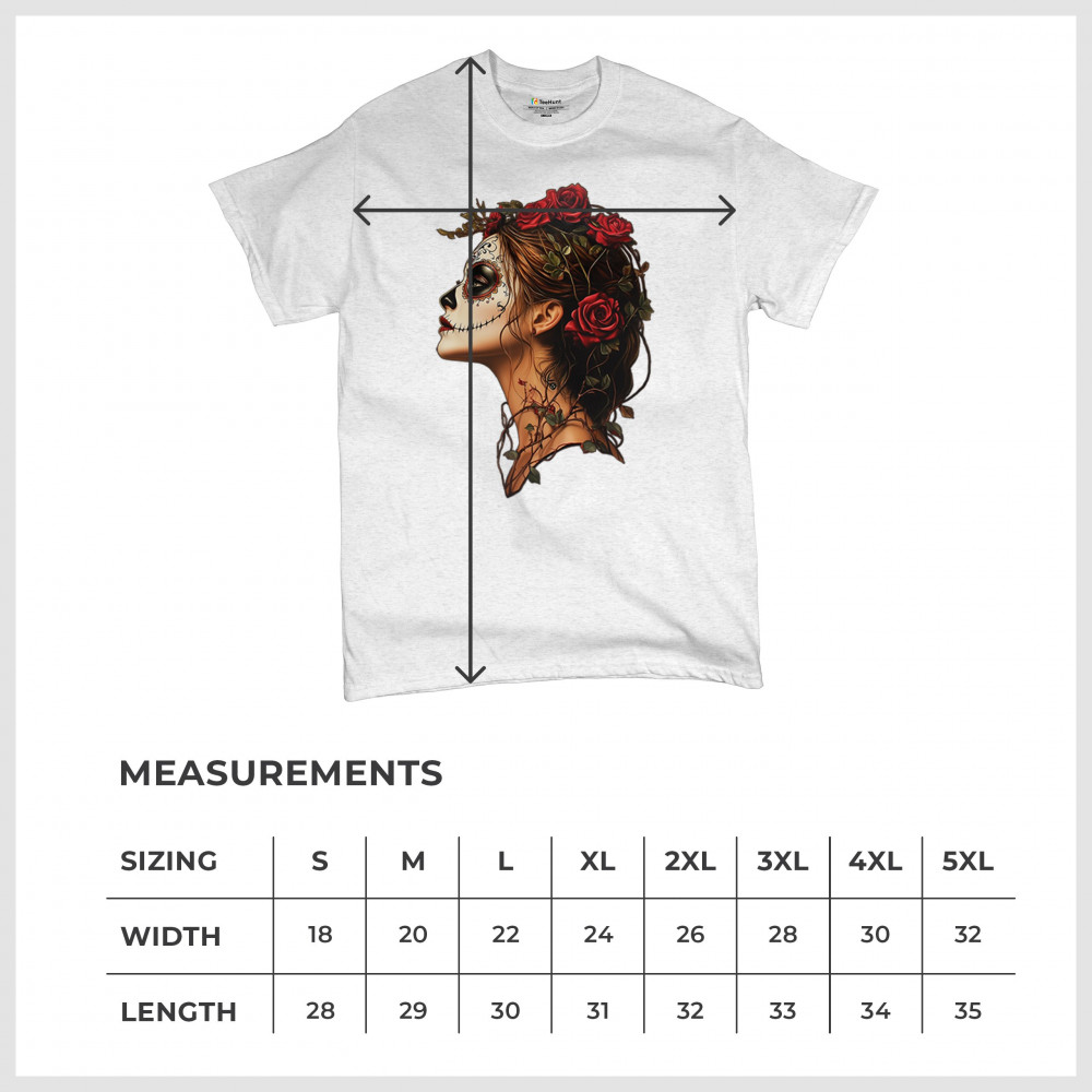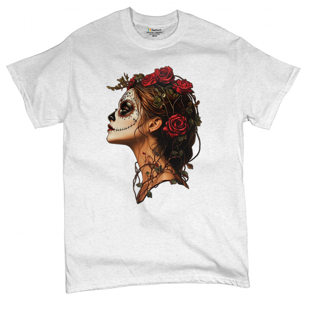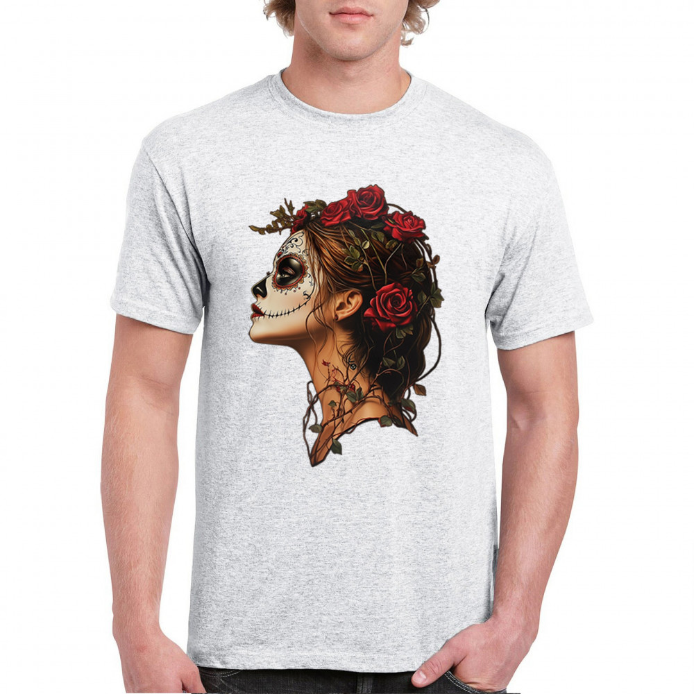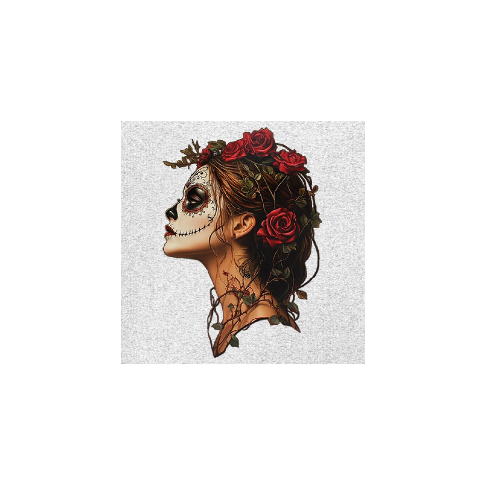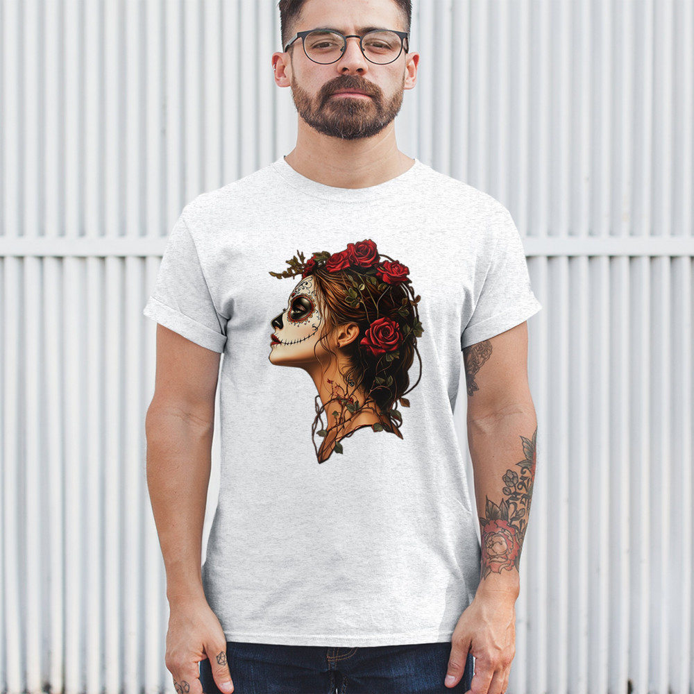 Celebrate feminine power and gothic elegance with this captivating DÃa de los Muertos design. Featuring a woman in profile with sugar skull makeup, blooming red roses, natural vines, dark hair, and symbolic floral skull art, this bold tribute captures beauty, death, and strength in one romantic, detailed visual.