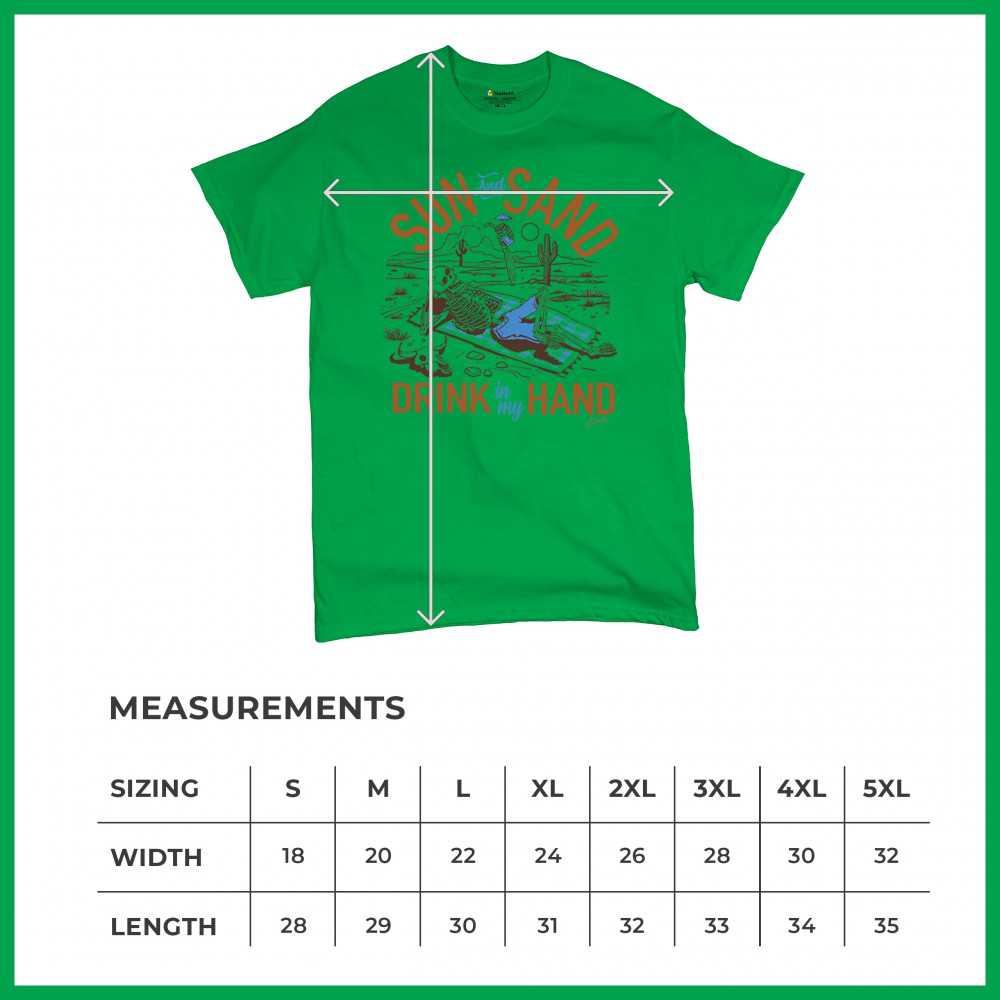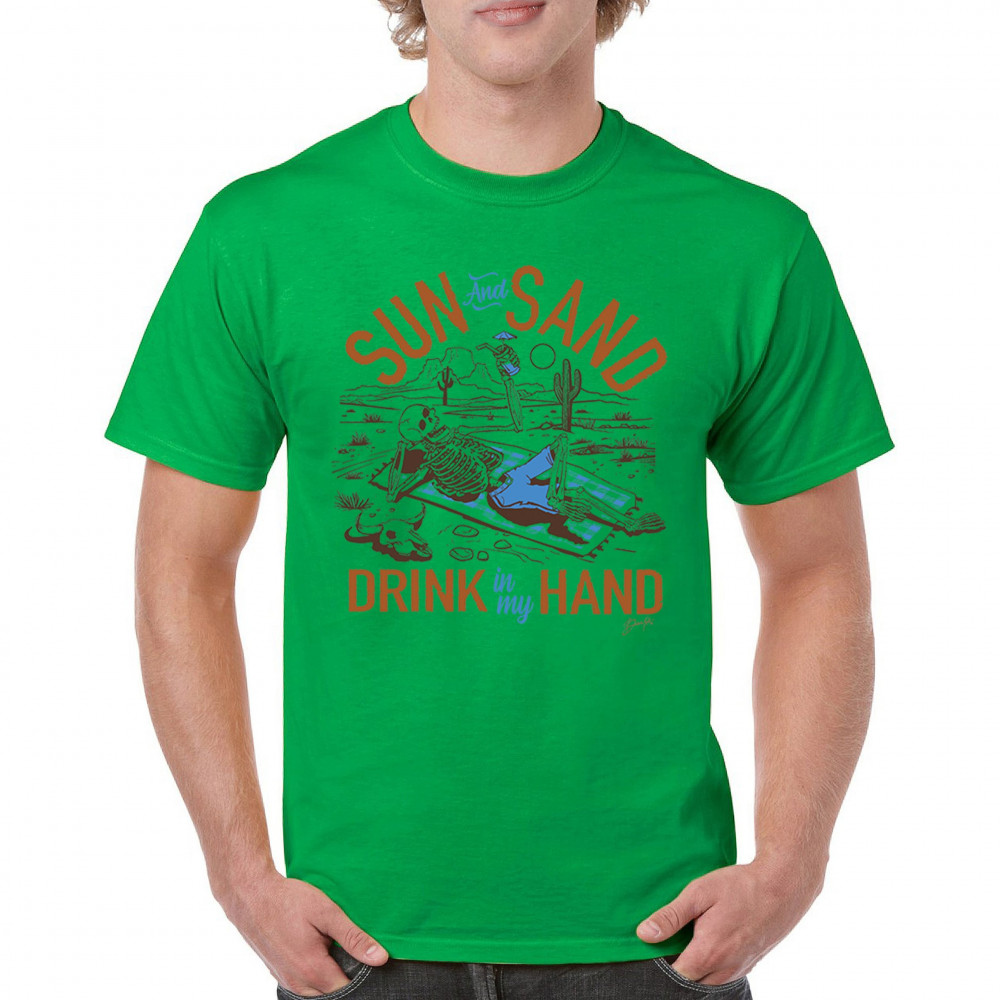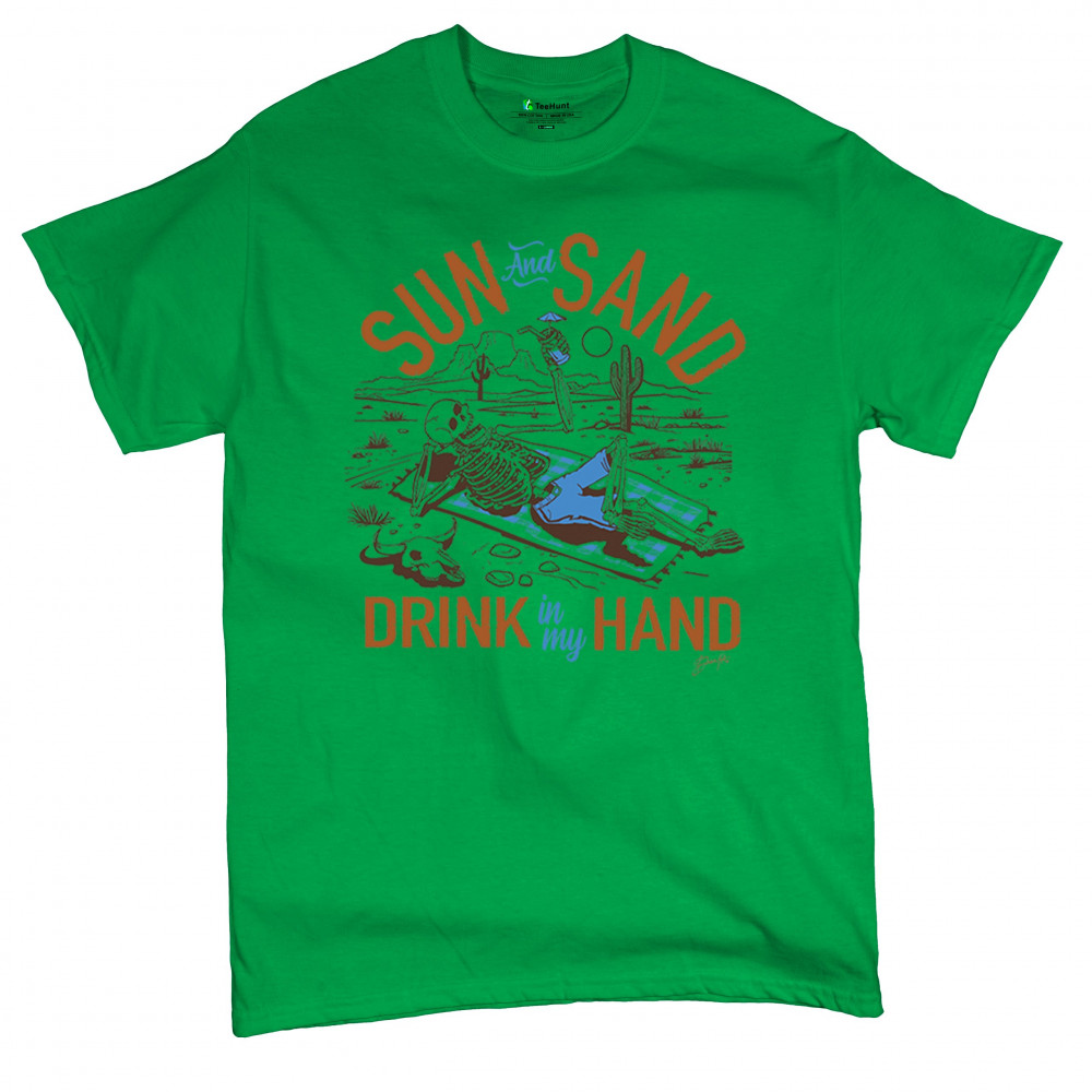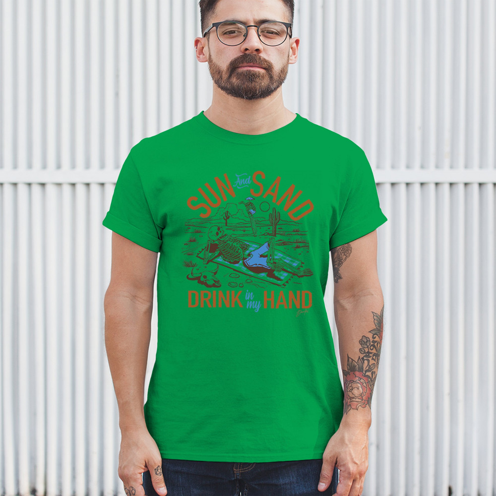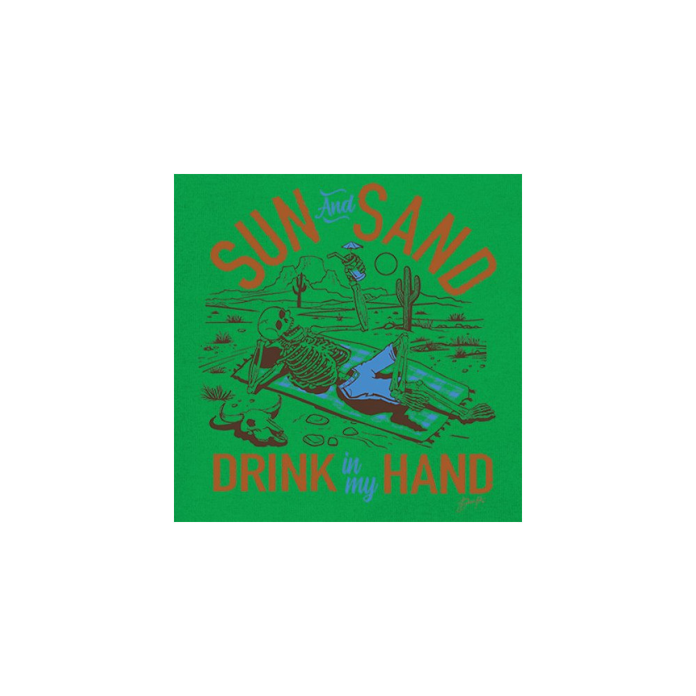Relive your beach memories with our 'Sun, Sand, and Drink in Hand' design, evoking the carefree spirit of summer days.