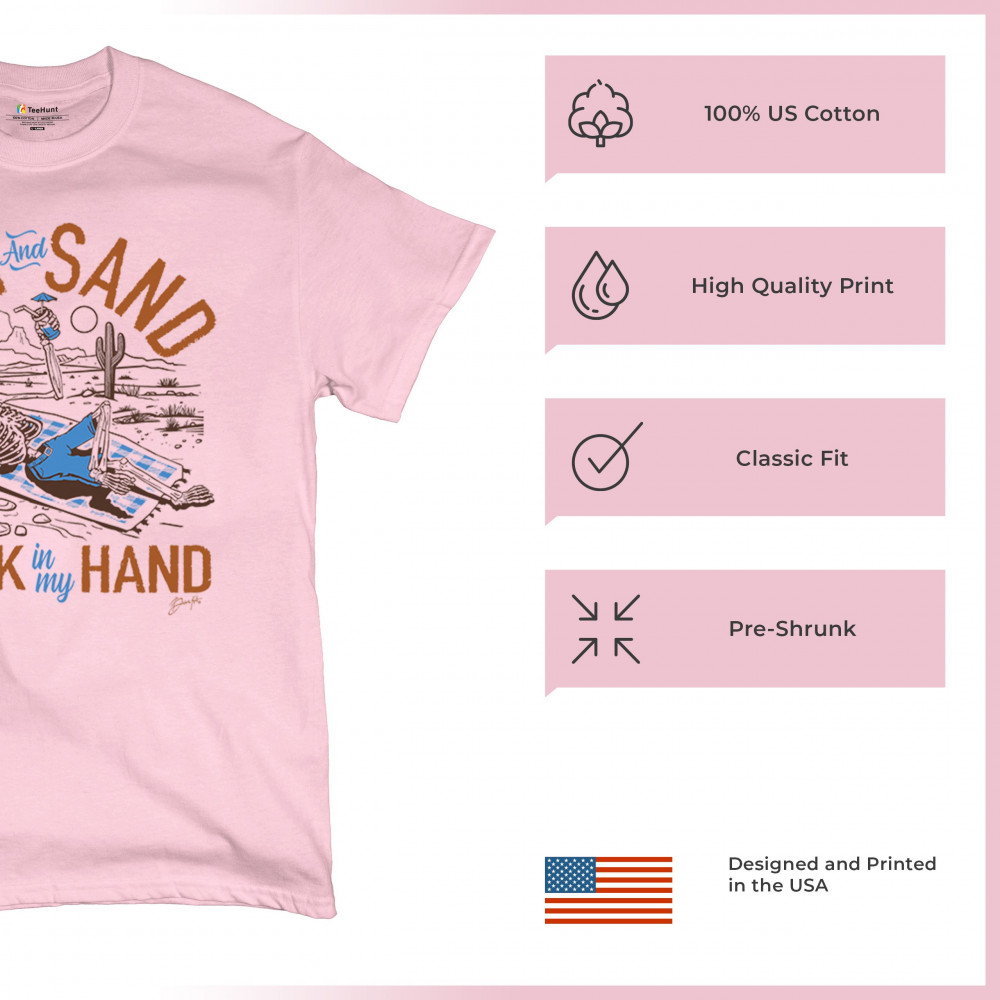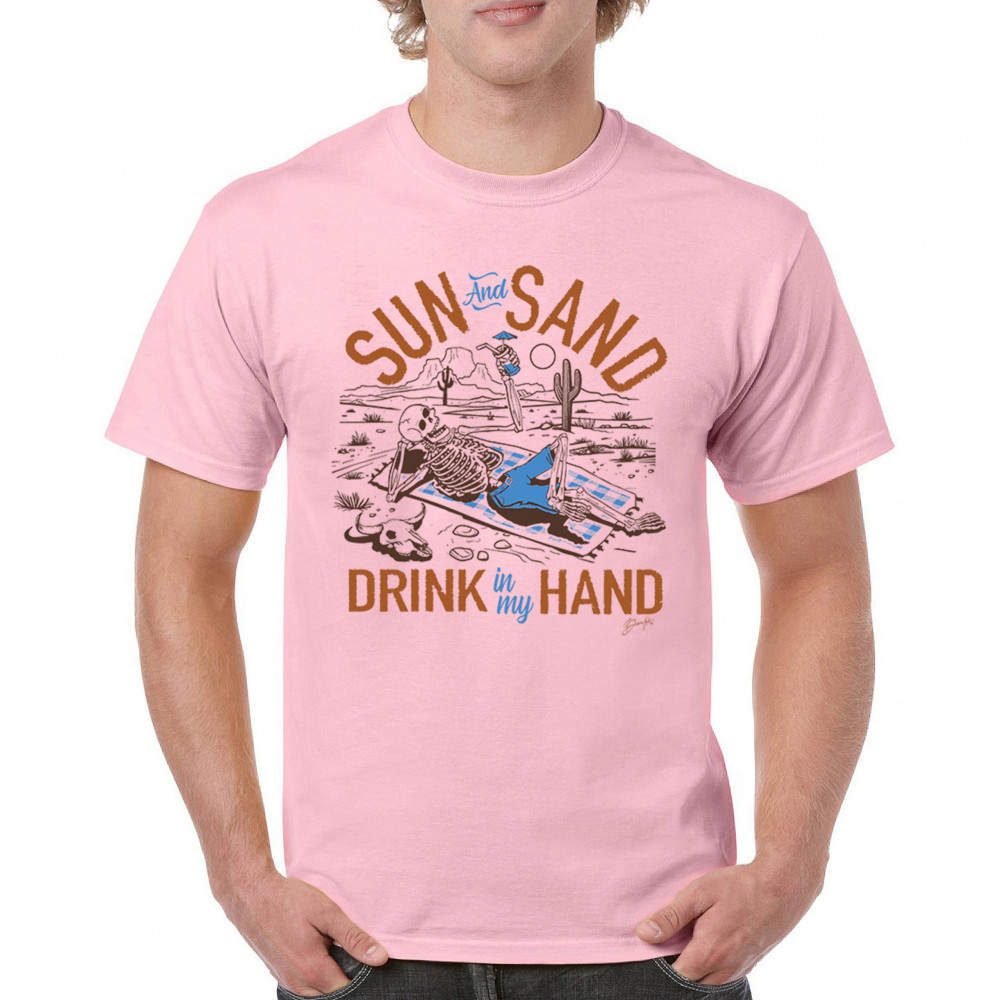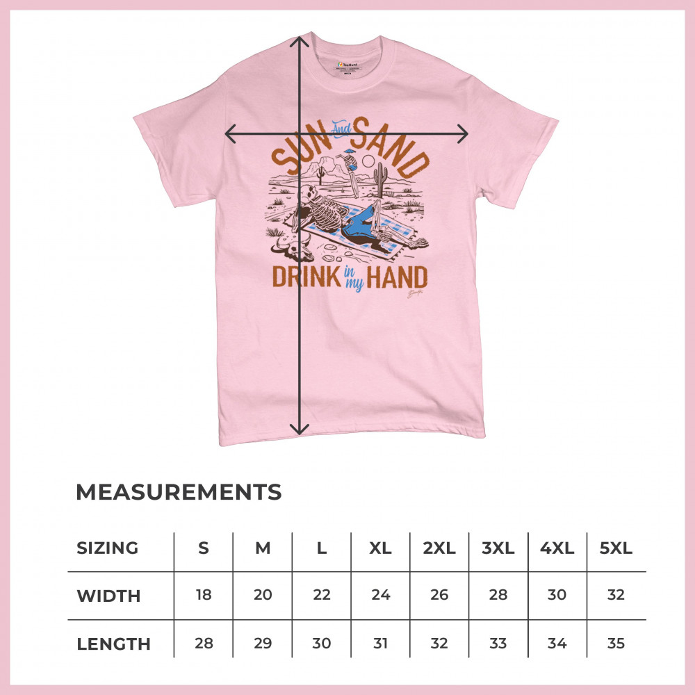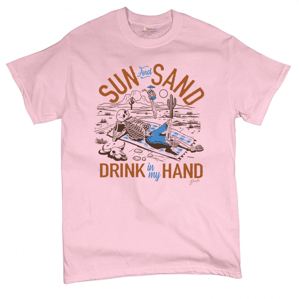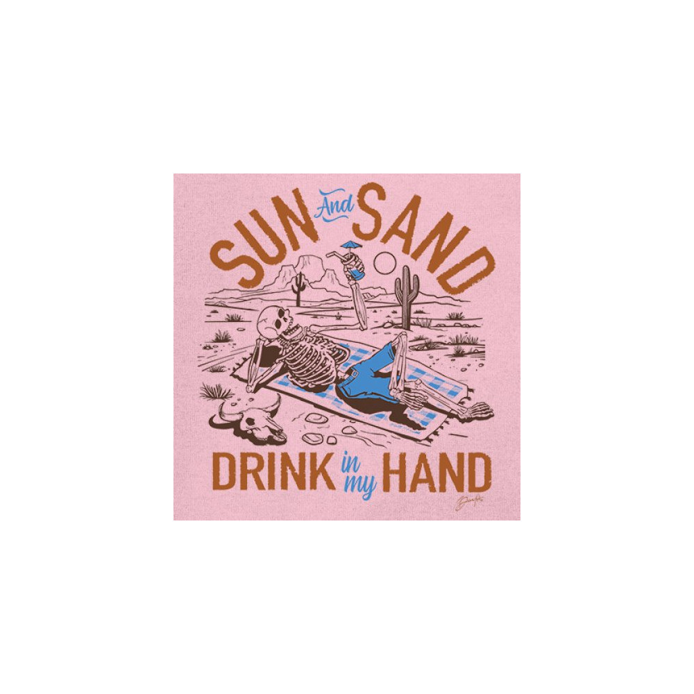 Relive your beach memories with our 'Sun, Sand, and Drink in Hand' design, evoking the carefree spirit of summer days.