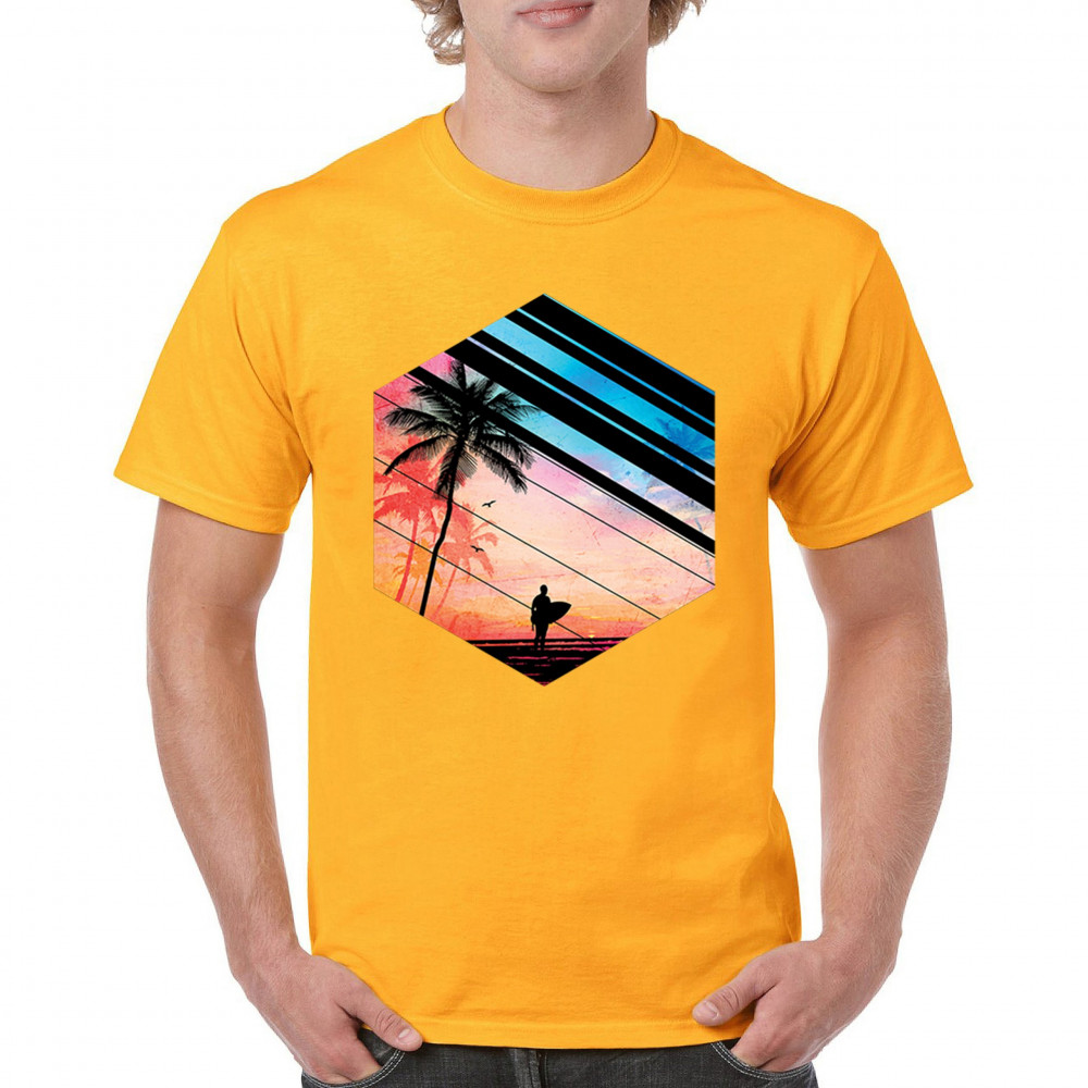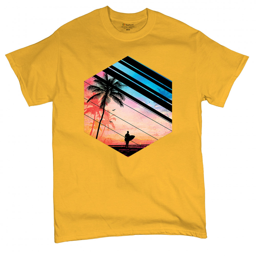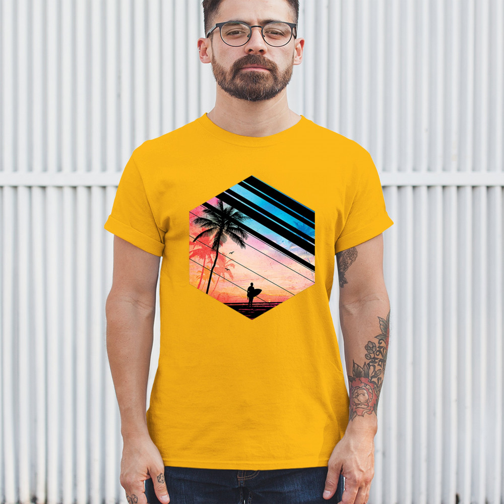 Catch the vibe of endless summer with our surf-inspired tee. Featuring silhouetted palms, warm gradients, and cool geometric shapes, it’s a visual journey from the urban grind to tropical tranquility. This tee is for the soul surfers and dreamers, made to be as enduring as the memories of your last wave. It's more than apparel—it’s a horizon of possibilities. Add this staple to your collection and let the good times roll.