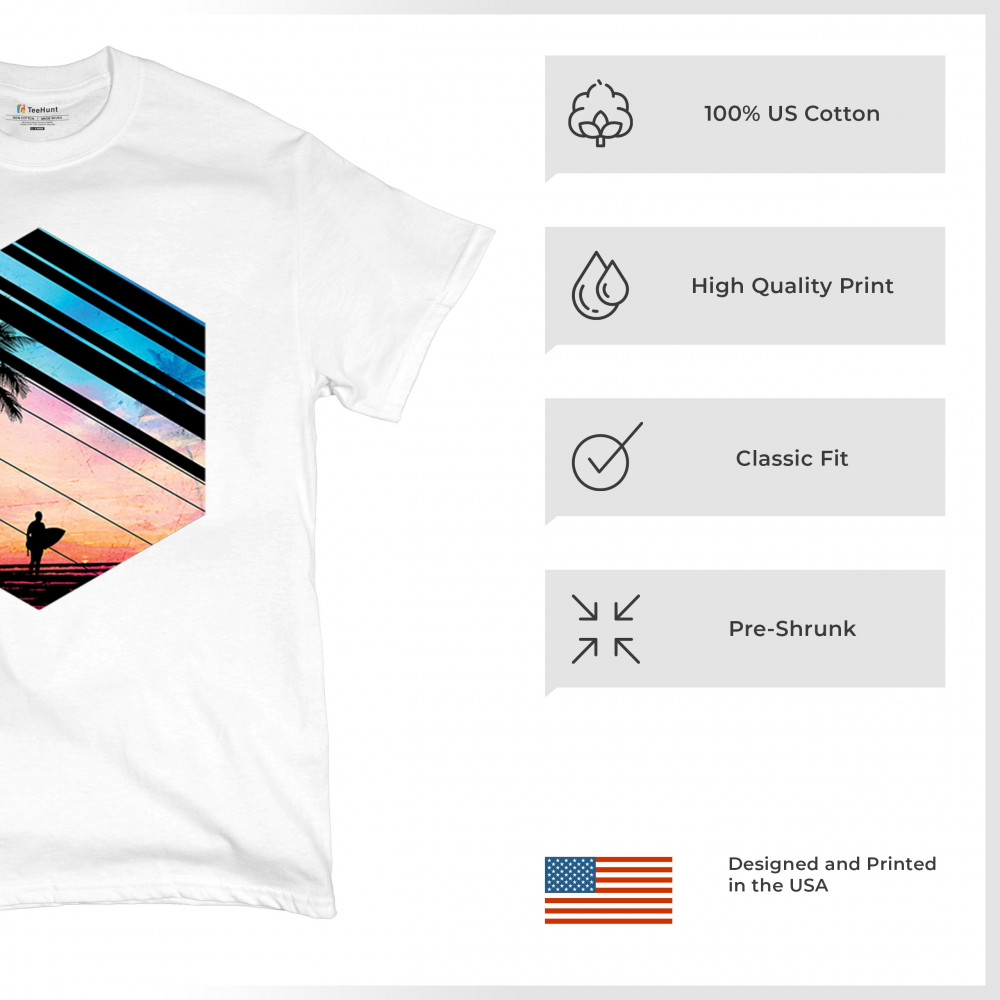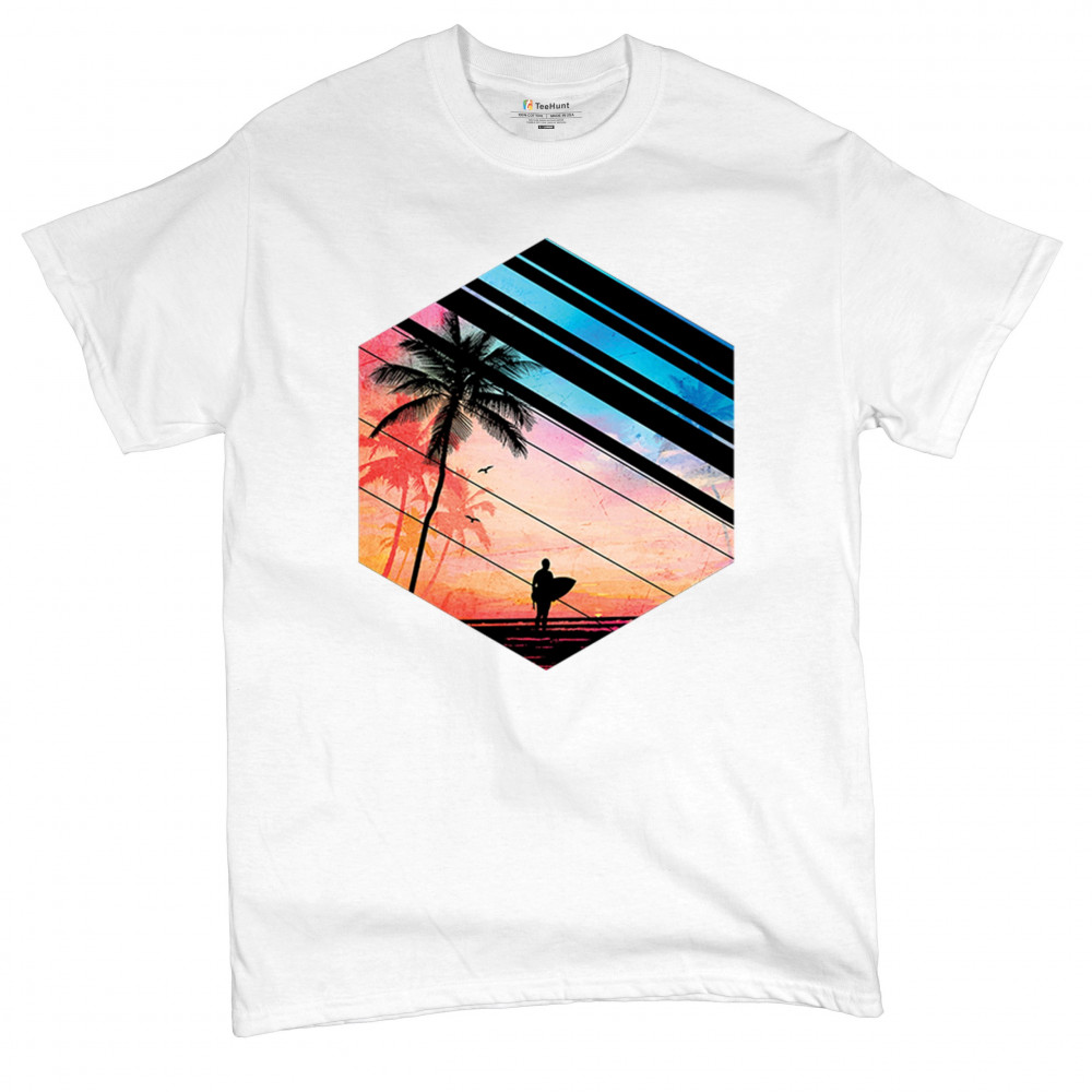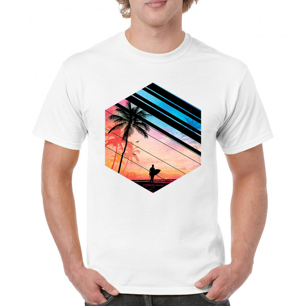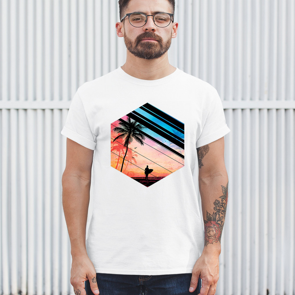 Catch the vibe of endless summer with our surf-inspired tee. Featuring silhouetted palms, warm gradients, and cool geometric shapes, it’s a visual journey from the urban grind to tropical tranquility. This tee is for the soul surfers and dreamers, made to be as enduring as the memories of your last wave. It's more than apparel—it’s a horizon of possibilities. Add this staple to your collection and let the good times roll.