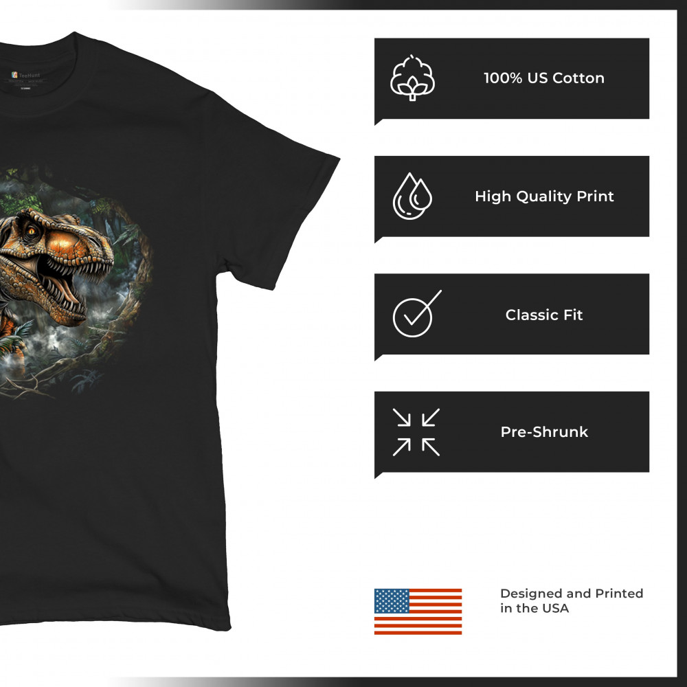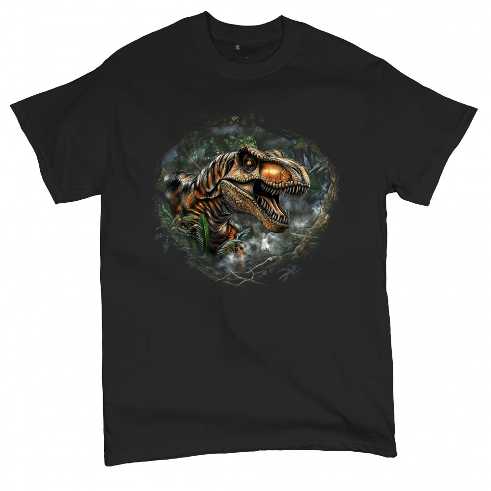 Step into the Jurassic jungle with this electrifying t rex design. With sharp teeth, rugged scales, and mist swirling through lush greenery, this tyrannosaurus roars to life. Perfect for dinosaur fans, fossil lovers, and nature explorers. Wear it to museums, theme parks, or wherever ancient beasts still rule the imagination.