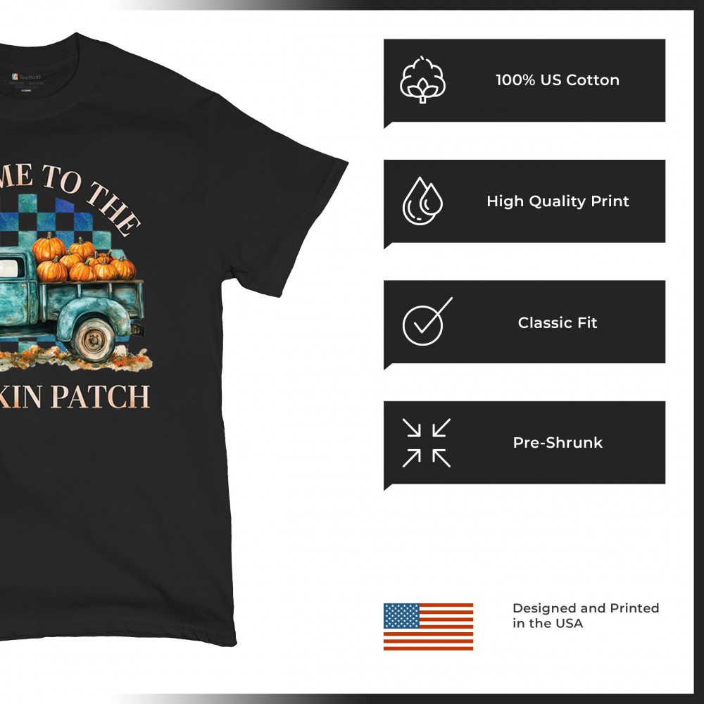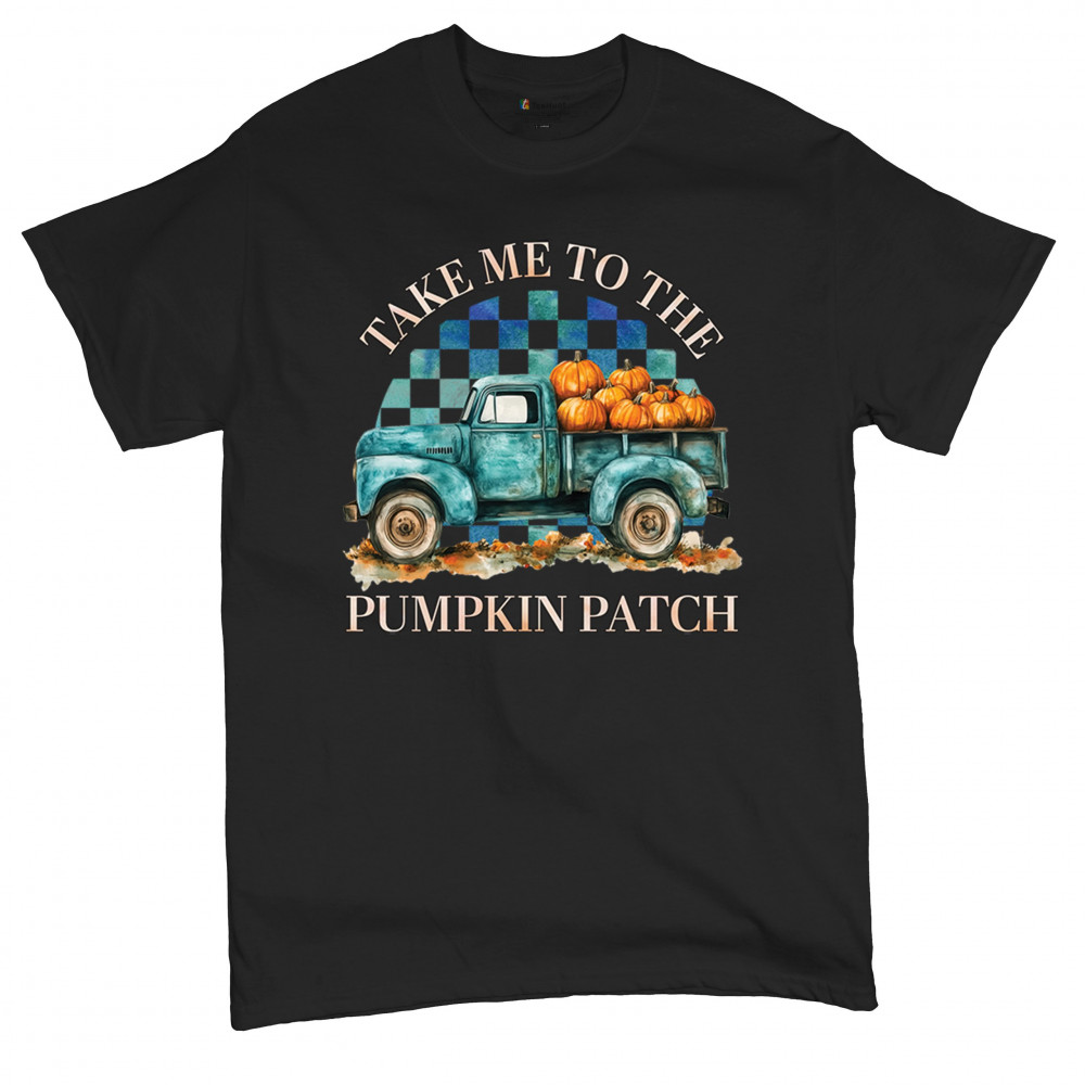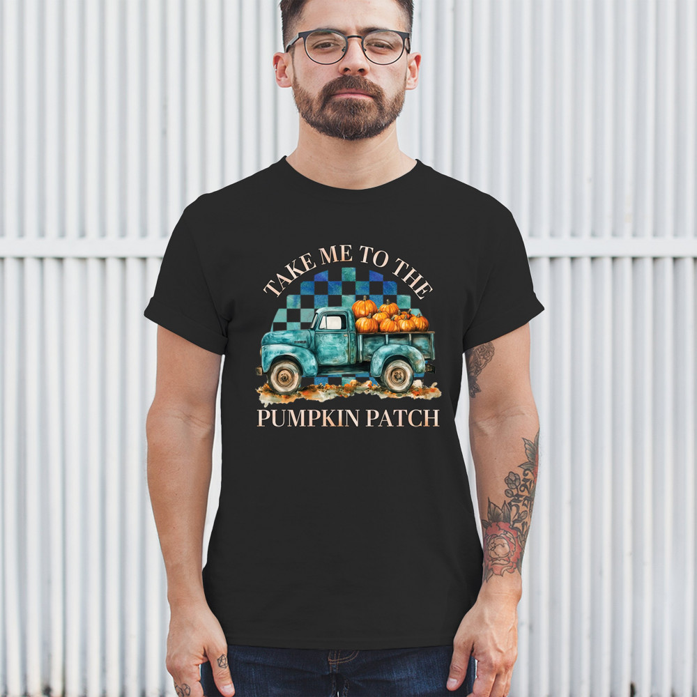 Celebrate autumn in style with the "Take Me to the Pumpkin Patch" design, featuring a vintage truck and festive pumpkins—perfect for fall lovers!