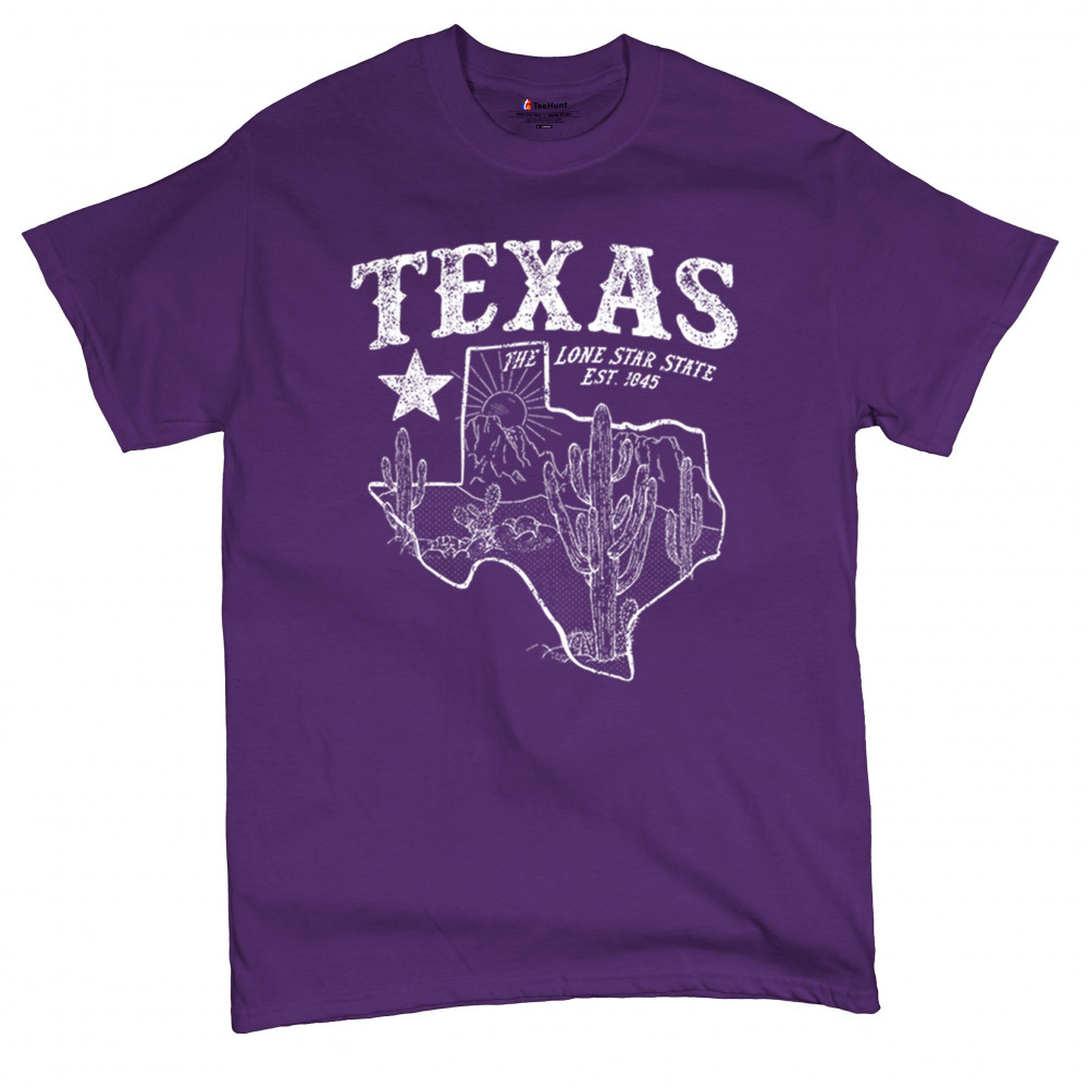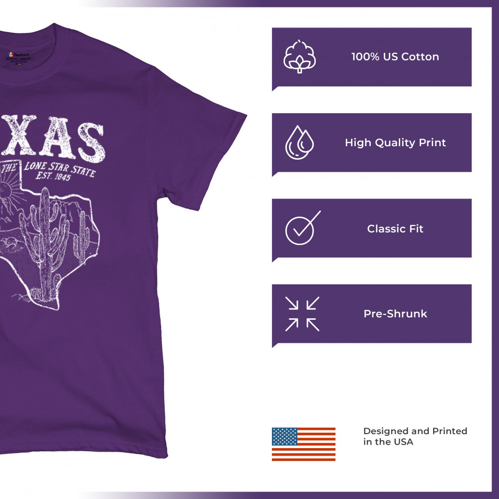 Vintage Texas pride design with cactus, mountains, Lone Star symbol, and 1845 tribute—perfect for rodeos and western events.