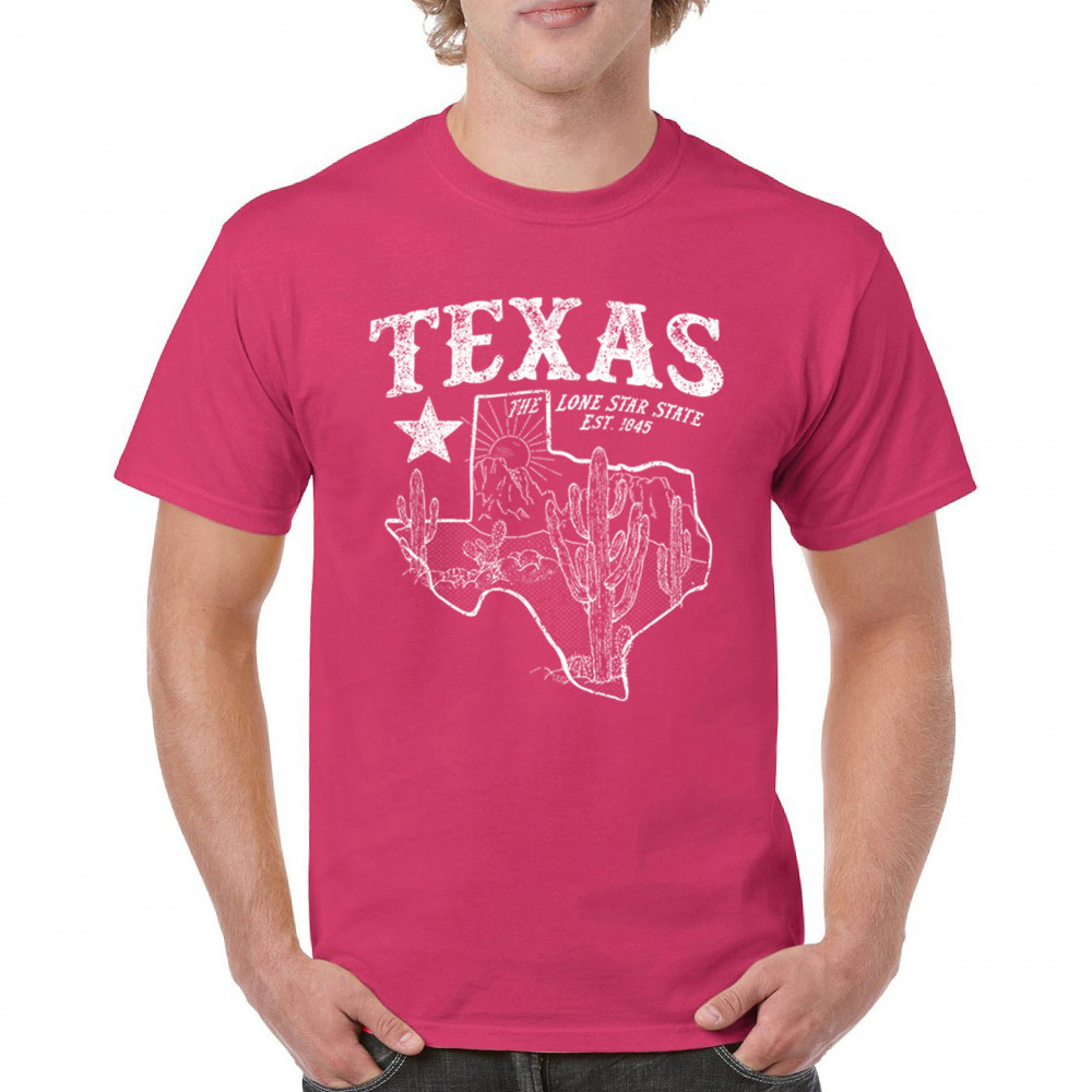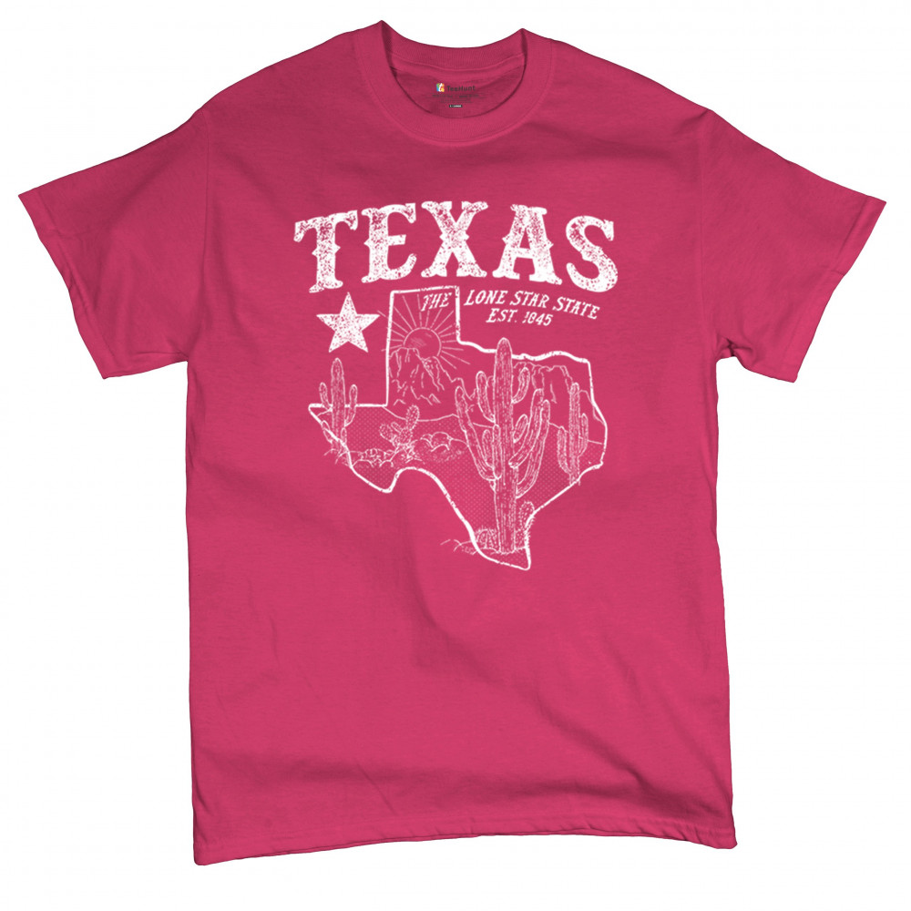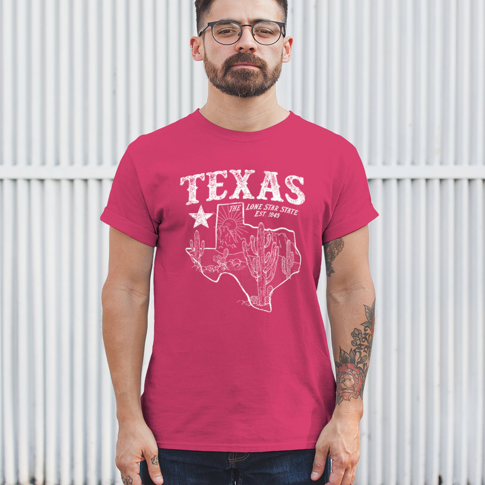 Vintage Texas pride design with cactus, mountains, Lone Star symbol, and 1845 tribute—perfect for rodeos and western events.