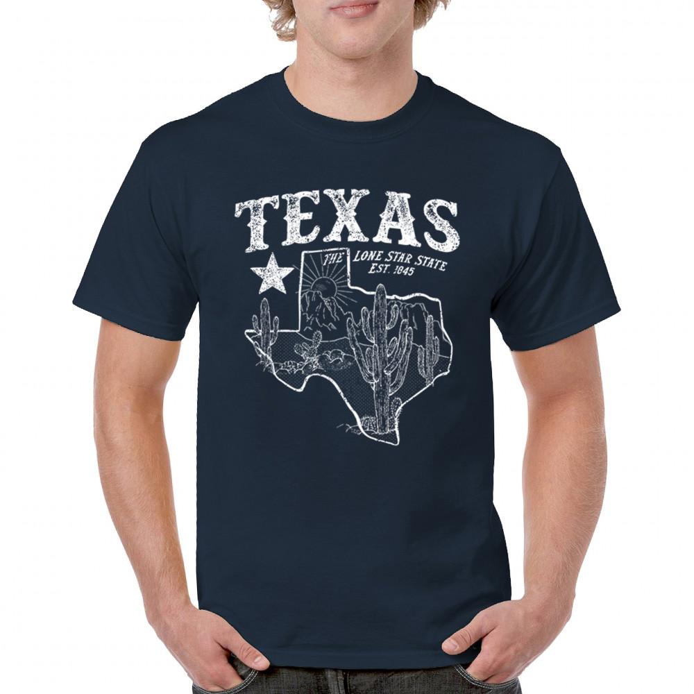 Vintage Texas pride design with cactus, mountains, Lone Star symbol, and 1845 tribute—perfect for rodeos and western events.