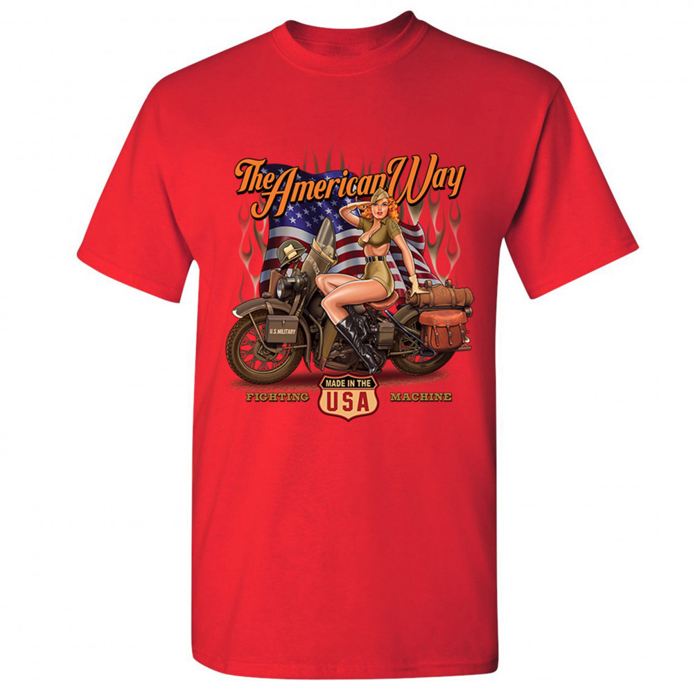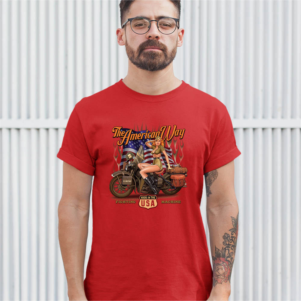 A print featuring a beautiful pin-up girl in leather boots sitting on a U.S. military motorcycle. There is the American Flag in the background and the words "The American Way" above it. At the bottom of the picture there is a shield which says: "made in the USA". "Fighting Machine" is written under the motorcycle's wheels. A great choice for a motorcycle enthusiast.