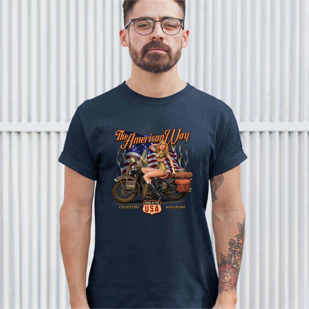 A print featuring a beautiful pin-up girl in leather boots sitting on a U.S. military motorcycle. There is the American Flag in the background and the words "The American Way" above it. At the bottom of the picture there is a shield which says: "made in the USA". "Fighting Machine" is written under the motorcycle's wheels. A great choice for a motorcycle enthusiast.