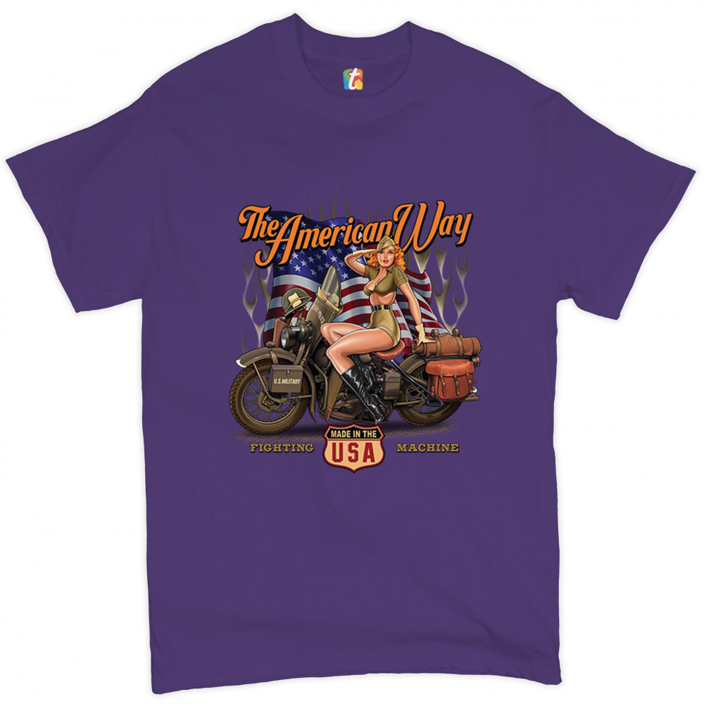 A print featuring a beautiful pin-up girl in leather boots sitting on a U.S. military motorcycle. There is the American Flag in the background and the words "The American Way" above it. At the bottom of the picture there is a shield which says: "made in the USA". "Fighting Machine" is written under the motorcycle's wheels. A great choice for a motorcycle enthusiast.